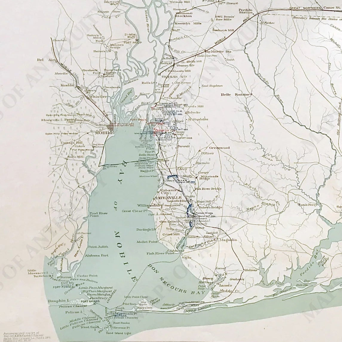 Antique lithograph by Julius Bien & Co published in the Atlas to Accompany the Official Records of the Union and Confederate Armies published under the direction of the Hon. Daniel S. Lamont, Secretary of War, 1893. The atlas was published as a companion piece to the Official Records of the American Civil War. It contains maps and other images derived from materials generated by both Union and Confederate military personnel during the American Civil War. The atlas was printed in 35 parts between 1891 and 1895. Printed color indicates topography and Union or Confederate locations. Great map of the Gulf of Mexico including Mobile Bay, Pensacola Bay, Choctawhatchee Bay, etc with lines showing the routes of the Union forces. Very good condition with mild image transfer, a few minor spots/stains and a touch of foxing, and some minor wear to the paper edges. Measures approx. 16 x 27 inches to the outer border lines.