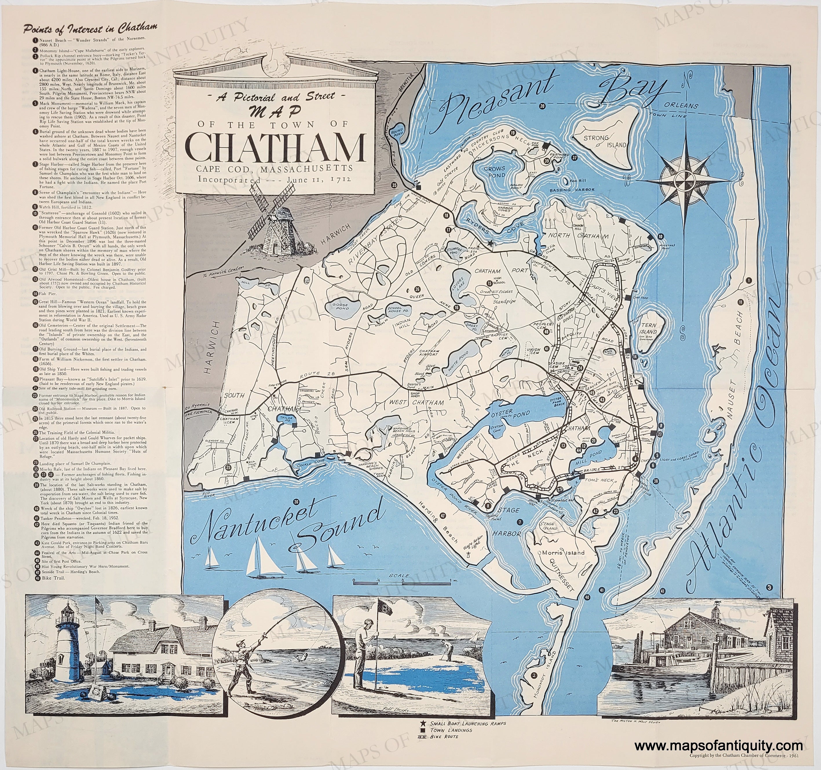 Original printed-color map from 1961 of the town of Chatham, MA, published by the town of Chatham with map and art by Robert Brooks. This is a folding map with the map and points of interest on one side and a lot of local information on the verso. The images on the bottom feature one of the lighthouses, fishing, golfing, and the fish pier. Good overall antique condition with folds as issued and light overall toning. Some wear along the folds and a small hole at some of the fold intersections. Measures approx. 18.5 x 20 inches to the paper edges.