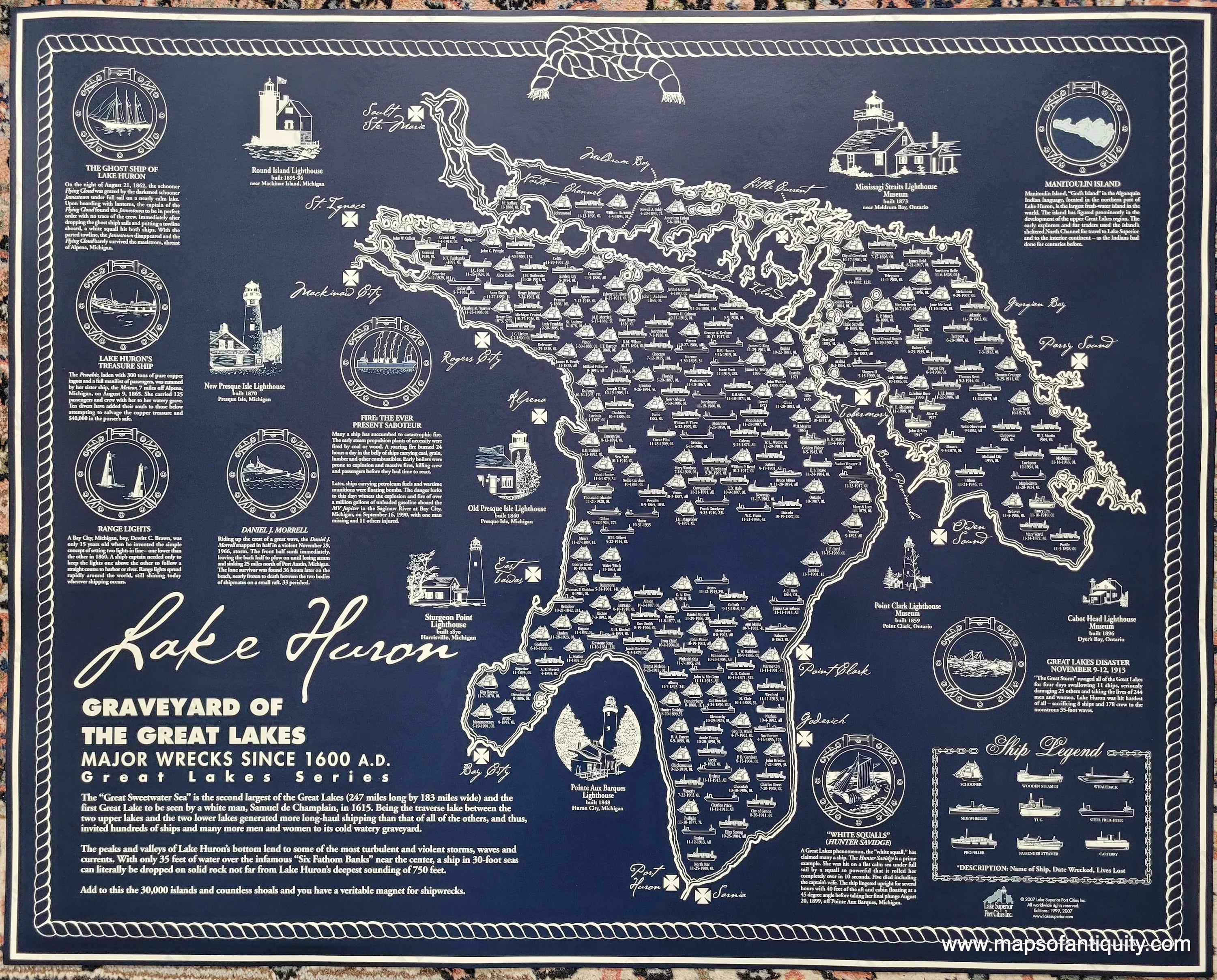 Lake Huron, Graveyard of the Great Lakes. Modern map showing major shipwrecks since 1600 around Lake Huron. With names of the ships, dates of the wrecks, and lives lost (if known). Also features other illustrations, lighthouses, and historical information. Blueprint style in a navy color with white design. Nautical rope border. Prints with shipwrecks in other Great Lakes also available. Measures approx. 29.5 x 23.5 inches to the page edges. Printed on poster paper with a semi-gloss surface.