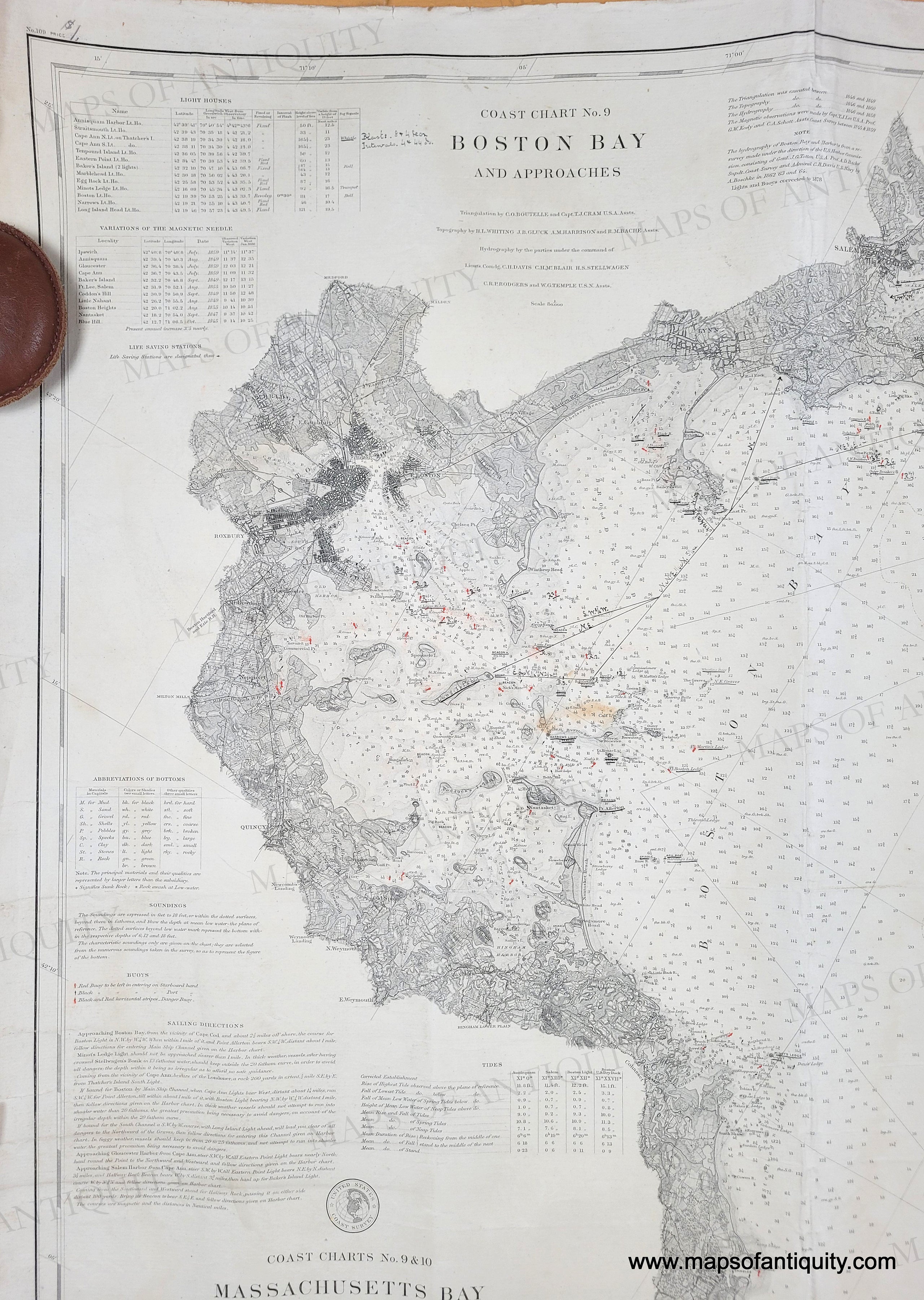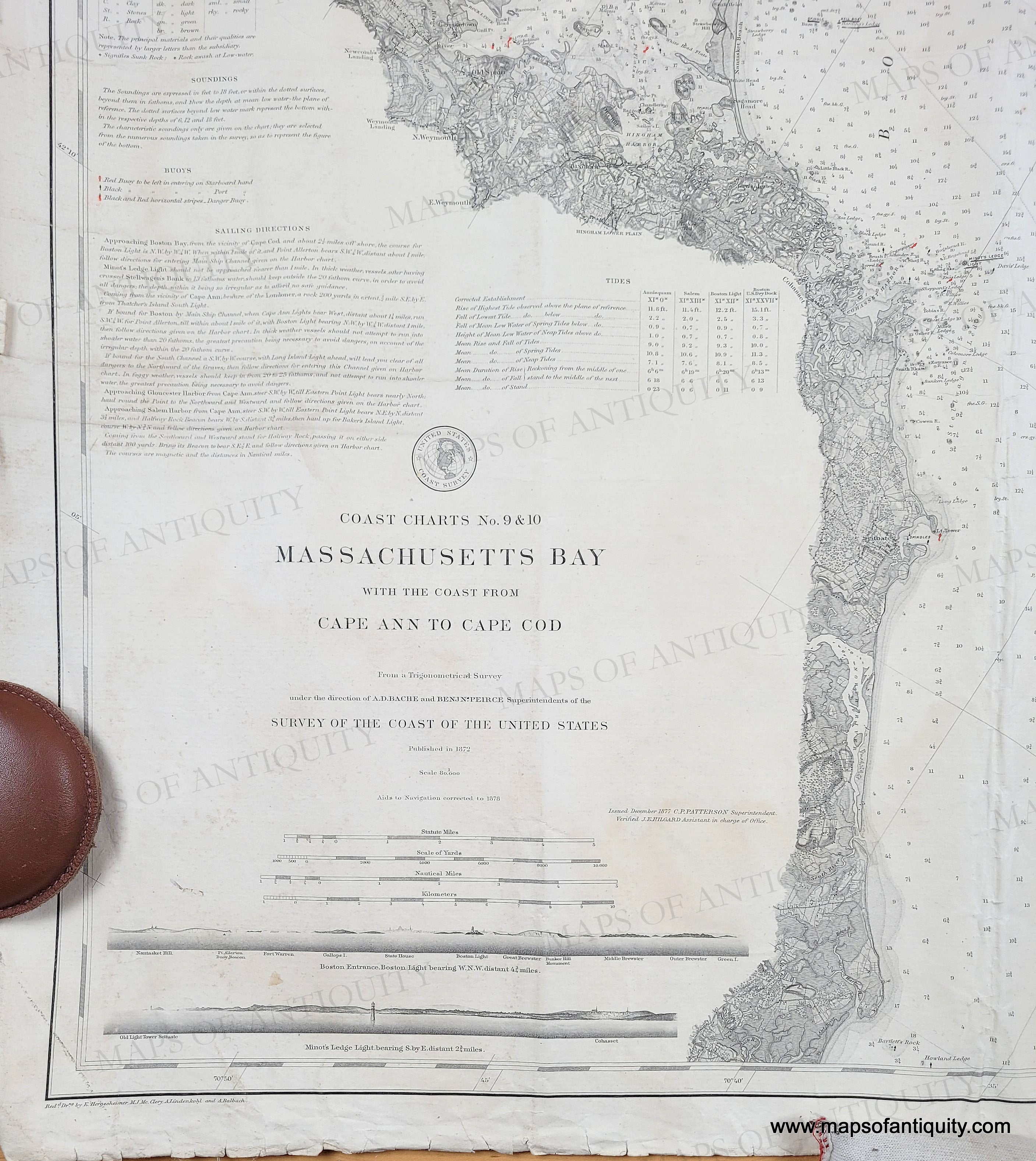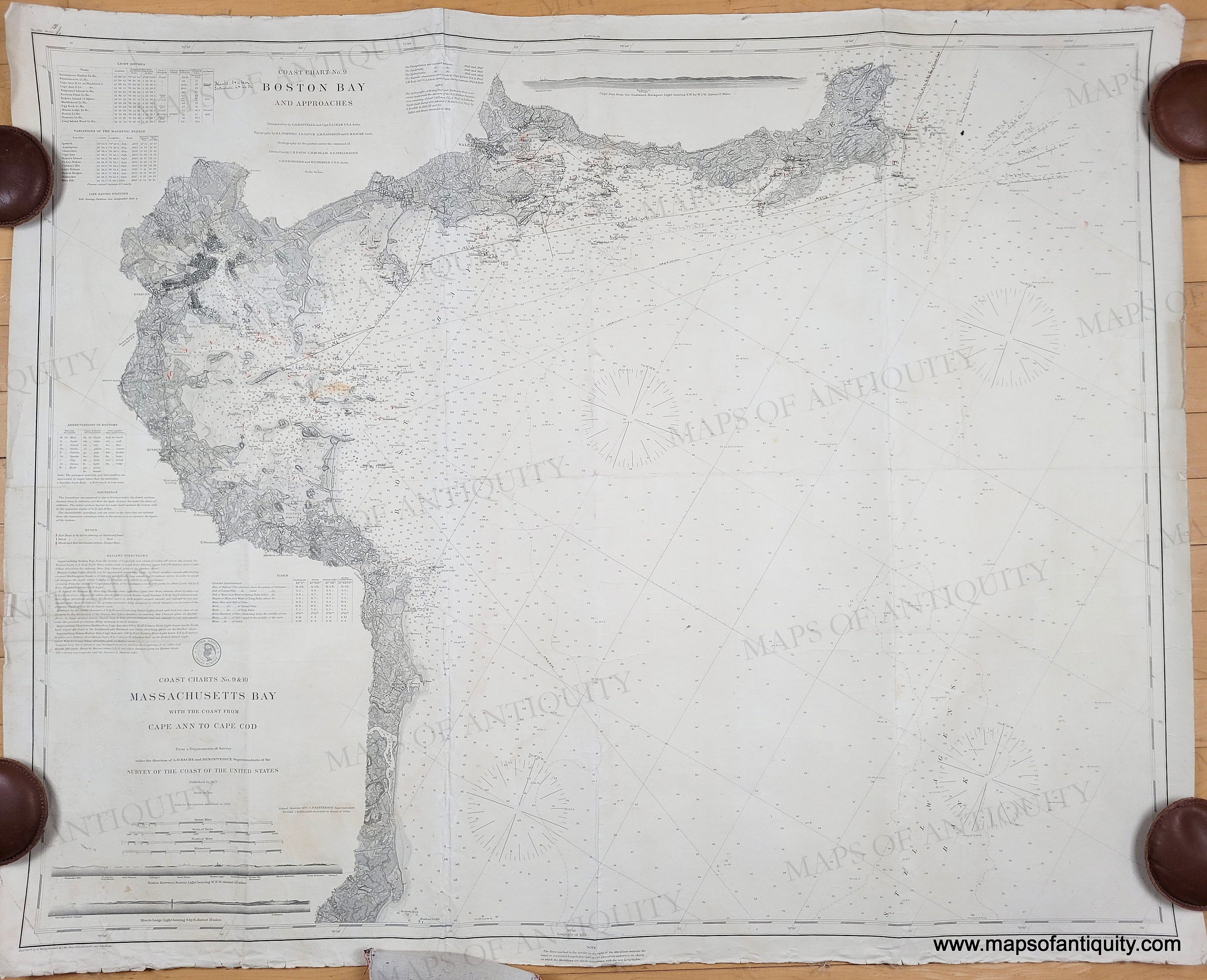 Antique chart, published by the U.S. Coast Survey, 1872 with additions to 1878, restored. Shows the area from Cape Ann to Marshfield with Salem, Nahant, Boston around the time of the Back Bay fill, Boston Harbor, Hingham Bay, Cohasset, Scituate, North River, and more. Shows soundings, and information on tides, light houses, buoys, tidal information. Mostly black and white with hand-colored marks for lighthouses and light buoys. This is part of a two chart set that covers Massachusetts Bay. Fair to good overall antique condition overall, with creases, some wrinkling, some notes from a previous owner in pen. Backed with linen. Approx. 30.75 x 38.5 inches. Priced as-is. Another may be available in restored condition: NAU177