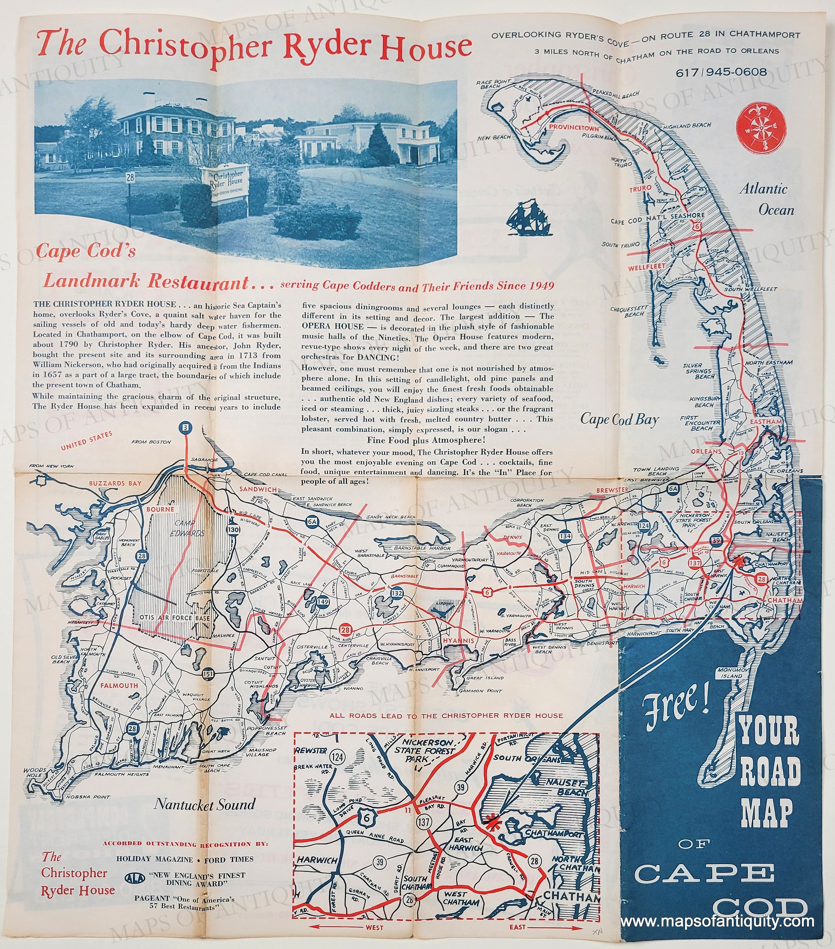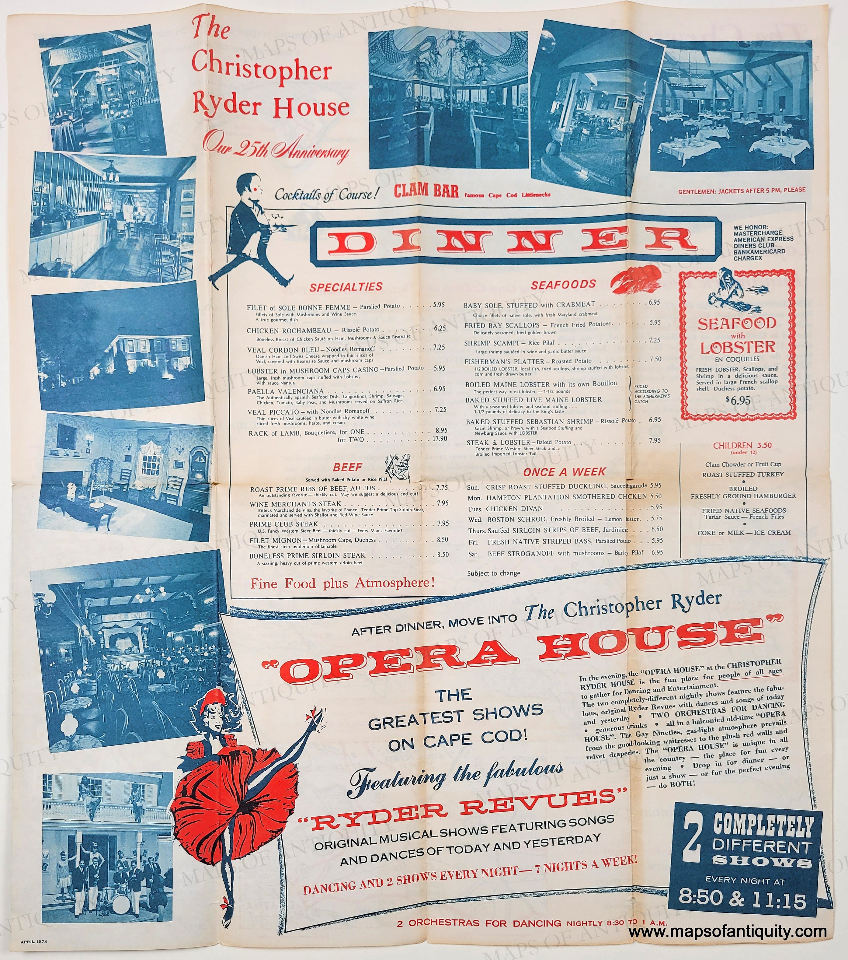 Vintage menu for the Christopher Ryder House in Chatham MA, a beloved location that closed in 1983. This menu is dated April 1974 in the lower left corner. Advertises the "Opera House" featuring the fabulous "Ryder Revue" with songs, dances, skits, etc. There is a map of Cape Cod on the back side. Good condition with toning that is darker along the folds. Vibrant red and blue colors. Measures approx. 18.25 x 16 inches to the paper edges.
