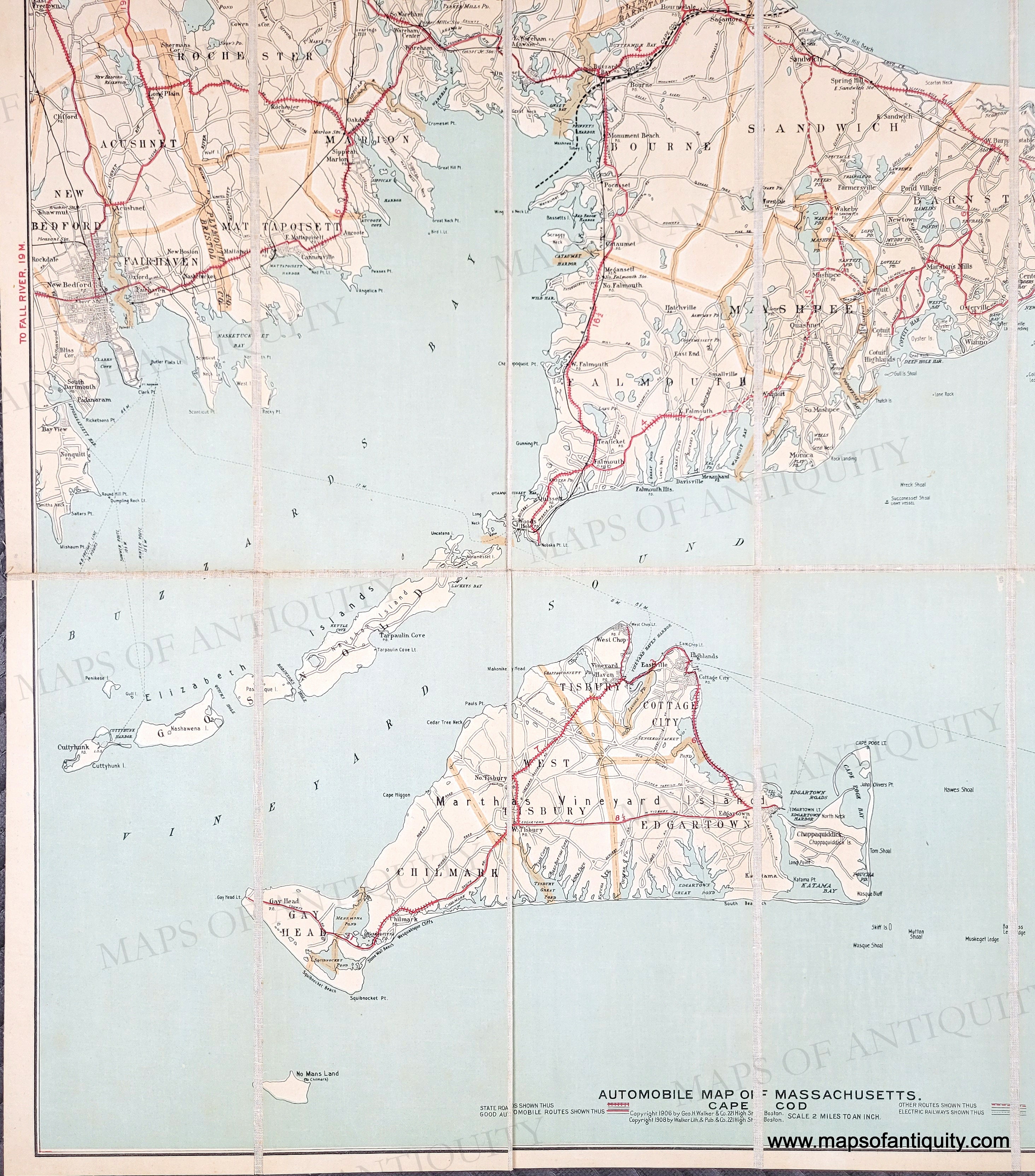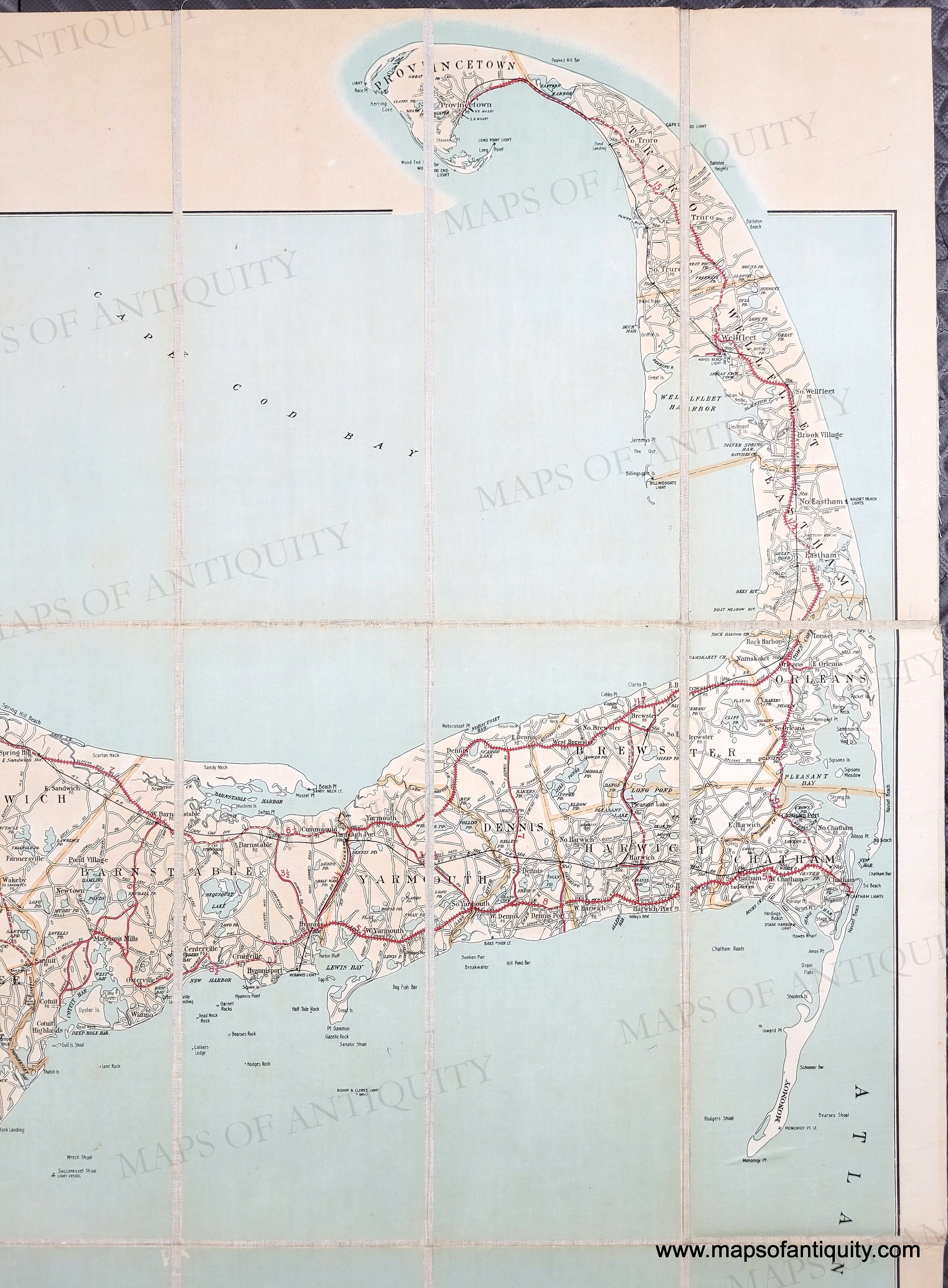 Antique 1908 edition of the Walker's road map of Cape Cod and the Islands. This map includes Southeastern Massachusetts from New Bedford to Kingston, showing automobile roads, including today's Route 6A and 28, state roads, other roads, and railroads. Automobiles were quite new at this time and most of the existing roads were for horses and carriages. The bicycle boom of the late 1800s had resulted in the paving of some roads, but most were still dirt and probably rutted from carriage wheels, which is why early road maps usually indicated the better roads. The enthusiasm for automobiles sped up the paving of roads, but maps like this were necessary to identify the best roads to avoid damaging your new vehicle. The map was published by George Walker Co. as a folding map, backed on linen. Good antique condition with uneven toning resulting upper sheets being slightly darker, very mild spots/stains, minimal wear along the folds and fabric between sheets is in good condition although with some spots. Measures approx. 31 x 30 to the edges, and 27 x 29 inches to the neatline with Provincetown extending over the boundary (this invites some little jokes: Provincetown cannot be contained or restrained... they are thinking outside of the box... etc. Sorry, I couldn't help myself).