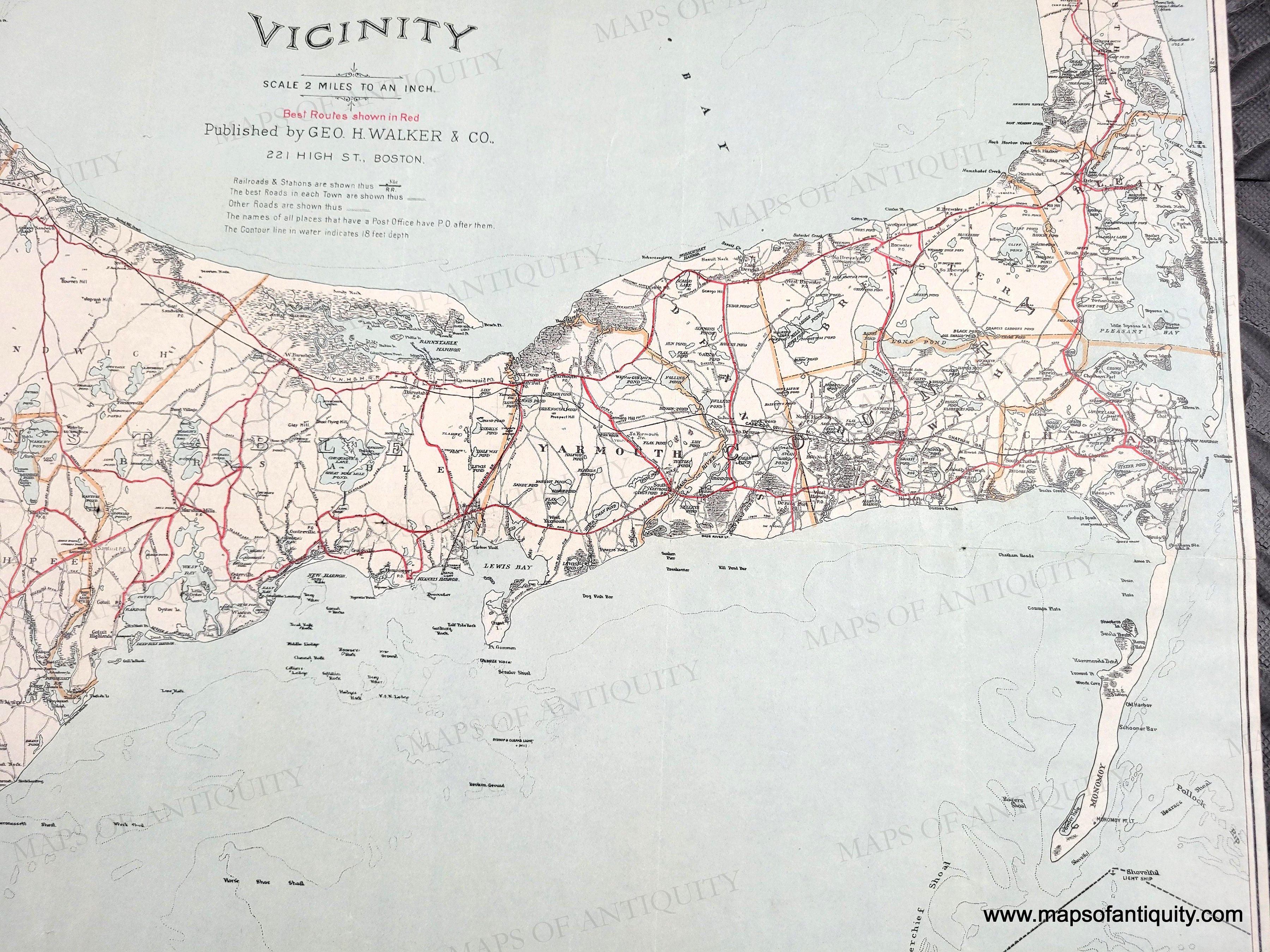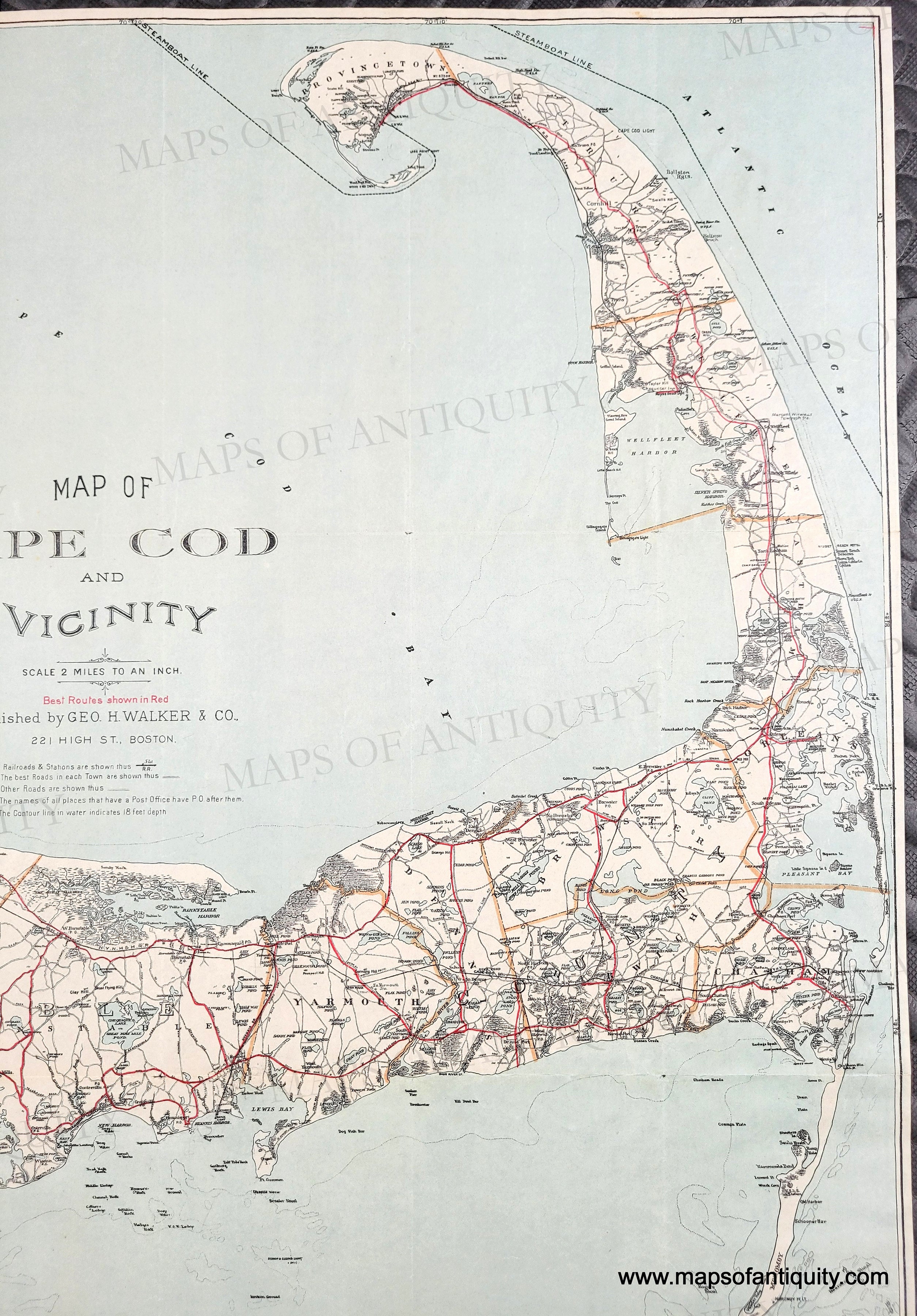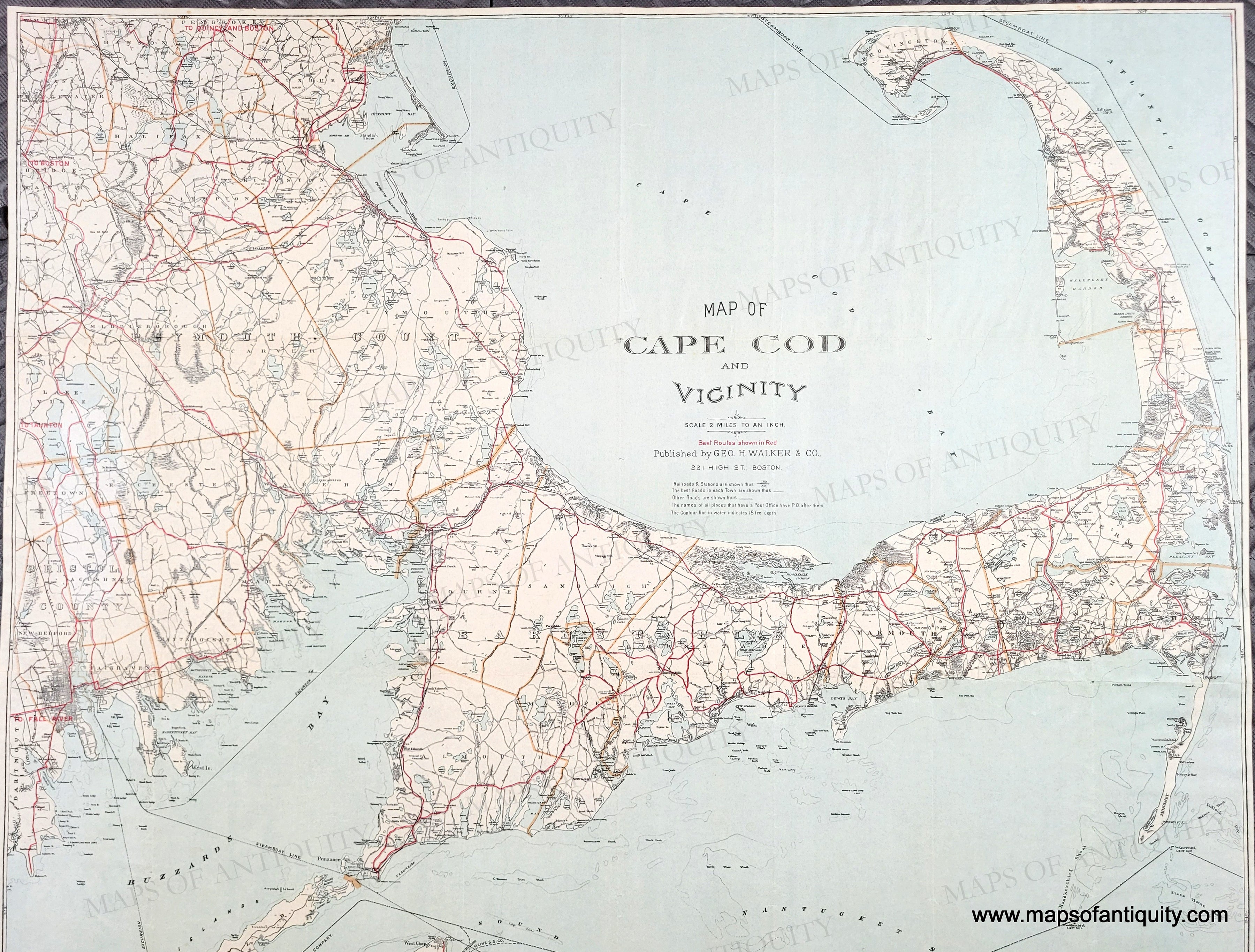 Antique map of Cape Cod, Nantucket, and Martha's Vineyard, published by George H. Walker & Co., 1907. This collectible and desirable map was issued as a folding map and shows the best routes in red, as well as other roads, steamship routes, railroads, villages, towns, rivers, marshes, lakes, ponds, and more. Finding this larger edition map in such good condition is quite rare. It includes much of Plymouth and Bristol counties, from Dartmouth and New Bedford to Duxbury and Provincetown to Nantucket and Martha's Vineyard. Lithograph printing with slight offsetting of the red color. Good to very good antique condition with a few tiny spots mostly at the paper edges, some slight wrinkling. Tight margins as issued. Measures approx. 30 x 27.75 inches to the neatline.