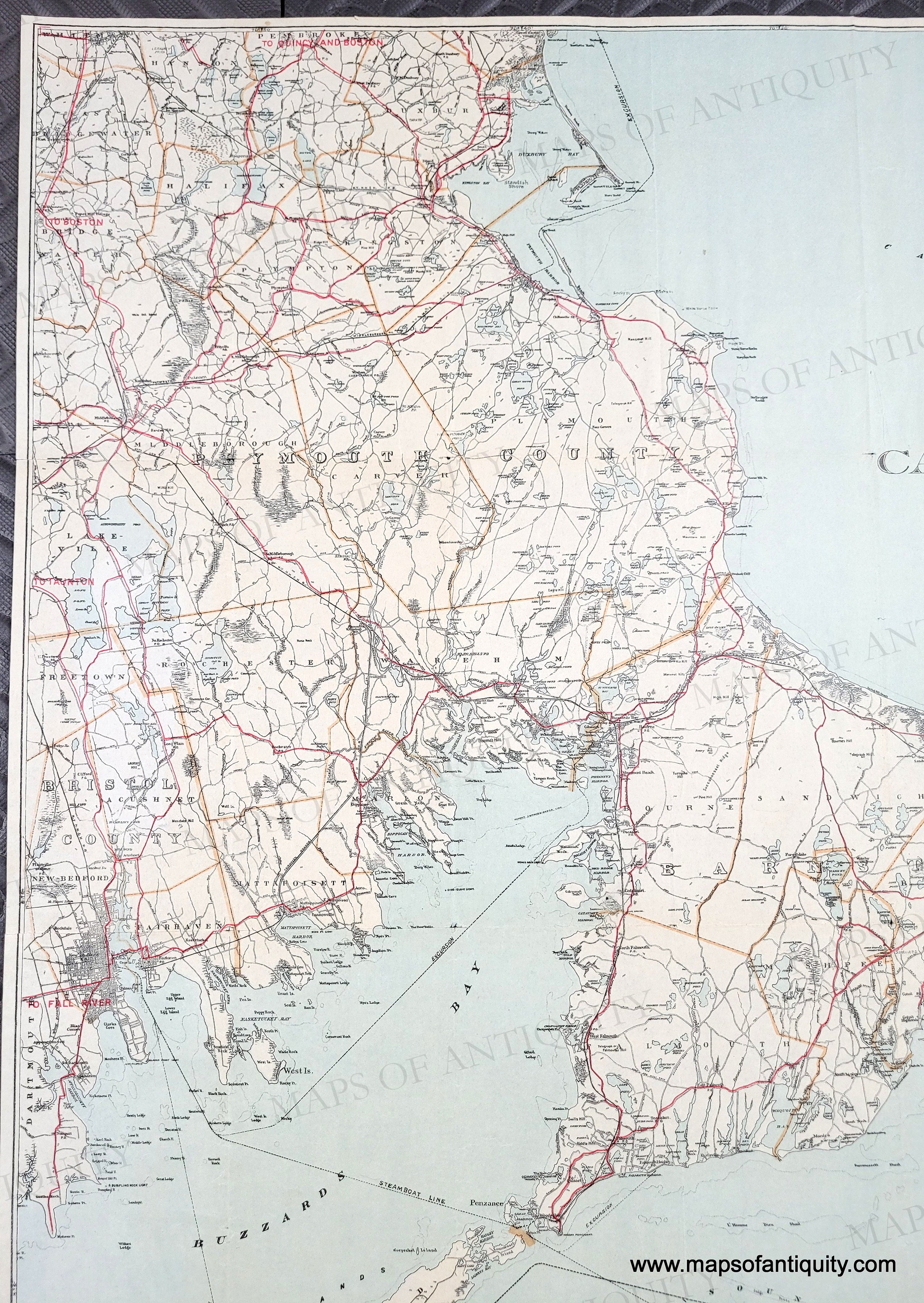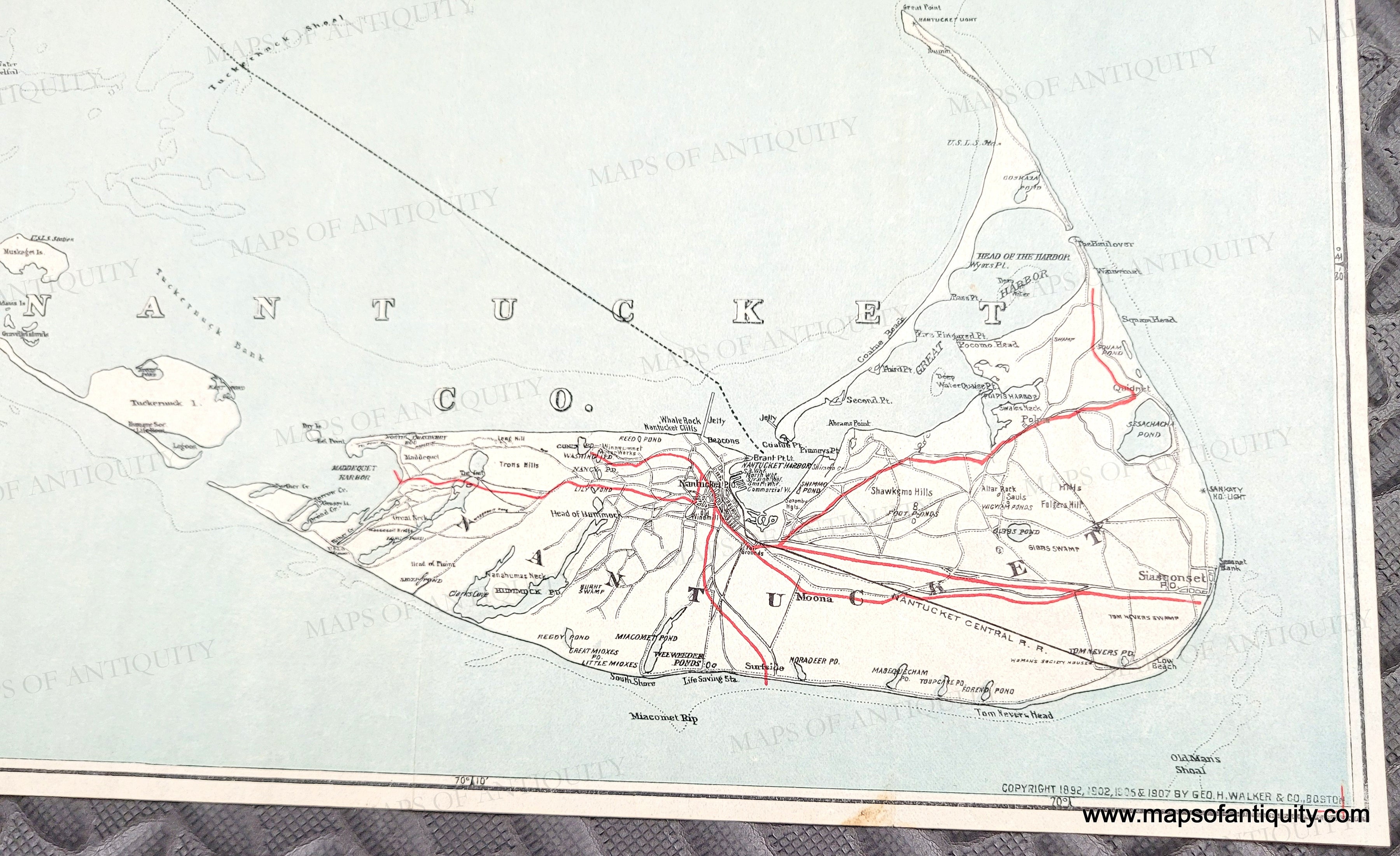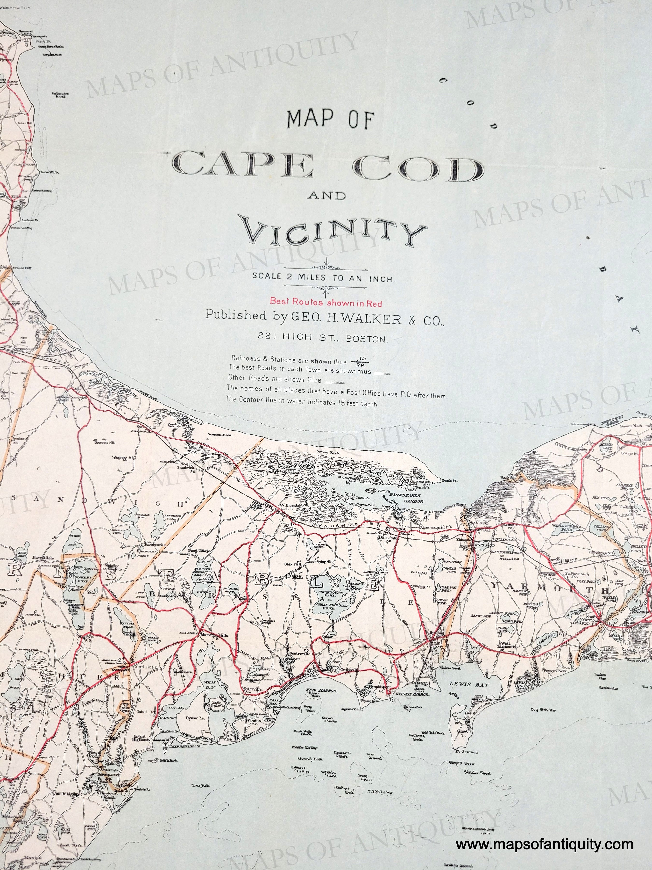 Antique map of Cape Cod, Nantucket, and Martha's Vineyard, published by George H. Walker & Co., 1907. This collectible and desirable map was issued as a folding map and shows the best routes in red, as well as other roads, steamship routes, railroads, villages, towns, rivers, marshes, lakes, ponds, and more. Finding this larger edition map in such good condition is quite rare. It includes much of Plymouth and Bristol counties, from Dartmouth and New Bedford to Duxbury and Provincetown to Nantucket and Martha's Vineyard. Lithograph printing with slight offsetting of the red color. Good to very good antique condition with a few tiny spots mostly at the paper edges, some slight wrinkling. Tight margins as issued. Measures approx. 30 x 27.75 inches to the neatline.