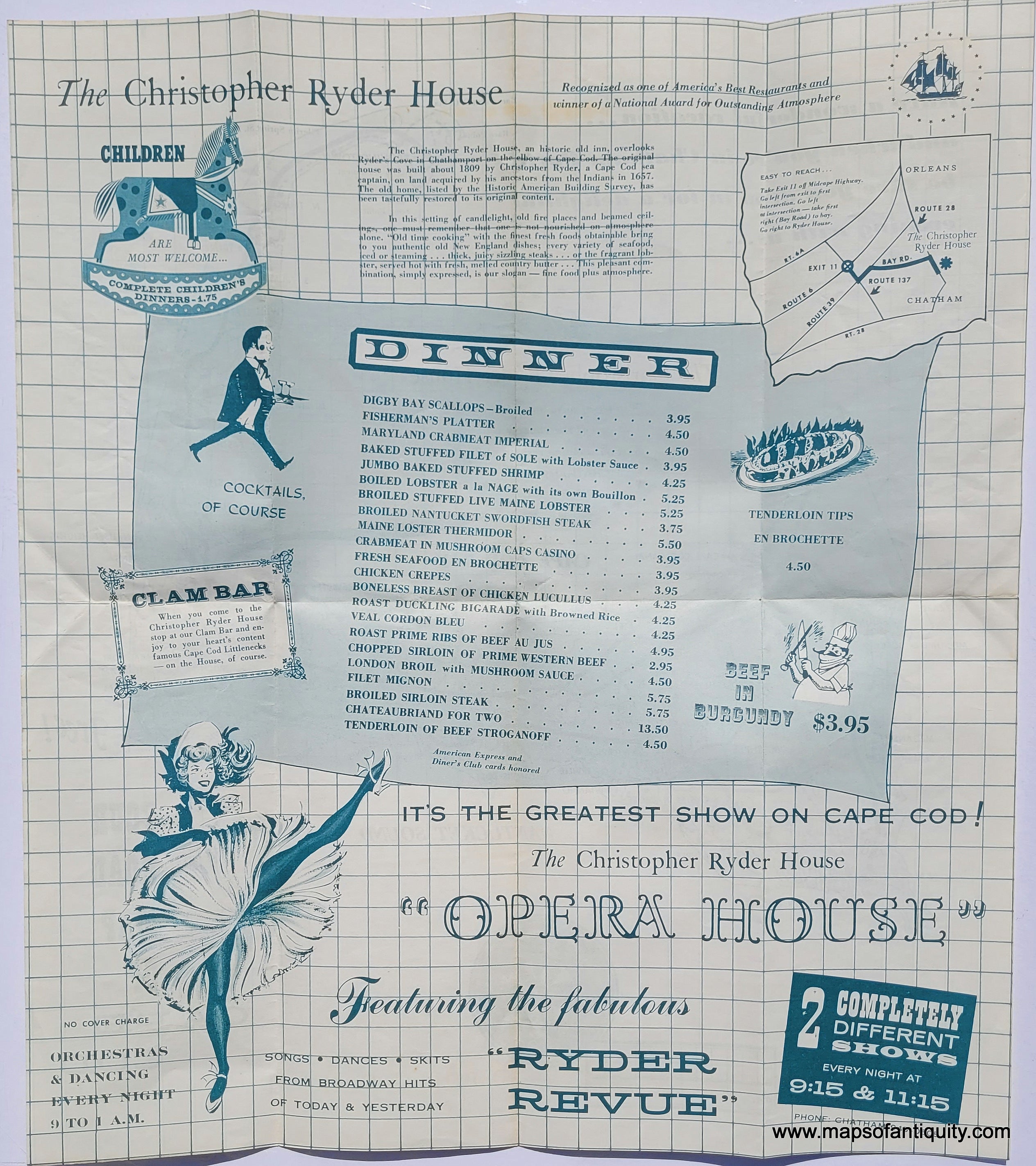 Vintage menu for the Christopher Ryder House in Chatham MA, a beloved location that closed in 1983. We estimate this menu to be circa 1960s. Advertises the "Opera House" featuring the fabulous "Ryder Revue" with songs, dances, skits, etc. There is a map of Cape Cod on the back side. Measures approx. 18.25 x 16 inches to the paper edges.