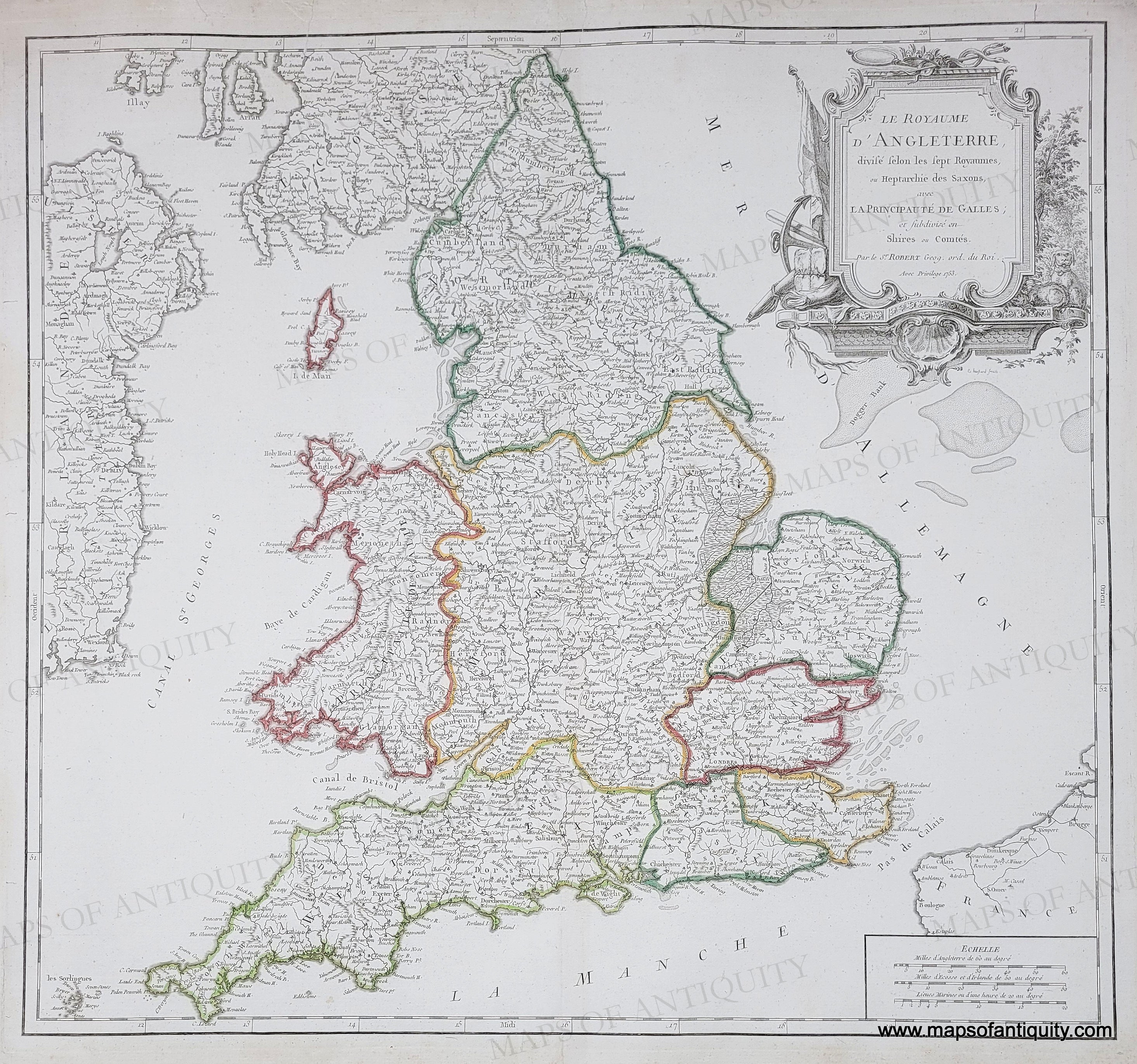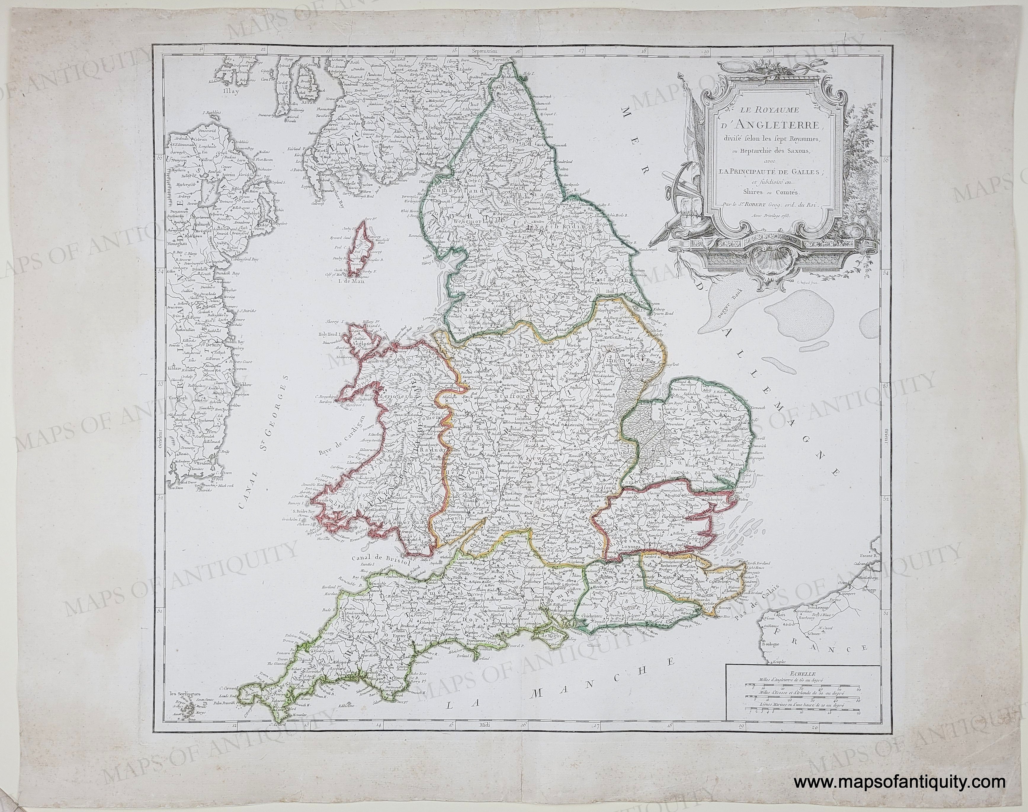 Antique map of England and Wales by Sir Robert de Vaugondy, 1753. The title translates to "The Kingdom of England, divided according to the seven Kingdoms or Heptarchy of the Saxons, with the Principality of Wales; and subdivided into Lords or Earls." The seven kingdoms are: East Anglia, Essex, Kent, Mercia, Northumbria, Sussex, and Wessex. This map has original hand-coloring, shows cities, towns, villages, rivers, etc. Very good restored condition with some signs of age at the paper edges that can be hidden with a mat when framing. Measures approx. 19 x 20 inches to the neatline.