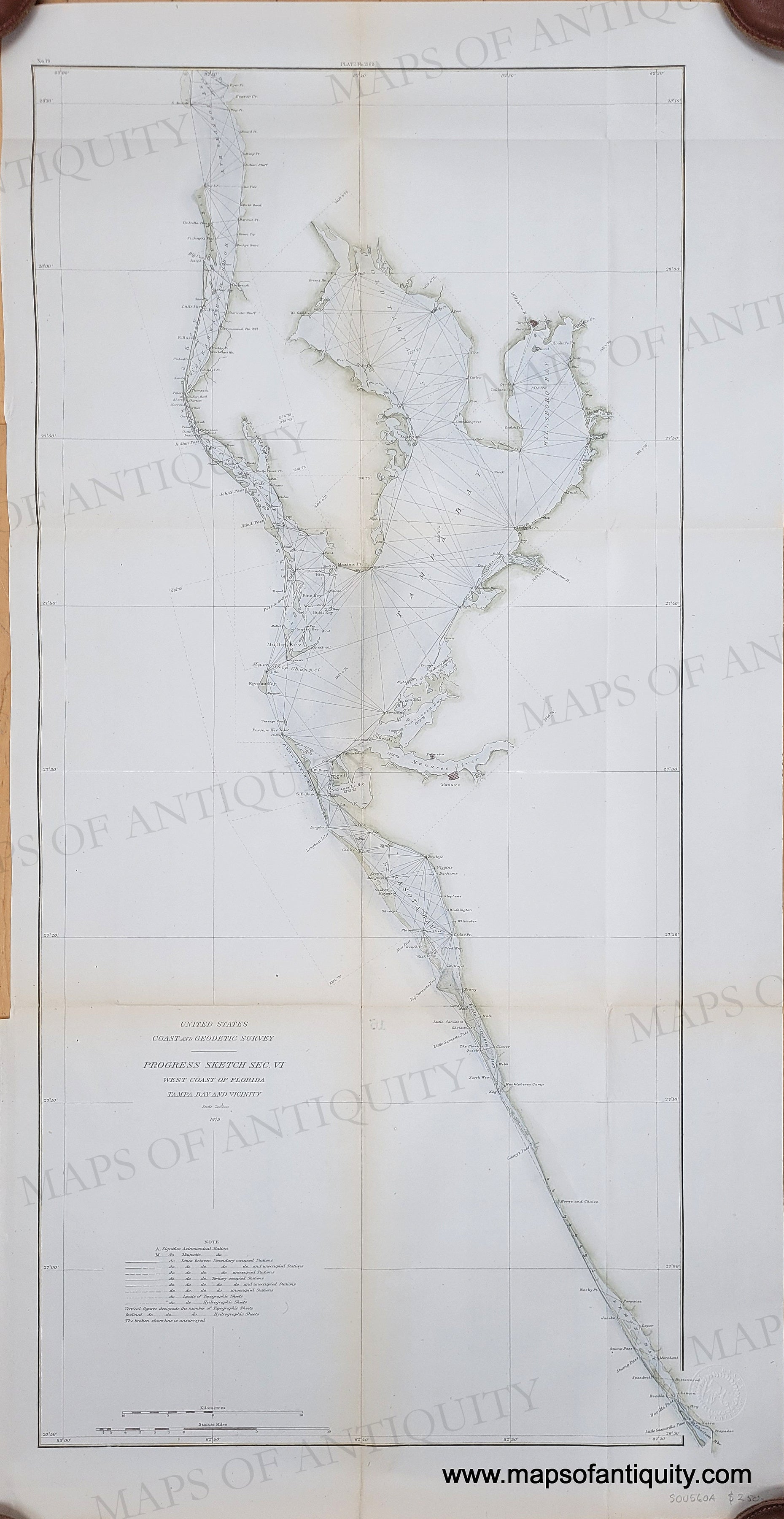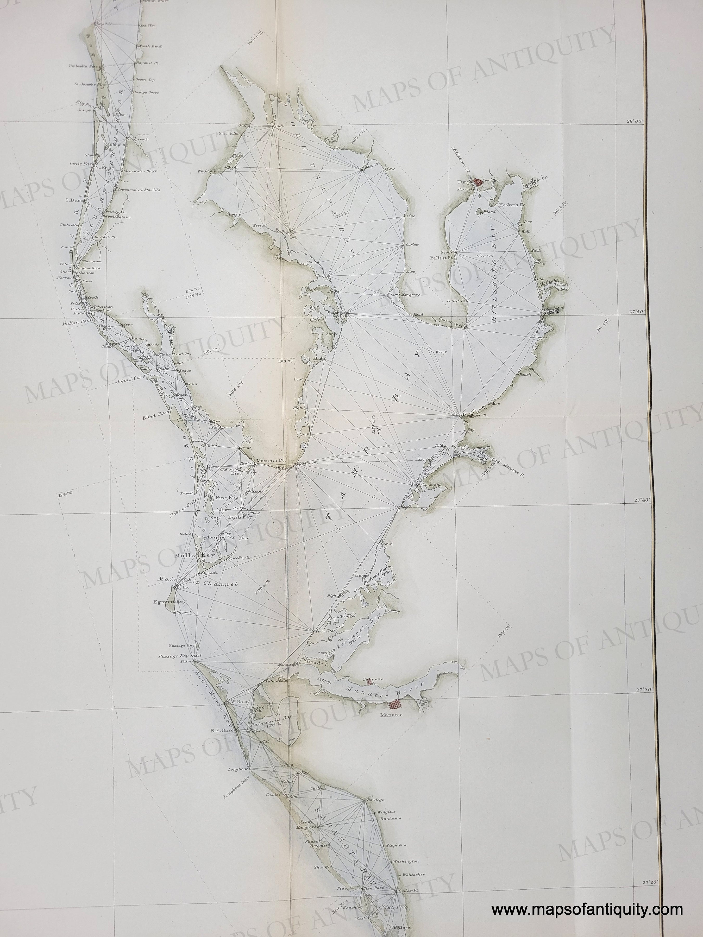 Antique coast survey chart of Tampa Bay FL. This is a triangulation chart and has triangulation lines. Published in the Annual Report of the US Coast Survey in 1879. This chart comprises the coast from St Joseph's Bay and Hog Island to Lemon Bay and Charlotte Harbor. Folds as issued. Good to very good antique condition with some toning, small stains, and tiny holes at fold intersections. Embossed with a stamp from Essex Institute in lower right corner. Approx. 30 x 14 inches to the neatline. Recent hand-coloring.