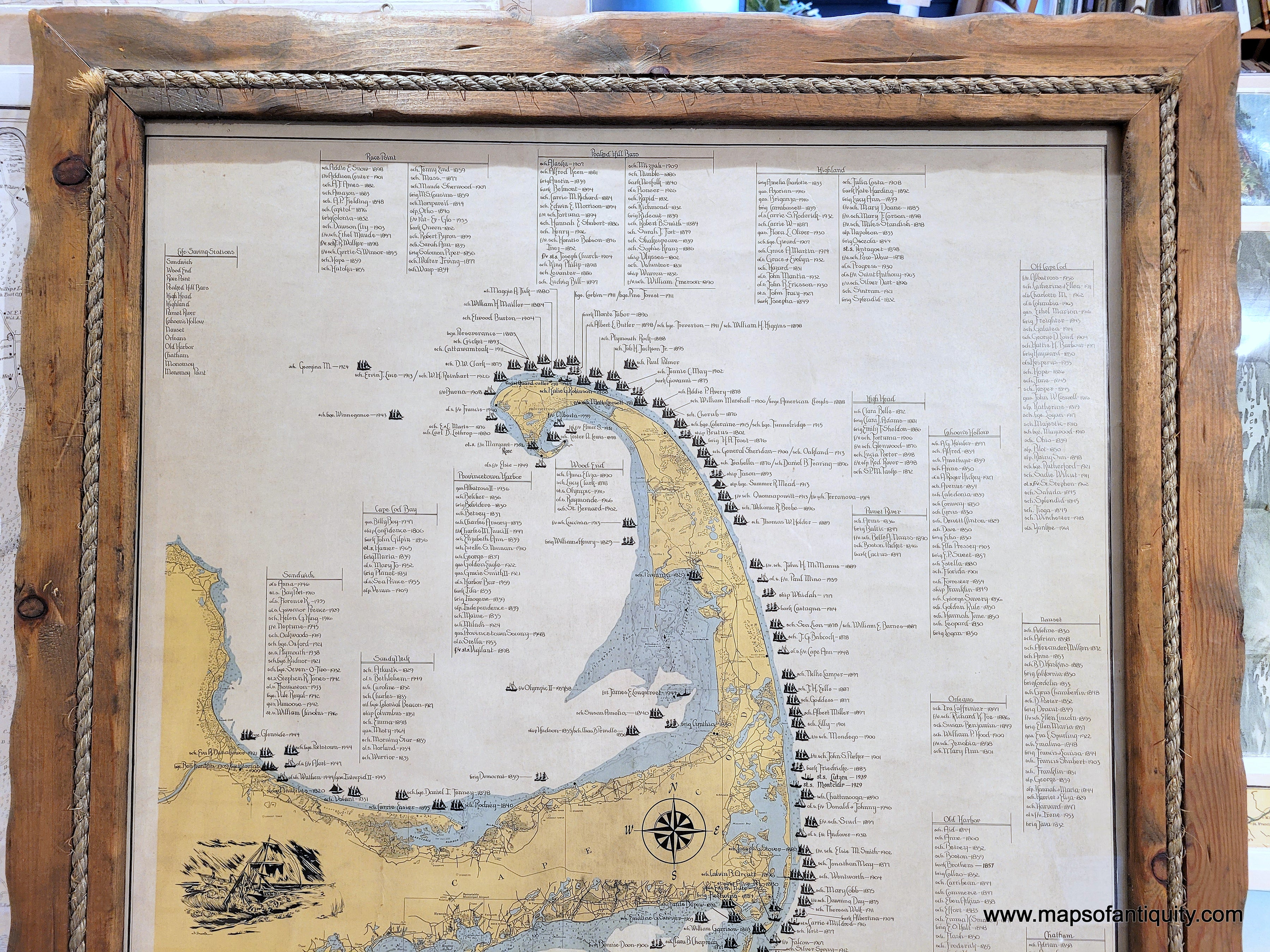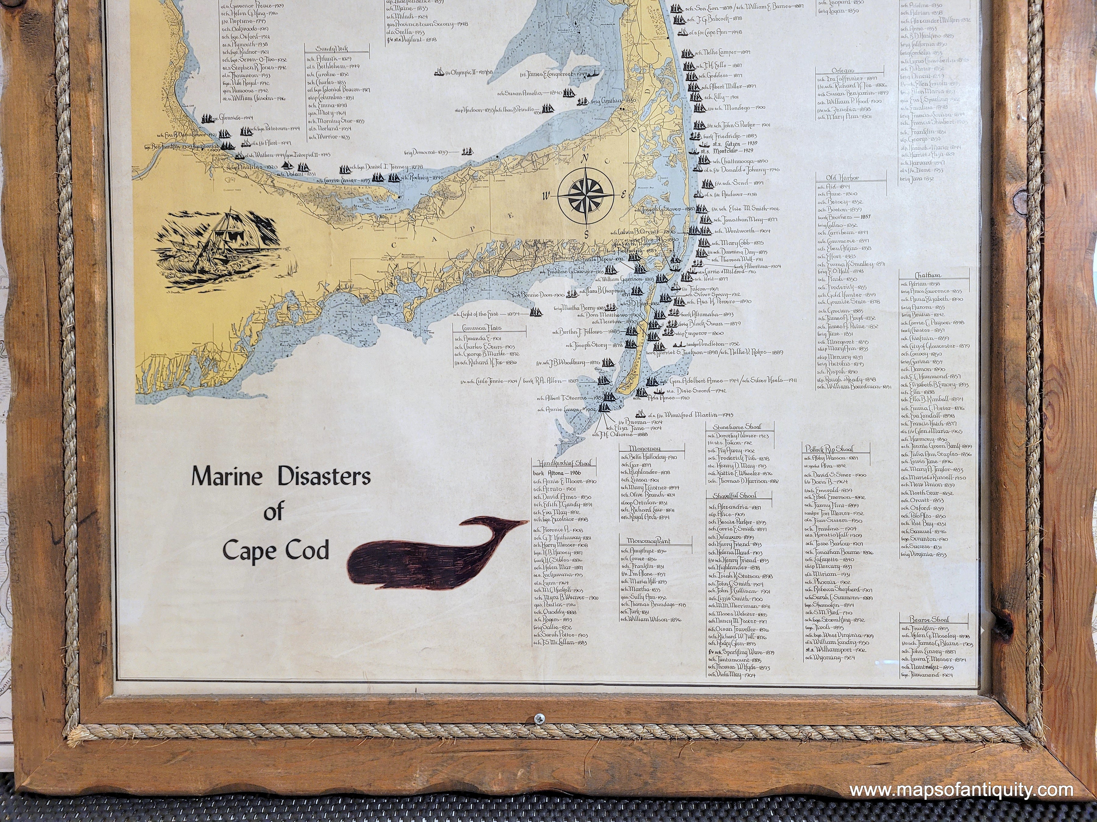 Original 1970 map of Cape Cod in vintage frame. Includes surrounding references listing shipwrecks, the type of ships, and the years in which they sank. These are categorized by the places where the shipwrecks took place. Map was created using material compiled by B. W. Luther, and calligraphy by Susan Doucette, and was published by Peter J. Closson, 1970. Fair to good overall condition with overall toning. This map appears to have been mounted on a board, but we have not opened the frame to check (we would be happy to do so on request). A previous owner added a black whale near the title, apparently to cover the names of the makers and the date. Measures approximately 26.5" x 20.5" to the neatline (H x W.) Total size with the frame is approx. 32 x 25 inches. Best for in-store pick up due to size and weight. Would benefit from being re-framed with UV protective glass. Frame is sturdy. The rope in the frame is coming apart slightly.
