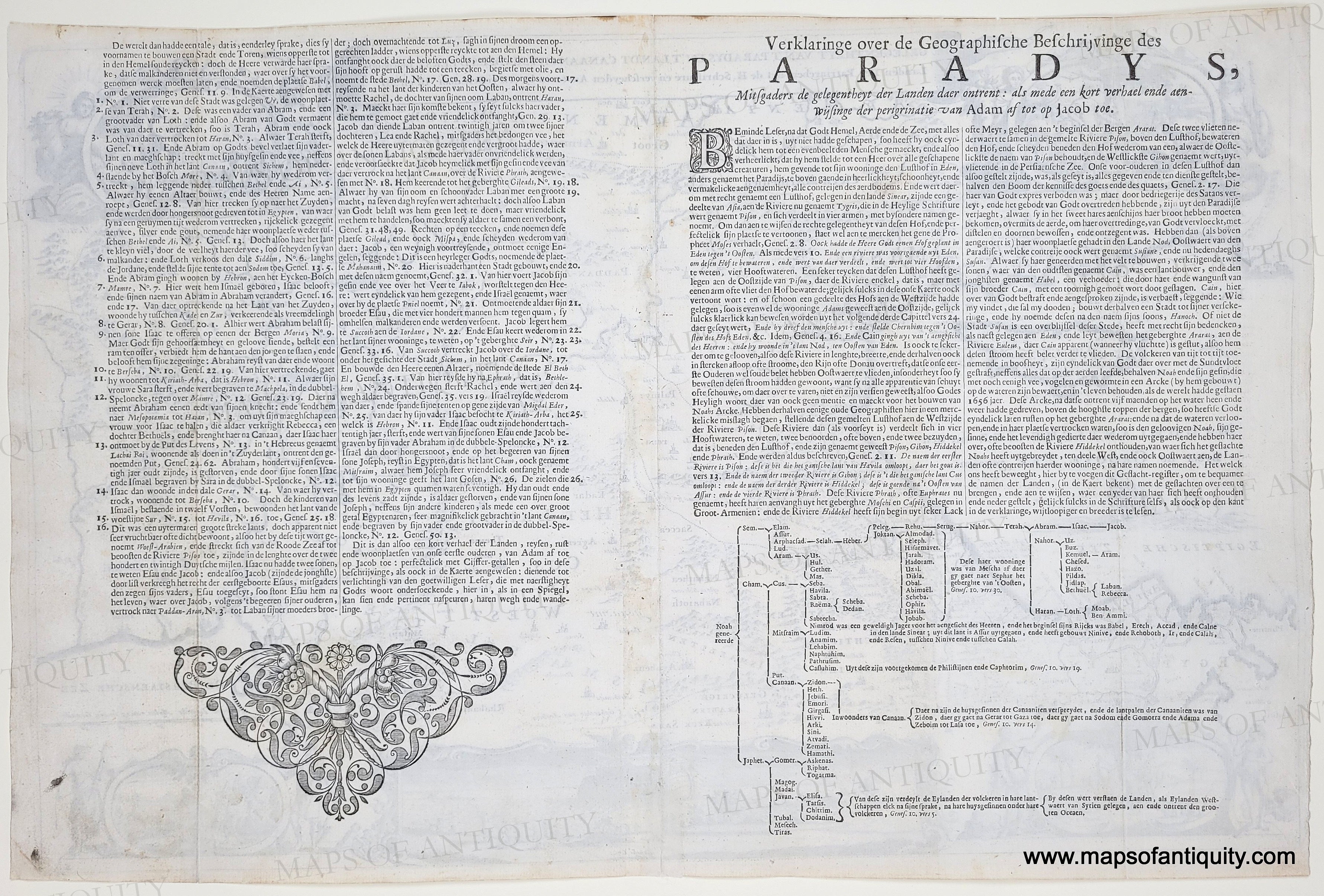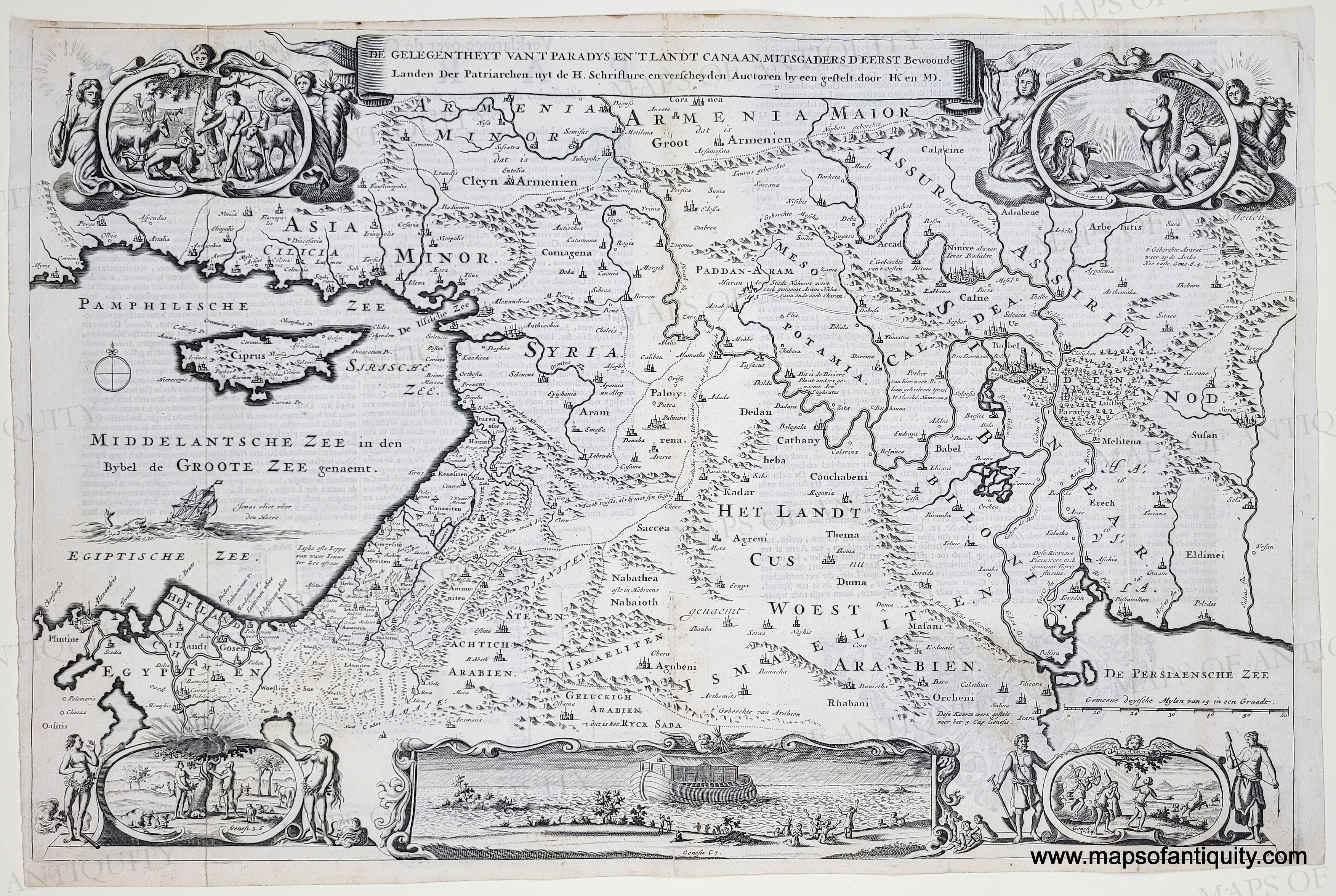 Antique uncolored map of the Middle East, including part of Egypt and the Holy Land (comprised of Israel, Lebanon, and Jordan), by Daniel Stoopendaal, from a Staten Bible dated 1682. From the Dutch so-called ' Staten' bibles, published between 1637 and c. 1760, which contained 5 maps: The World, ' Paradise', The Perigrinations, The Promised Land Canaan, The Travels of St. Paul and a plan of Jerusalem. Vignettes depict the story of Adam and Eve with an image of Noah's Ark confined in a decorative border at lower center. Very good restored condition. Map has been archivally cleaned, deacidified, and repaired. Approx. 11.75 x 18 inches to the neatline.