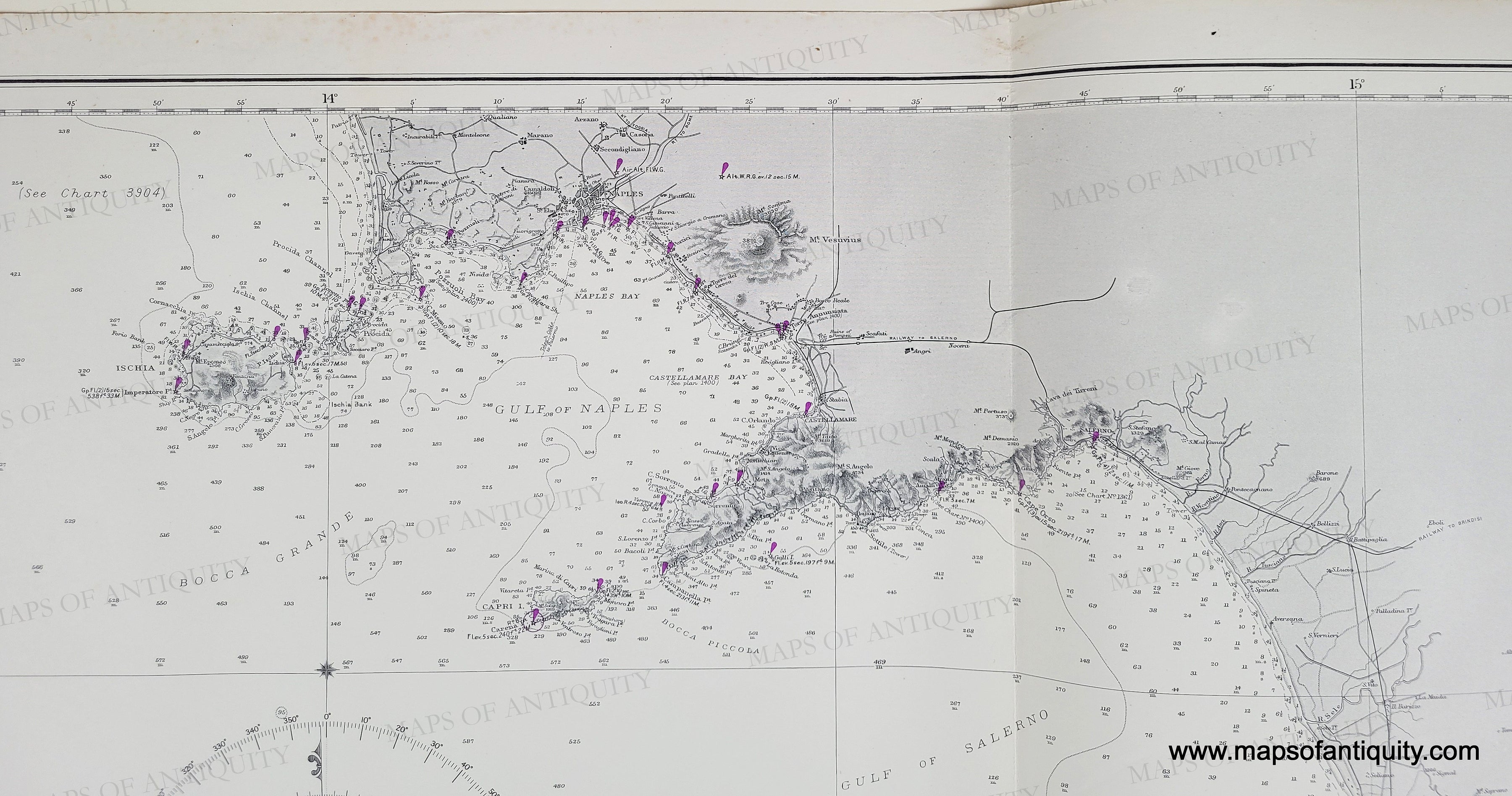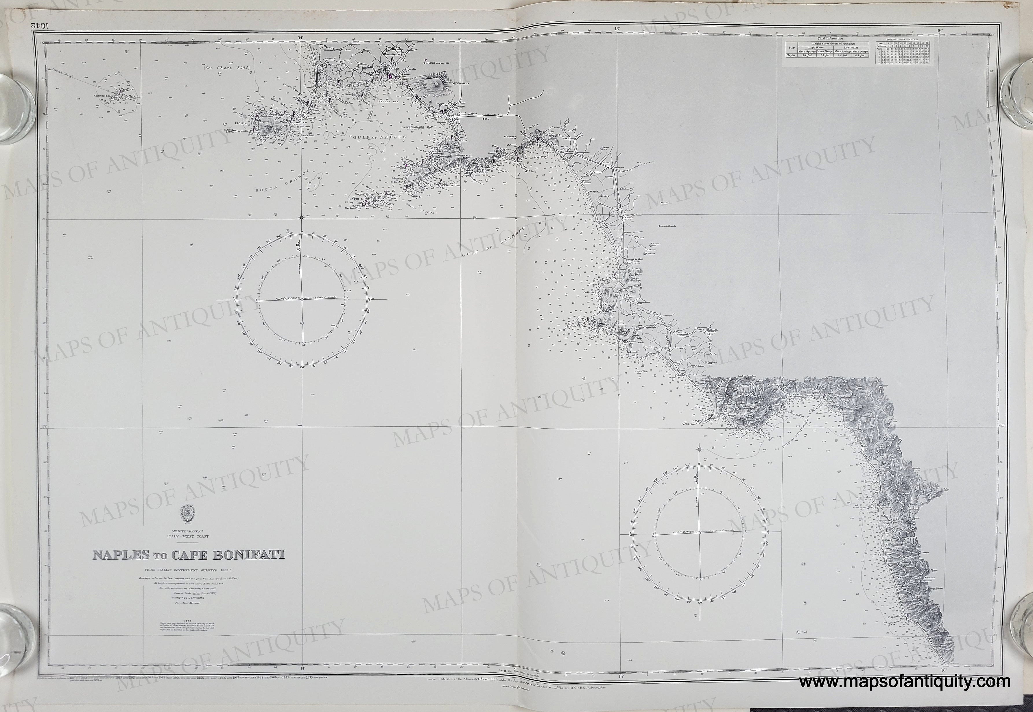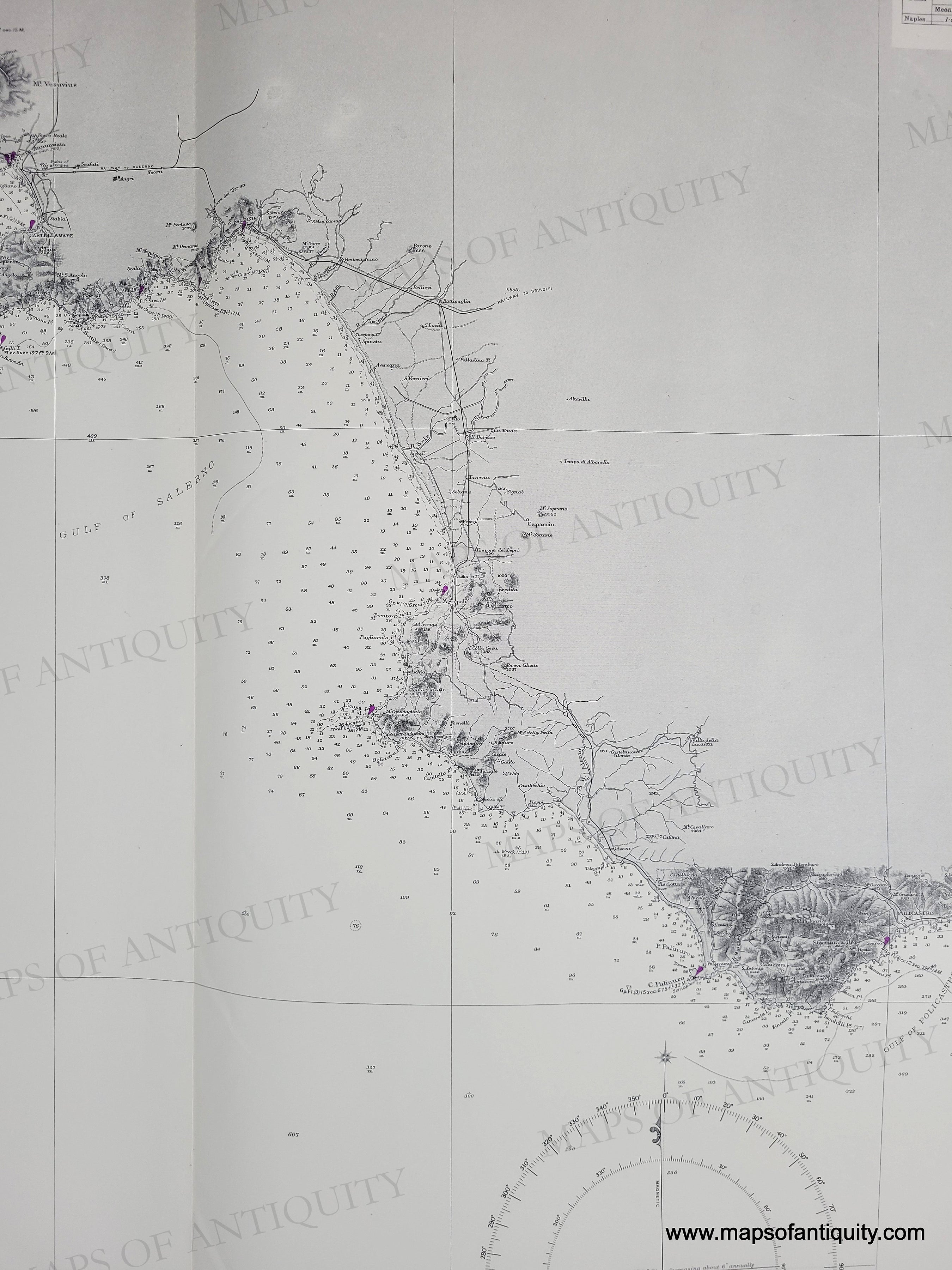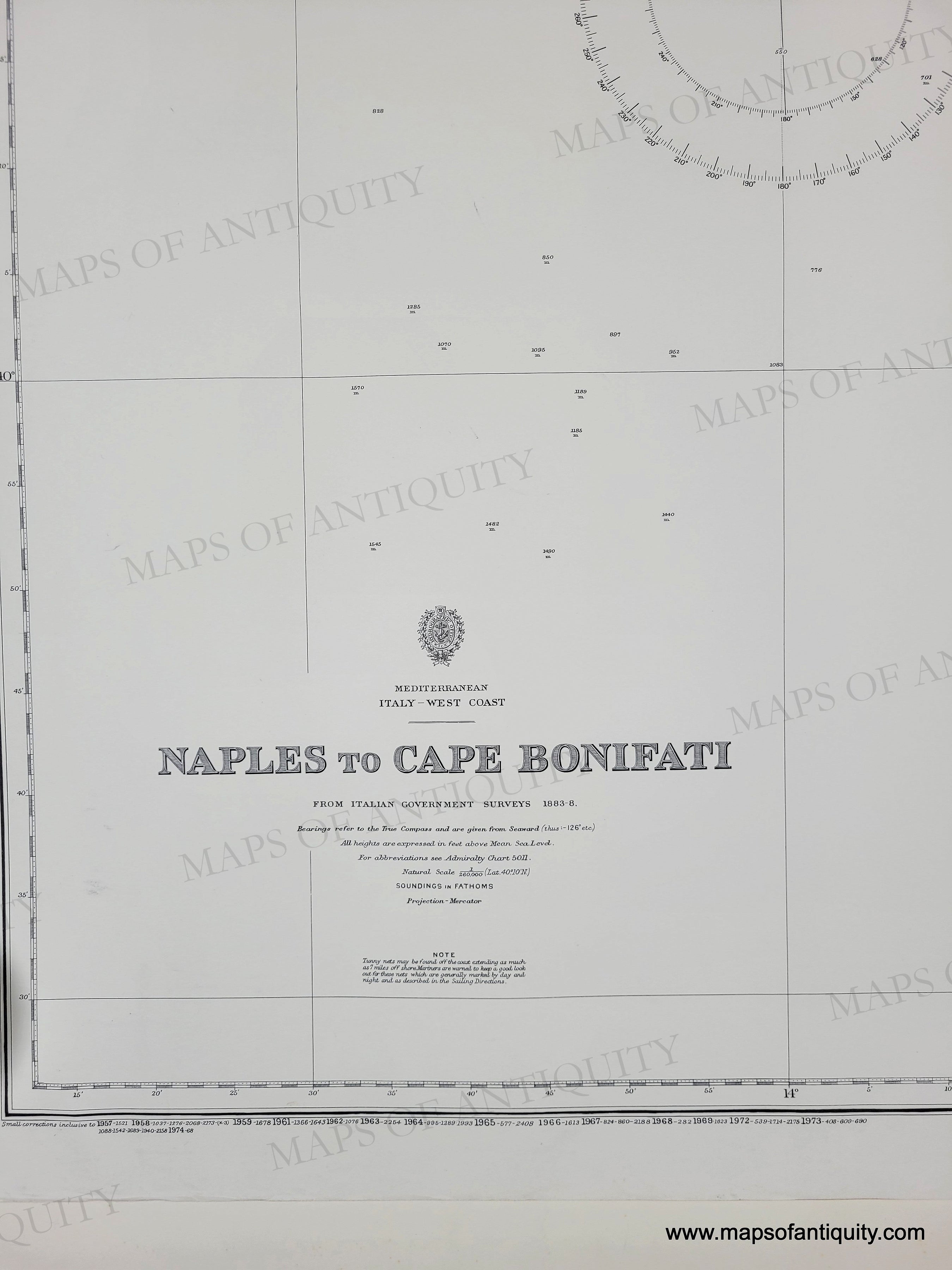Genuine nautical chart by the British Admiralty of the western coast of Italy, with a first publication date of 1894, with numerous additions and corrections up to 1973. Includes Naples, Mount Vesuvius, Salerno, Capri, Solento, Amalfi, Castellamare, Sapri, Ventotene Island. Two compasses. Tidal information. Very good antique condition with minor creasing in the paper to the right of the center fold, some foxing in margin. Measures approx. 26 x 38.75 inches to the neatline.