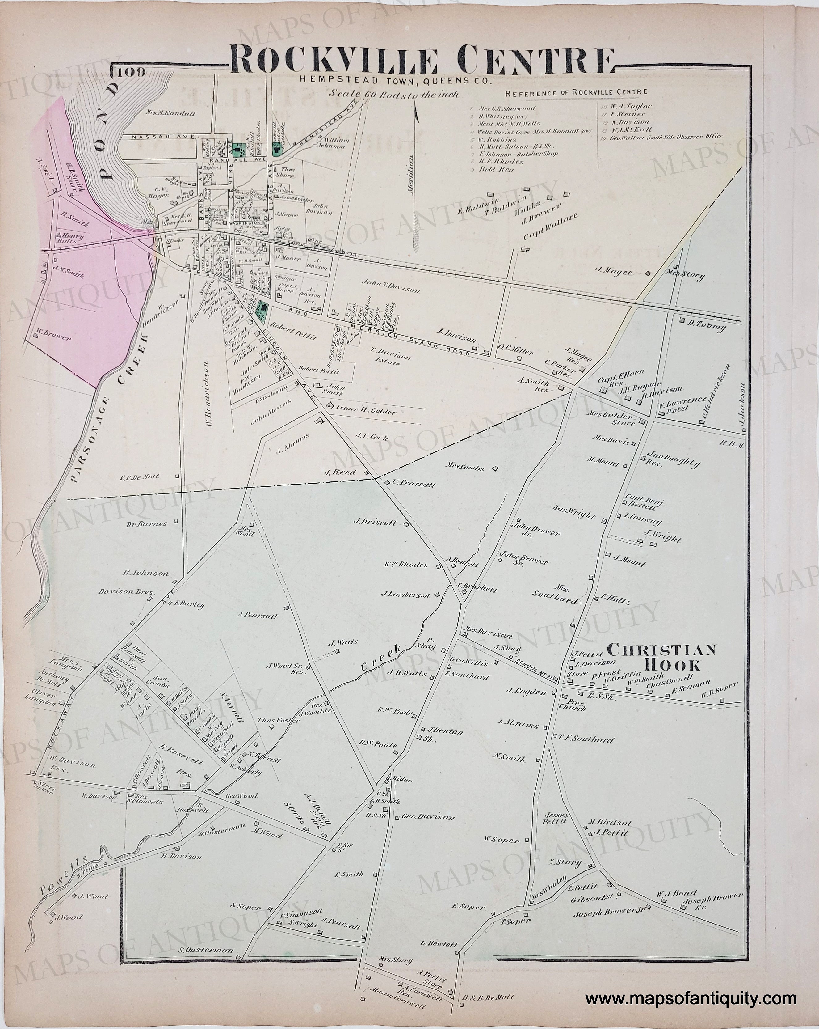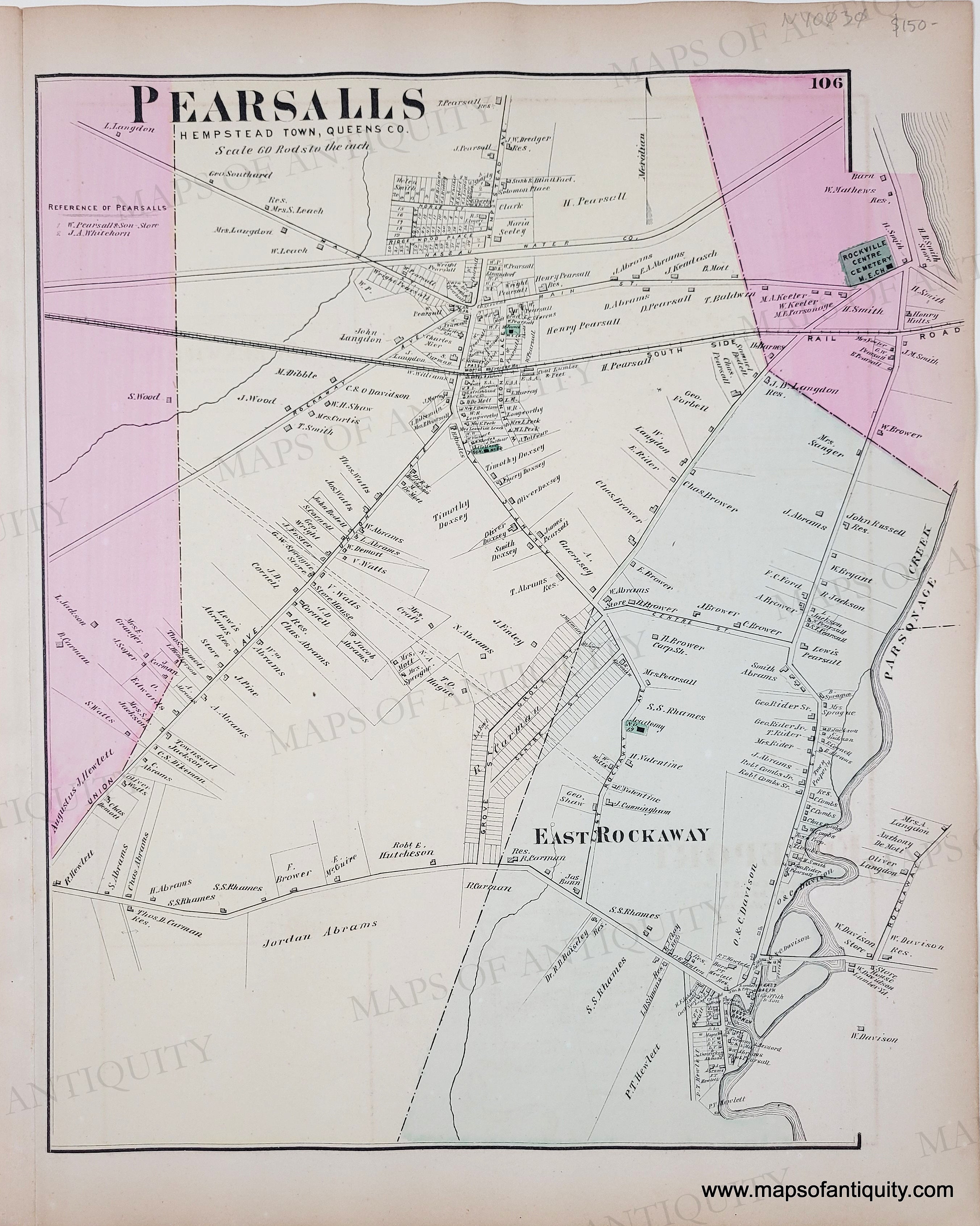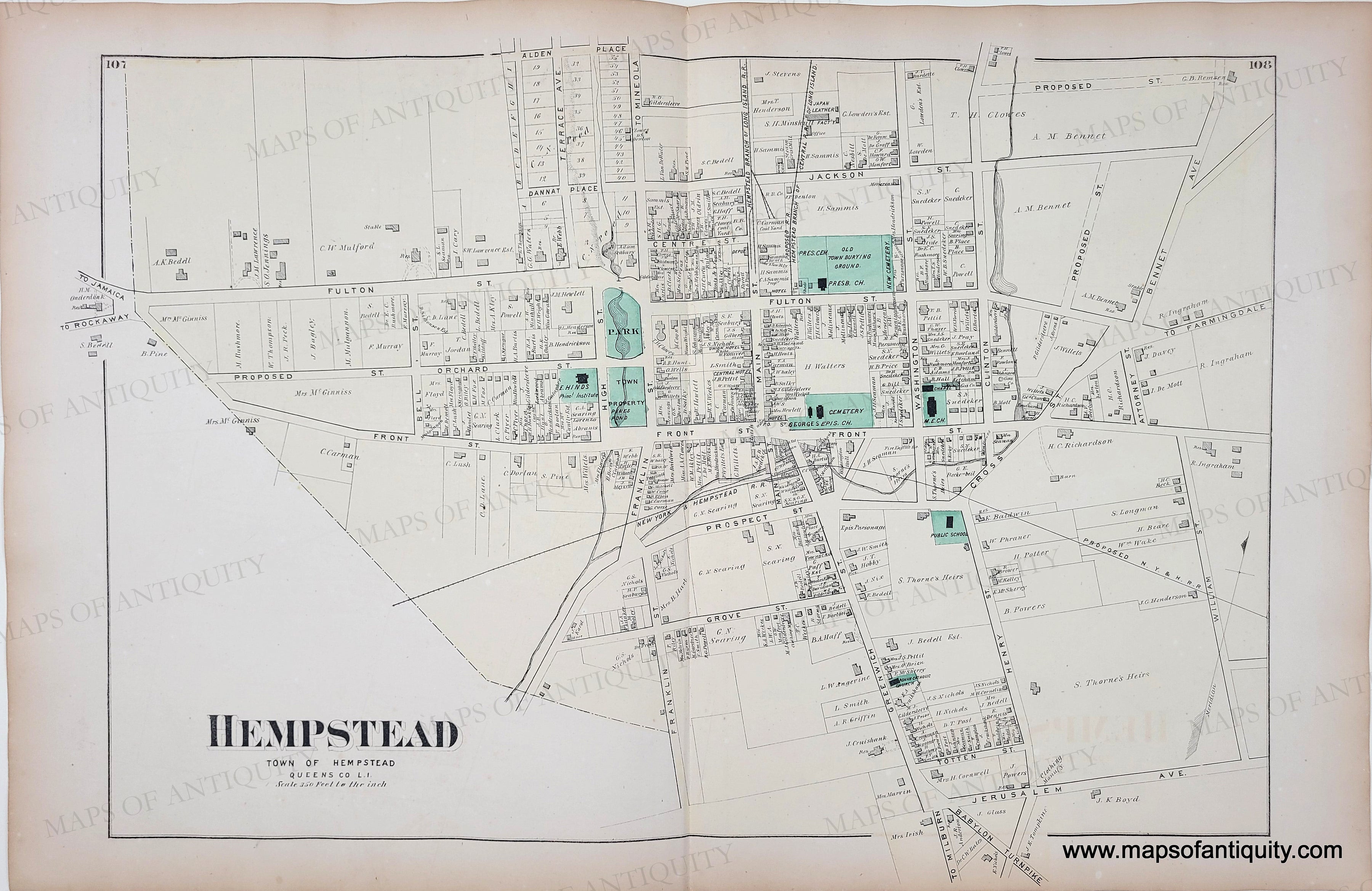 Antique double-sided page of maps published in the Atlas of Long Island, New York by Beers, Comstock, & Cline, 1873. Centerfold map is the village of Hempstead. Back side maps are Pearsalls and Rockville Center (parts of Hempstead). Shows roads, railroads, parks, businesses, and includes property owners' names. Original hand-coloring. Centerfold map measures approx. 13.5 x 20.5 inches. Smaller verso maps measure approx. 13.5 x 9.5 inches to the neatline.