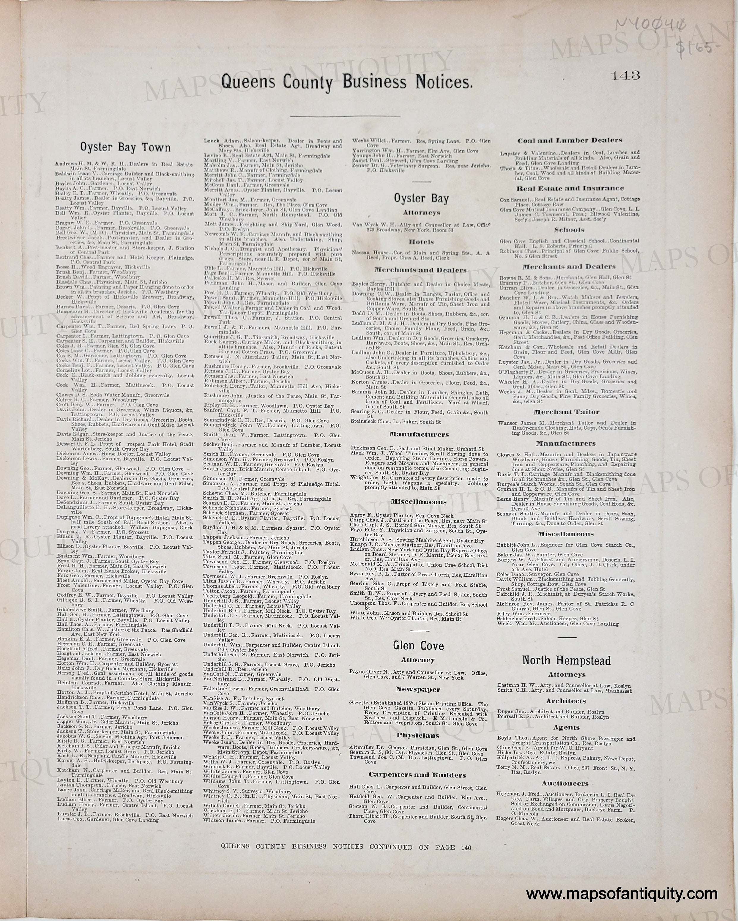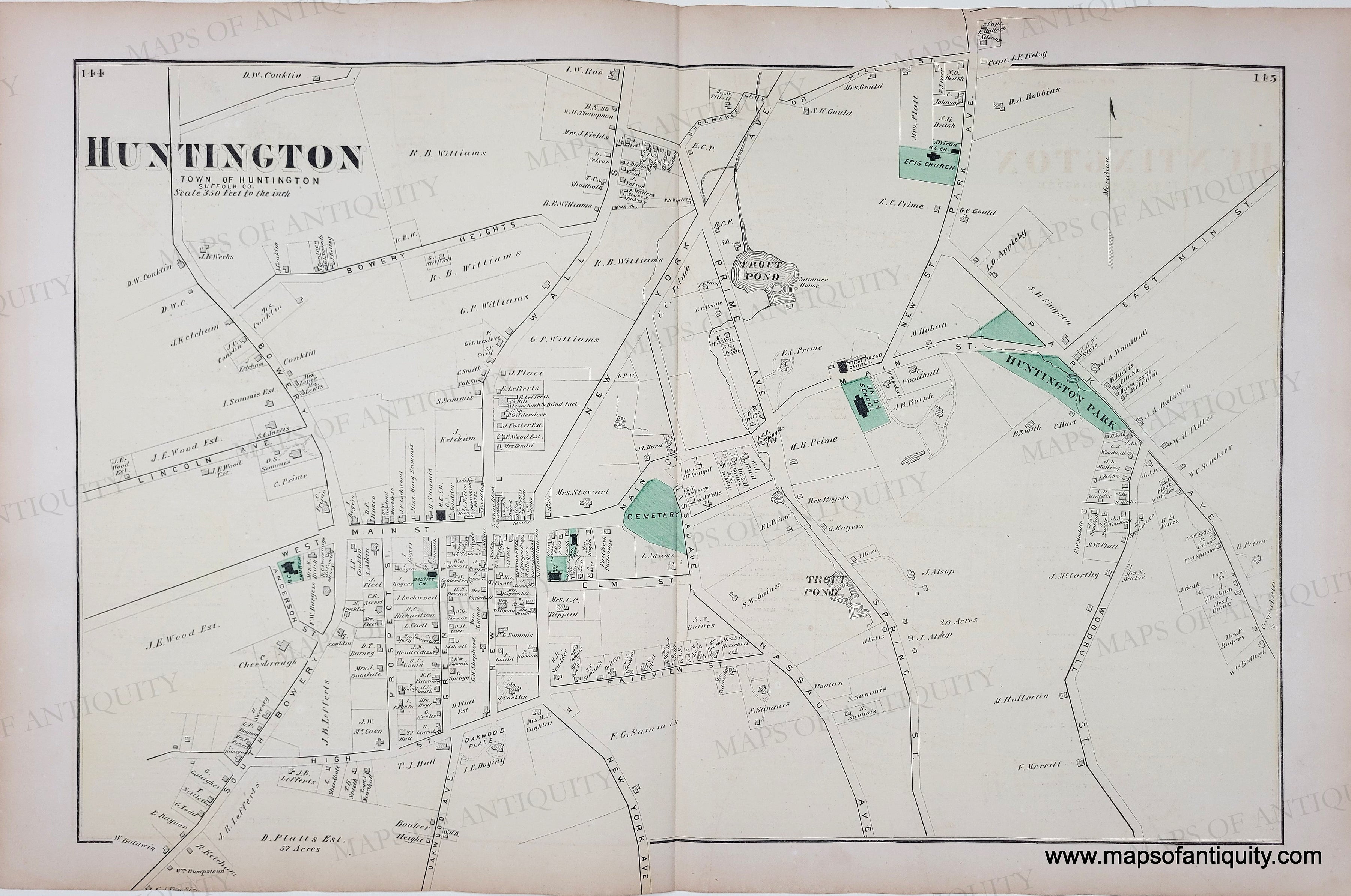 Antique hand-colored map from the Atlas of Long Island, New York by Beers, Comstock, & Cline, 1873. This map shows Huntington village center, in the town of Huntington, with parks, churches, streets, property owners. Good to very good antique condition, original hand-color, some toning, mild foxing. Back side has business notices printed on it, which is somewhat visible through the paper. Measures approx. 13.5 x 21 inches.