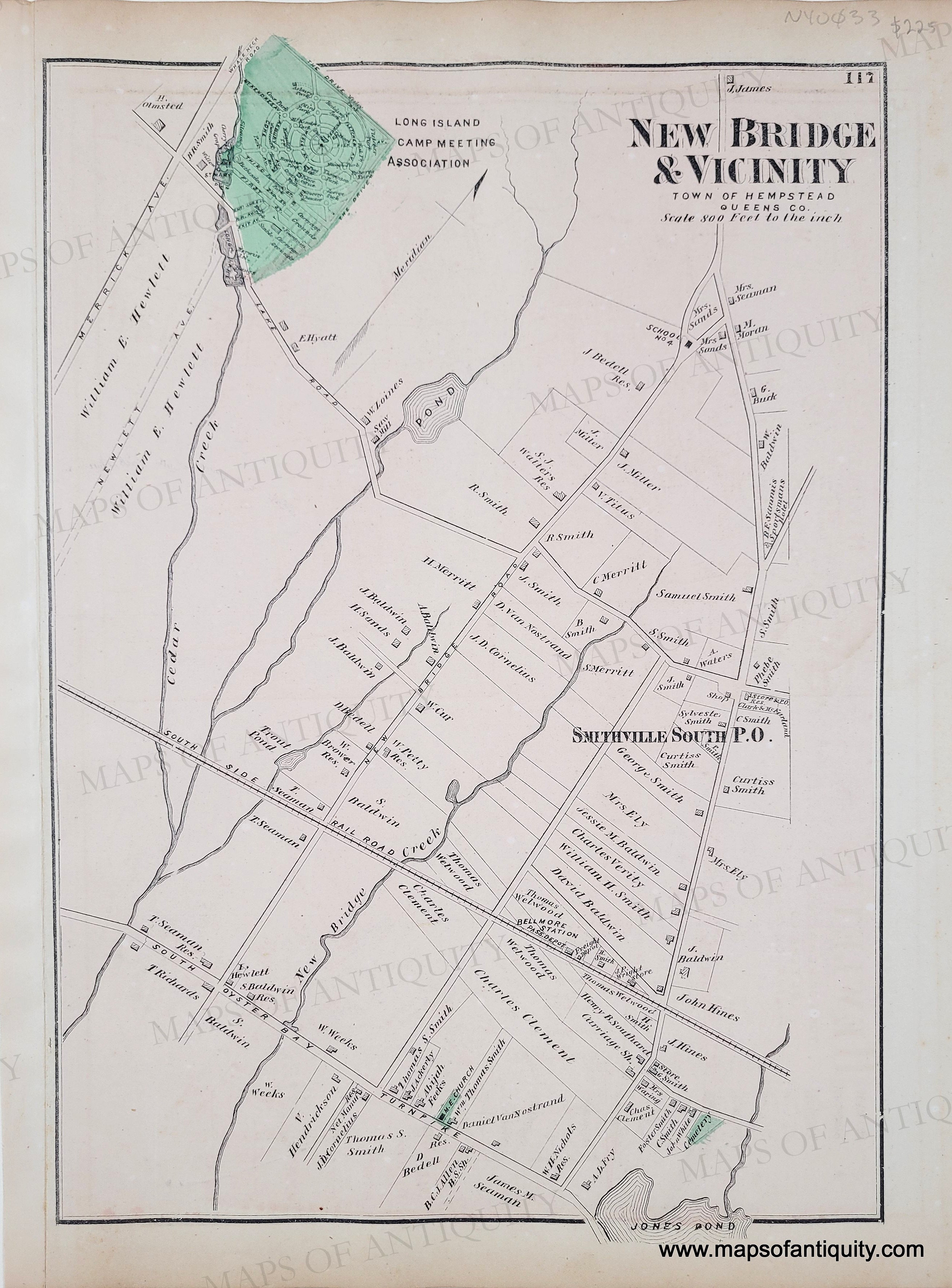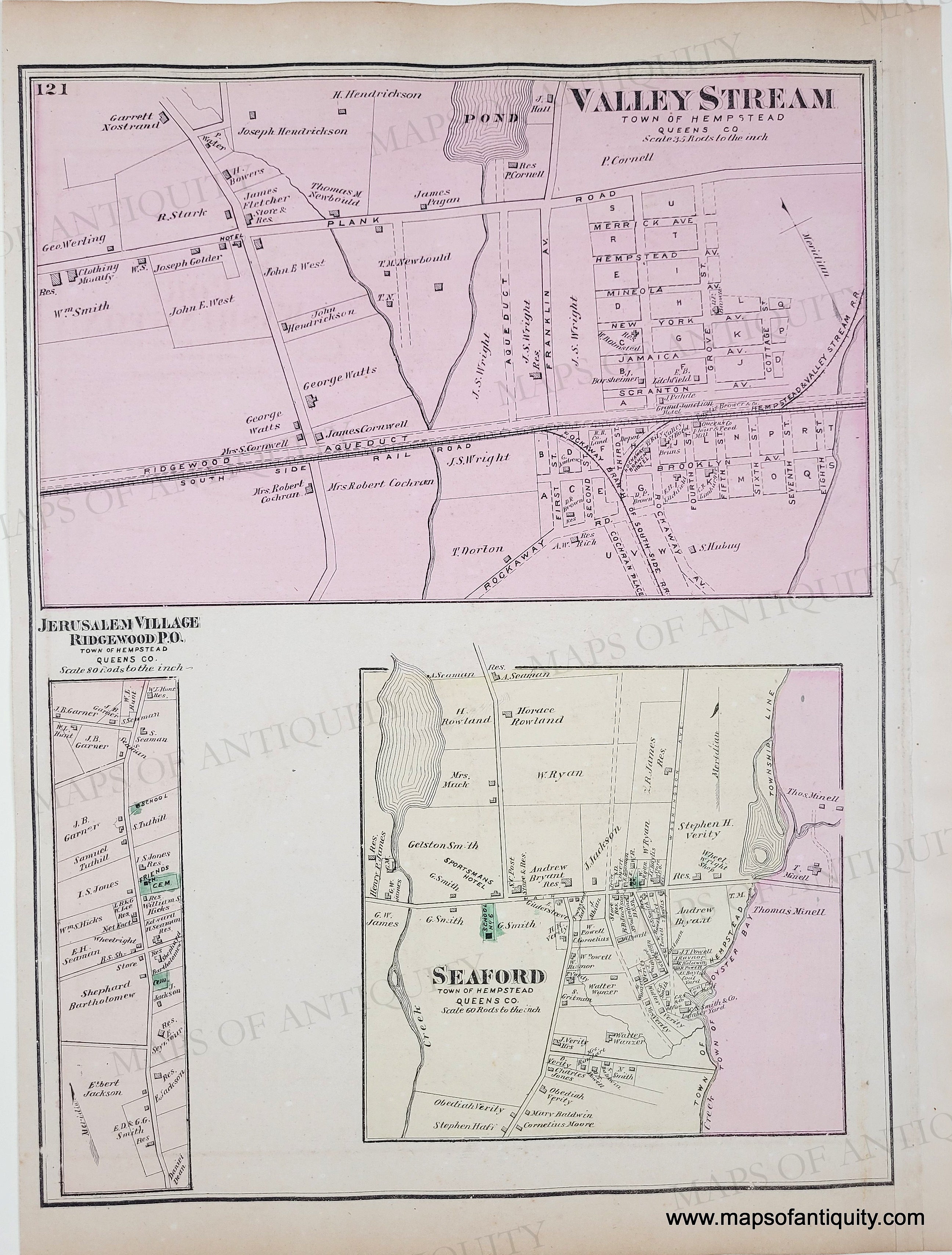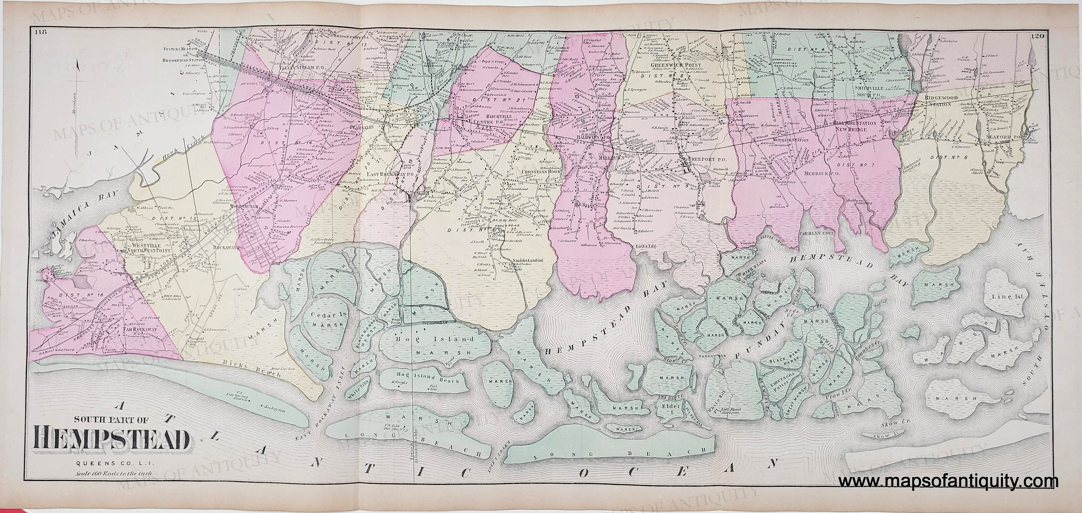 Antique maps from the Atlas of Long Island, New York, by Beers, Comstock, & Cline, 1873. Centerfold map shows the southern part of Hempstead, NY with Far Rockaway (now part of Queens), Westville, Rockaway, Valley Stream, Rockville Centre, Baldwin, Freeport, Merrick, Bellmore (when it was still New Bridge), Ridgewood Station, Seaford, Hempstead Bay, inlets and islands, property owners. Centerfold map measures approx. 14 x 31 inches. Verso maps measure approx. 10 x 13.5 inches. Original hand-coloring. Very good overall antique condition with mild toning throughout, a few spots of minor foxing.