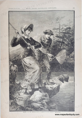 1883 - Maine - On the Megalloway - A Lesson in Fly-Fishing - Antique Print