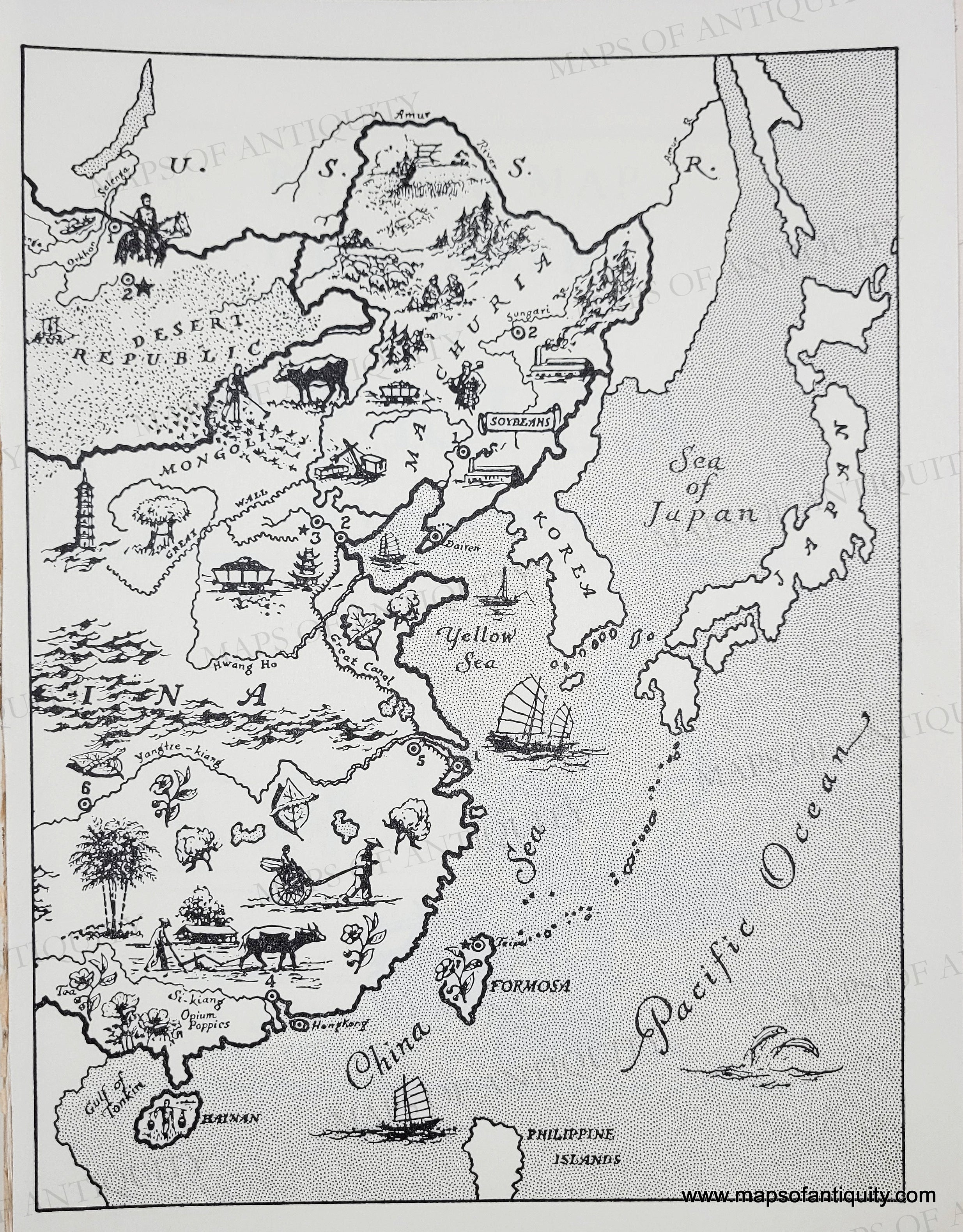 Set of two original maps from Vernon Quinn's "Picture Map Geography of Asia" with Maps and Drawings by Frank Beaudouin, published in 1962 by J.B. Lippincott Company. This pictorial map of China, Tibet, Sinkiang, Mongolia and Manchuria shows the major cities, trades and industries, fauna, flora and general attractions of the region. Very good Original condition with virtually no foxing. Each sheet measures approximately 6.5 inches by 9 inches, as measured to the neatline.
