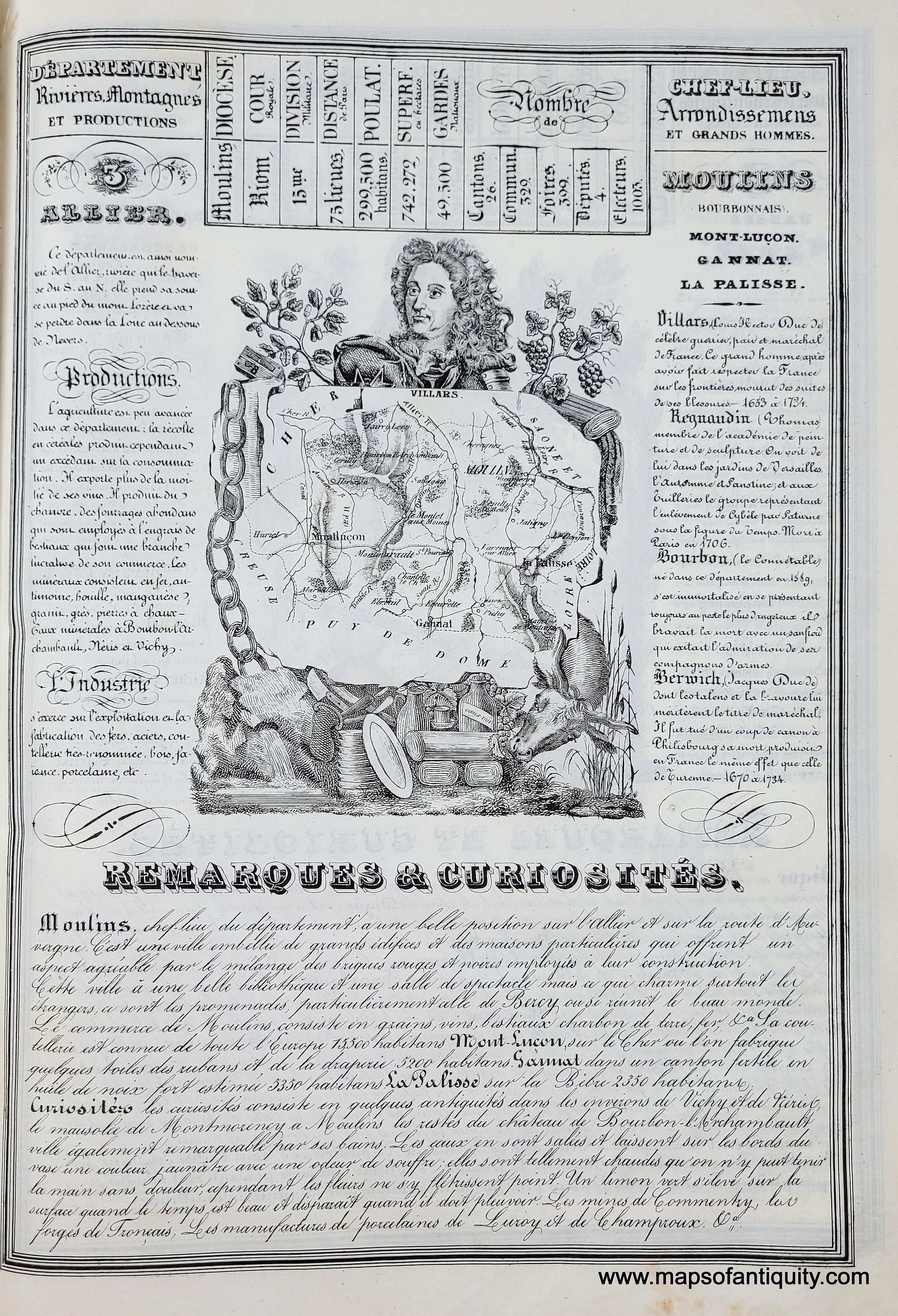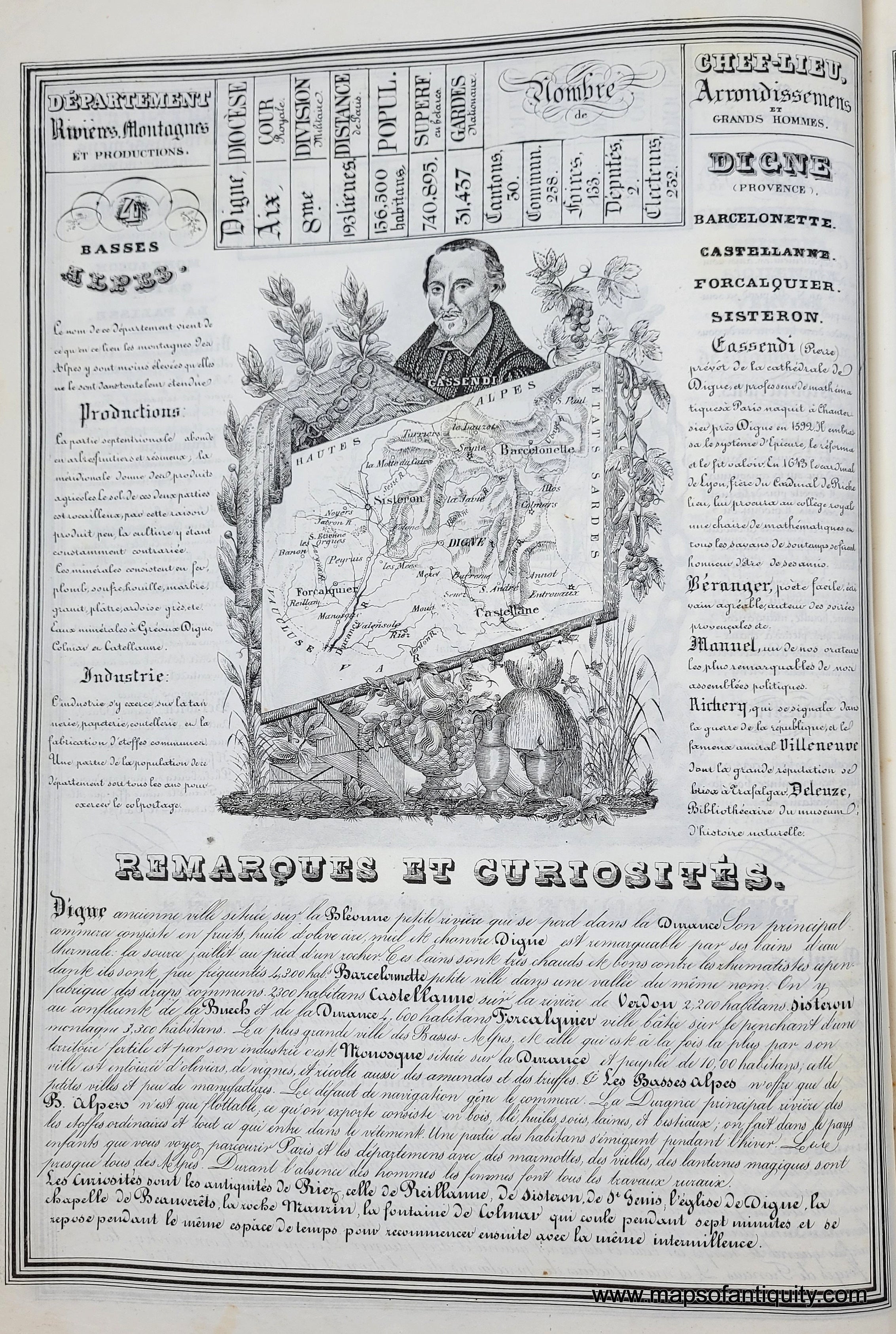Antique double-sided page with maps of the Departments of Allier and Basses Alpes (Alpes-de-Haute-Provence), France, published in the Nouvelle Geographie Et Statistique De La France, Alger Et La Belgique, Suivie D'Un Traite Sur Le Monde Entier... 1842 (5th edition) by Alexandre Corbin. This charming page features text relating to the statistics of the Department, including rivers, mountains, industries, notable residents, and "remarks & curiosities" as well as a small map of the region surrounded by illustrations of the local products and one notable/historical personage (Villars in Allier and Gassendi in Basses Alpes). Very good antique condition with some minor stains in the margins. Paper is lightweight and the image/text on verso is slightly visible but this can be reduced by backing with a black backing when framing. Measures approx. 13.5 x 9.5 inches to the neatline.