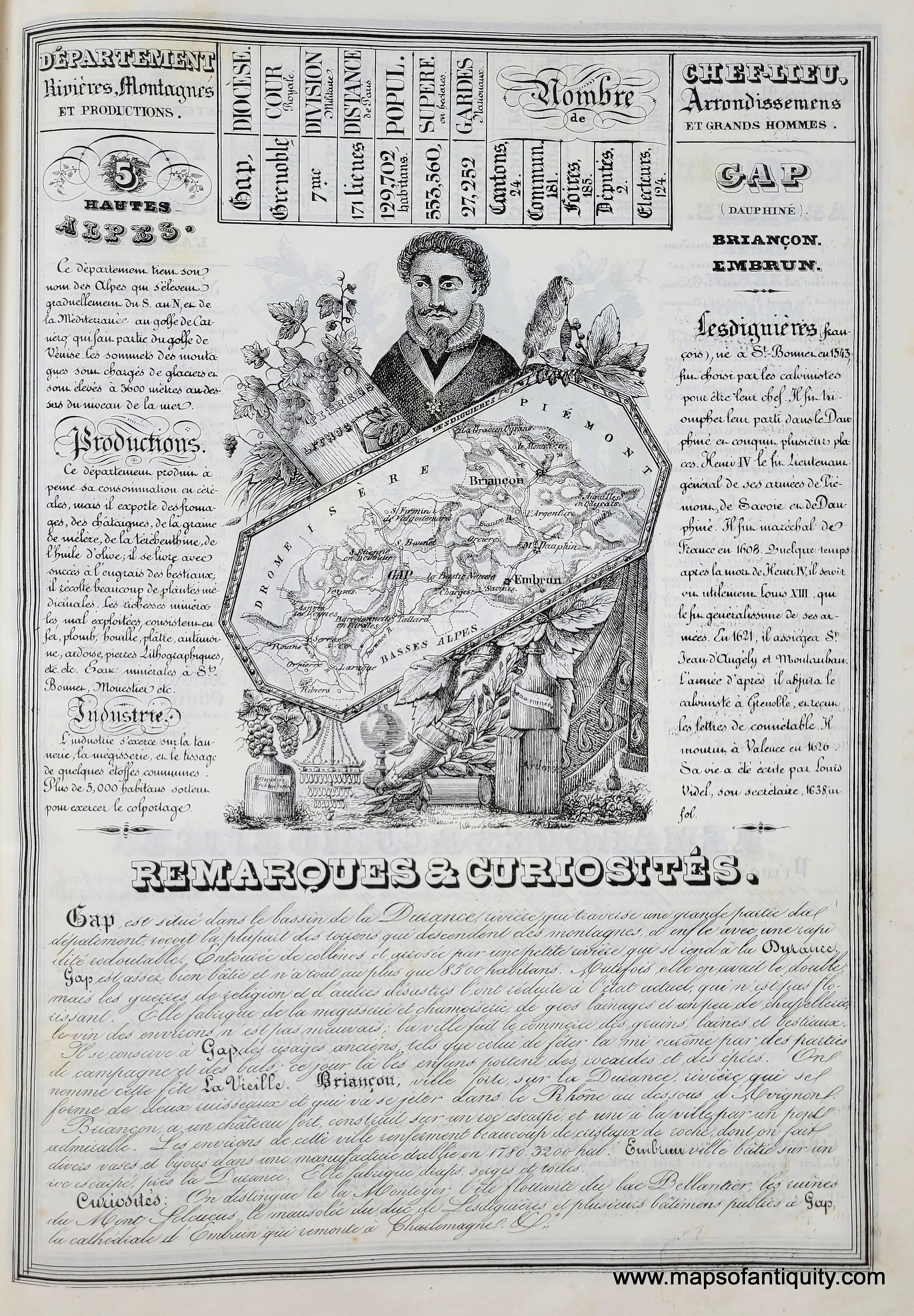 Antique double-sided page with maps of the Departments of Hautes Alpes and Ardeche, France, published in the Nouvelle Geographie Et Statistique De La France, Alger Et La Belgique, Suivie D'Un Traite Sur Le Monde Entier... 1842 (5th edition) by Alexandre Corbin. This charming page features text relating to the statistics of the Department, including rivers, mountains, industries, notable residents, and "remarks & curiosities" as well as a small map of the region surrounded by illustrations of the local products and one notable/historical personage (Lesdiguieres in Hautes Alpes and Boissy d'Anglas in Ardeche). Very good antique condition with some minor stains in the margins. Paper is lightweight and the image/text on verso is slightly visible but this can be reduced by backing with a black backing when framing. Measures approx. 13.5 x 9.5 inches to the neatline.