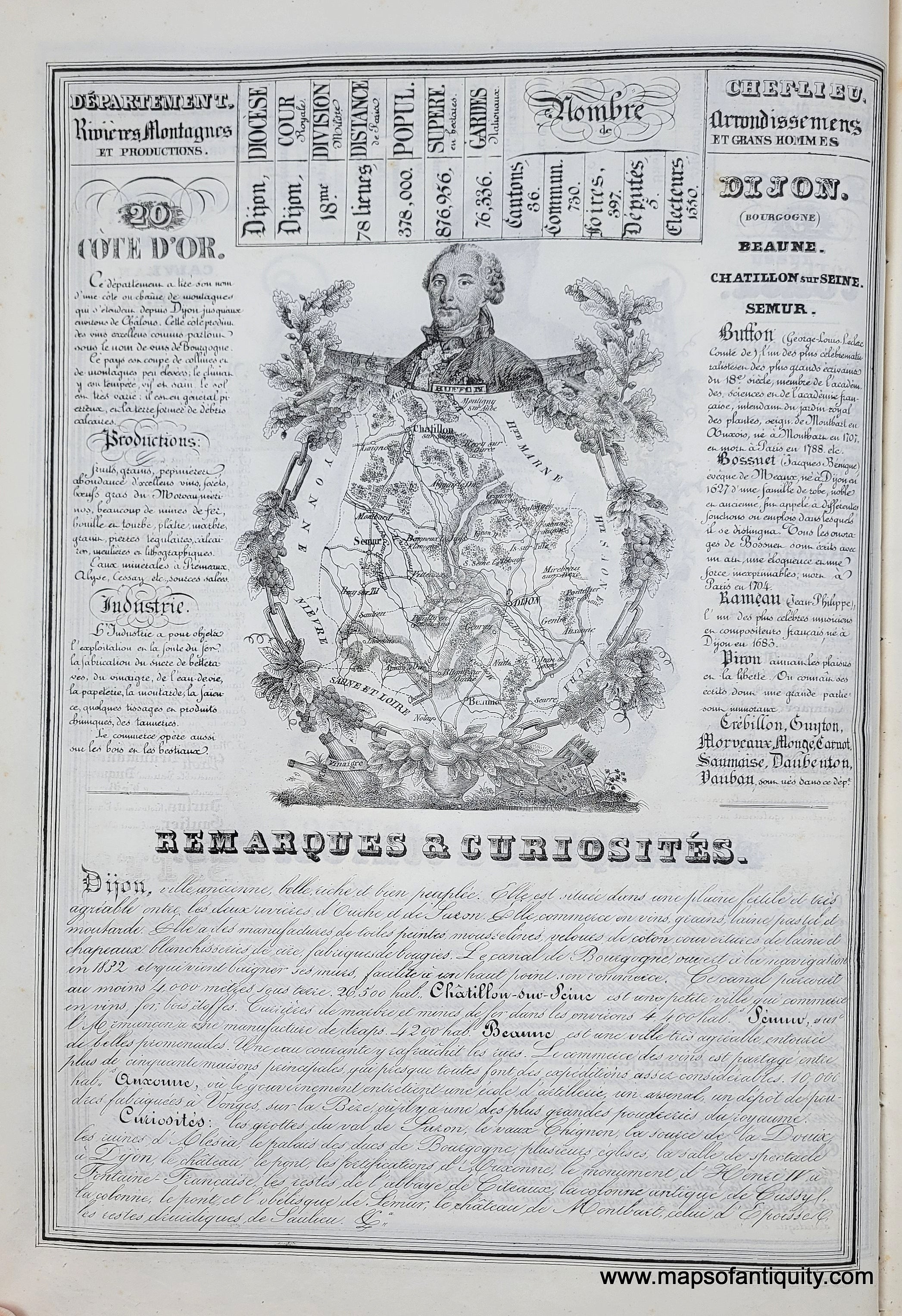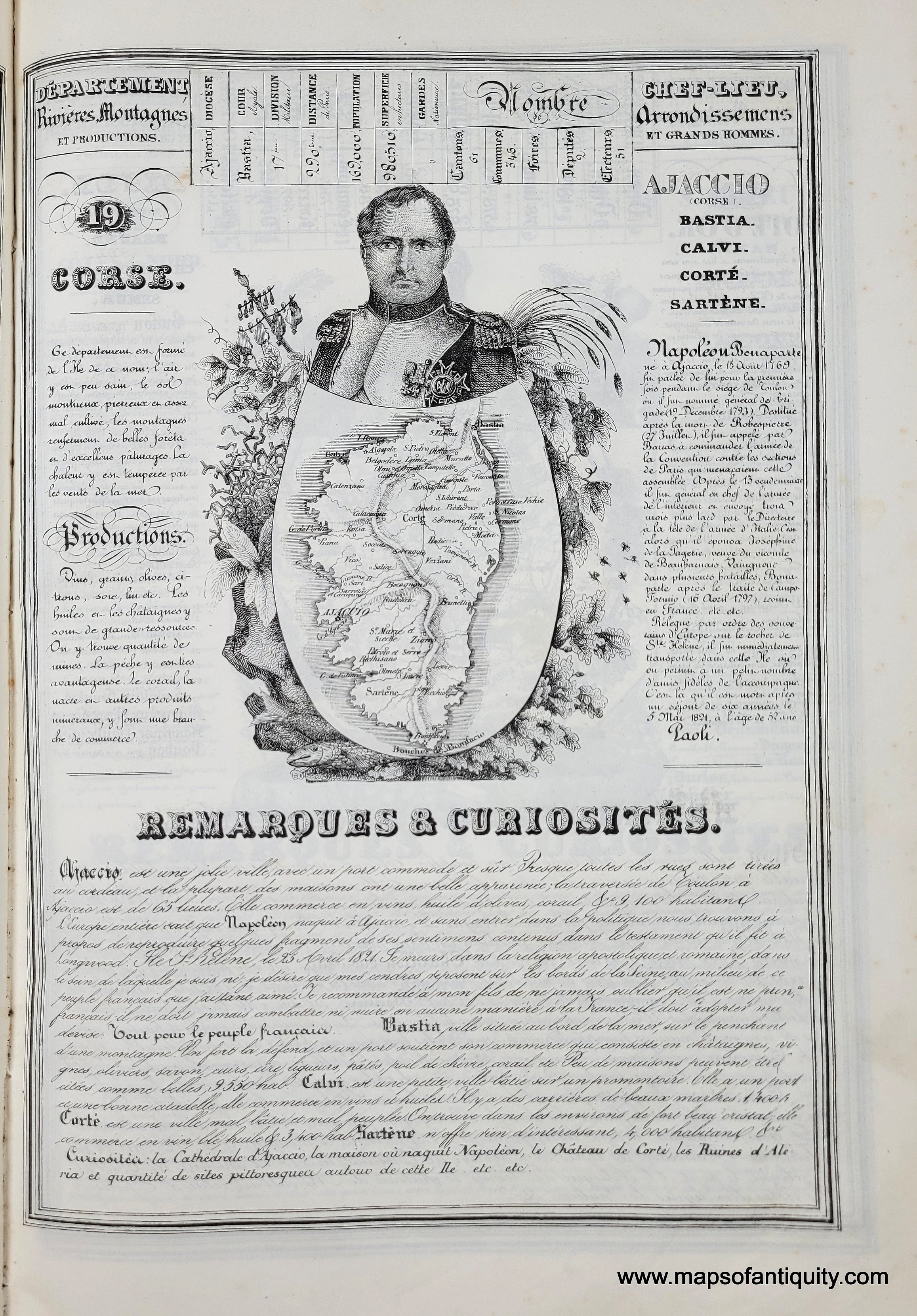 Antique double-sided page with maps of the Departments of Corse (Corsica) and Cote-d'Or, France, published in the Nouvelle Geographie Et Statistique De La France, Alger Et La Belgique, Suivie D'Un Traite Sur Le Monde Entier... 1842 (5th edition) by Alexandre Corbin. This charming page features text relating to the statistics of the Department, including rivers, mountains, industries, notable residents, and "remarks & curiosities" as well as a small map of the region surrounded by illustrations of the local products and one notable/historical personage (Napoleon in Corsica and Buffon in Cote-d'Or). Very good antique condition with some minor stains in the margins. Paper is lightweight and the image/text on verso is slightly visible but this can be reduced by backing with a black backing when framing. Measures approx. 13.5 x 9.5 inches to the neatline.