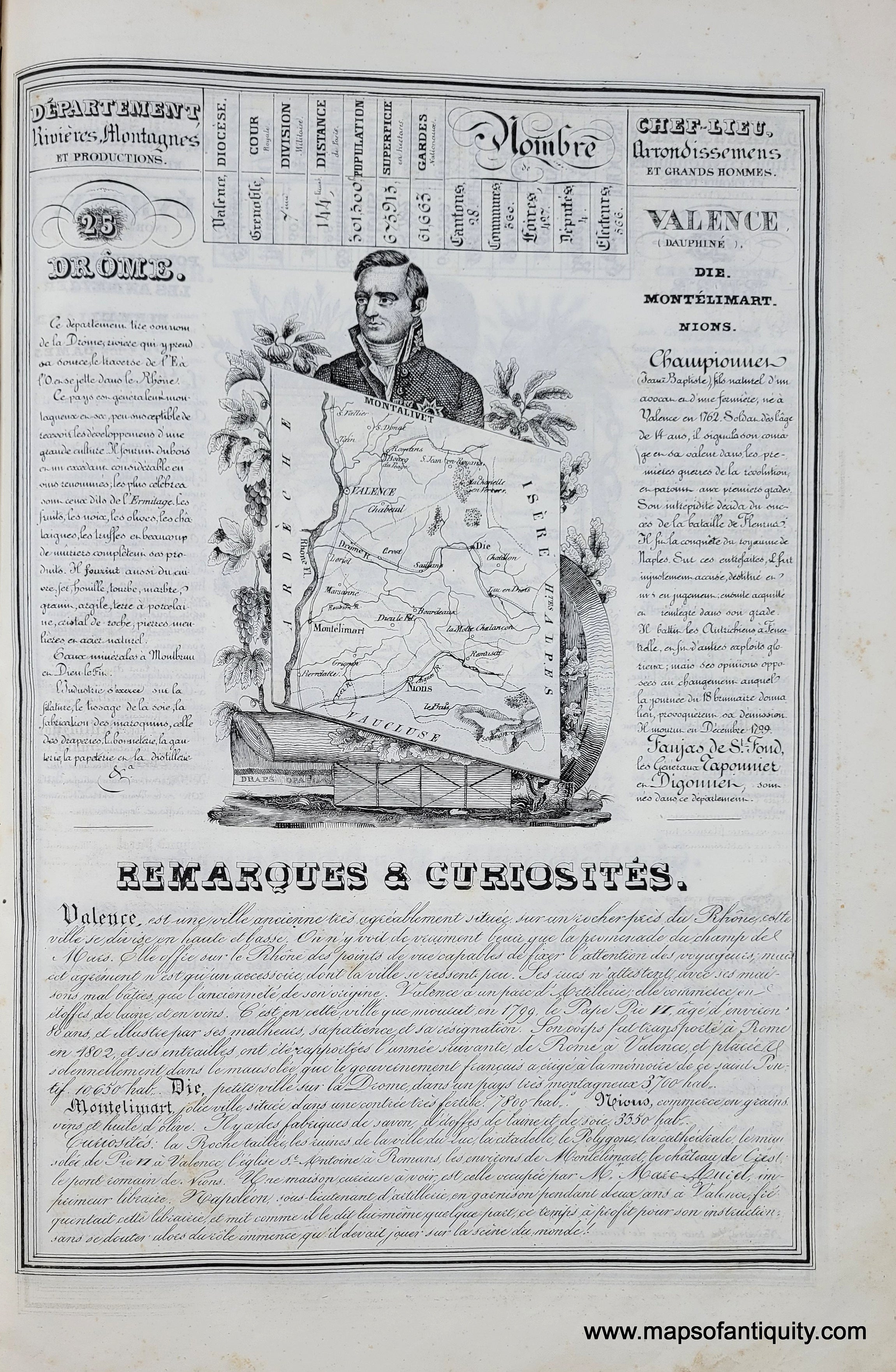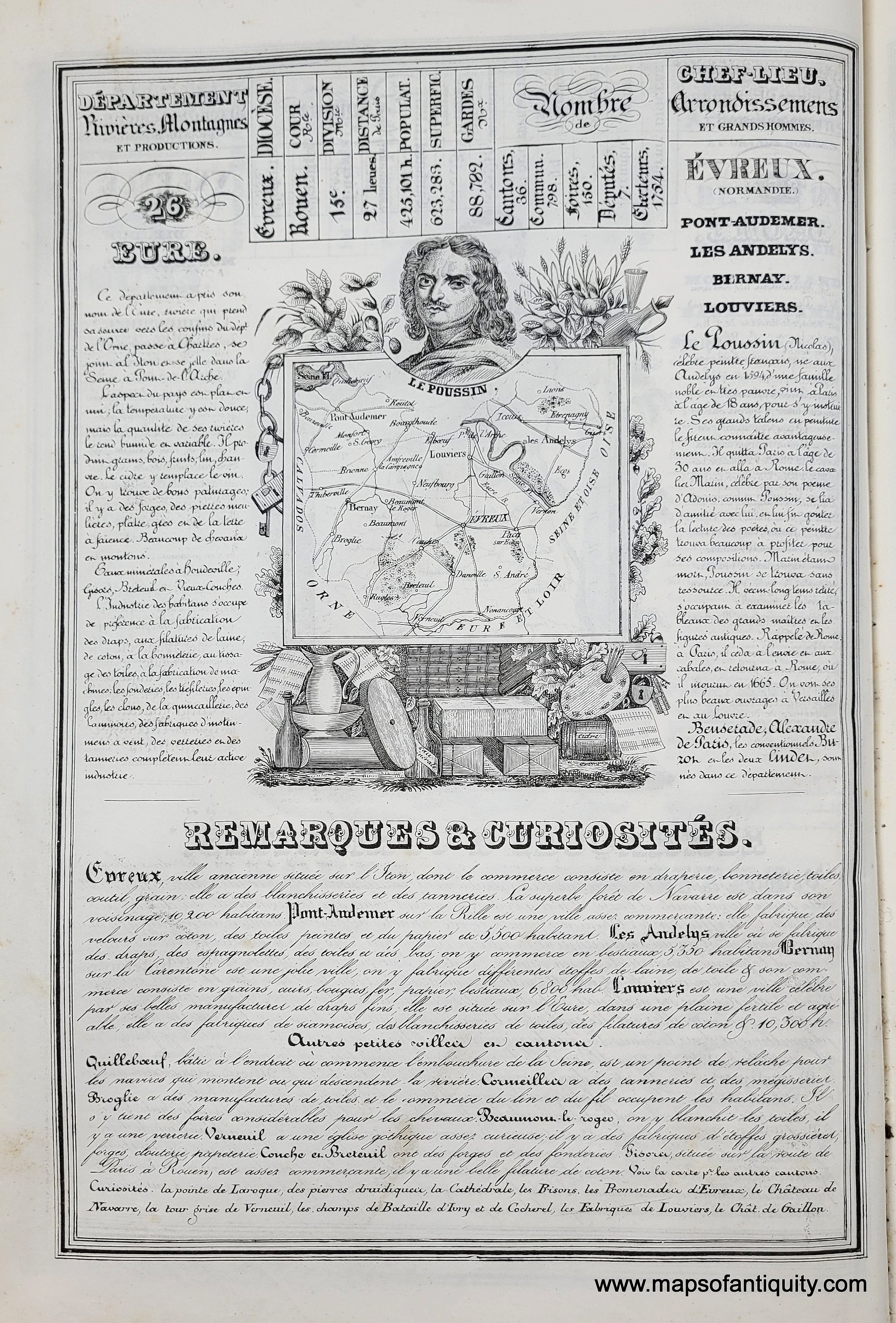 Antique double-sided page with maps of the Departments of Drome and Eure, France, published in the Nouvelle Geographie Et Statistique De La France, Alger Et La Belgique, Suivie D'Un Traite Sur Le Monde Entier... 1842 (5th edition) by Alexandre Corbin. This charming page features text relating to the statistics of the Department, including rivers, mountains, industries, notable residents, and "remarks & curiosities" as well as a small map of the region surrounded by illustrations of the local products and one notable/historical personage (Montalivet in Drome and Le Poussin in Eure). Very good antique condition with some minor stains in the margins. Paper is lightweight and the image/text on verso is slightly visible but this can be reduced by backing with a black backing when framing. Measures approx. 13.5 x 9.5 inches to the neatline.