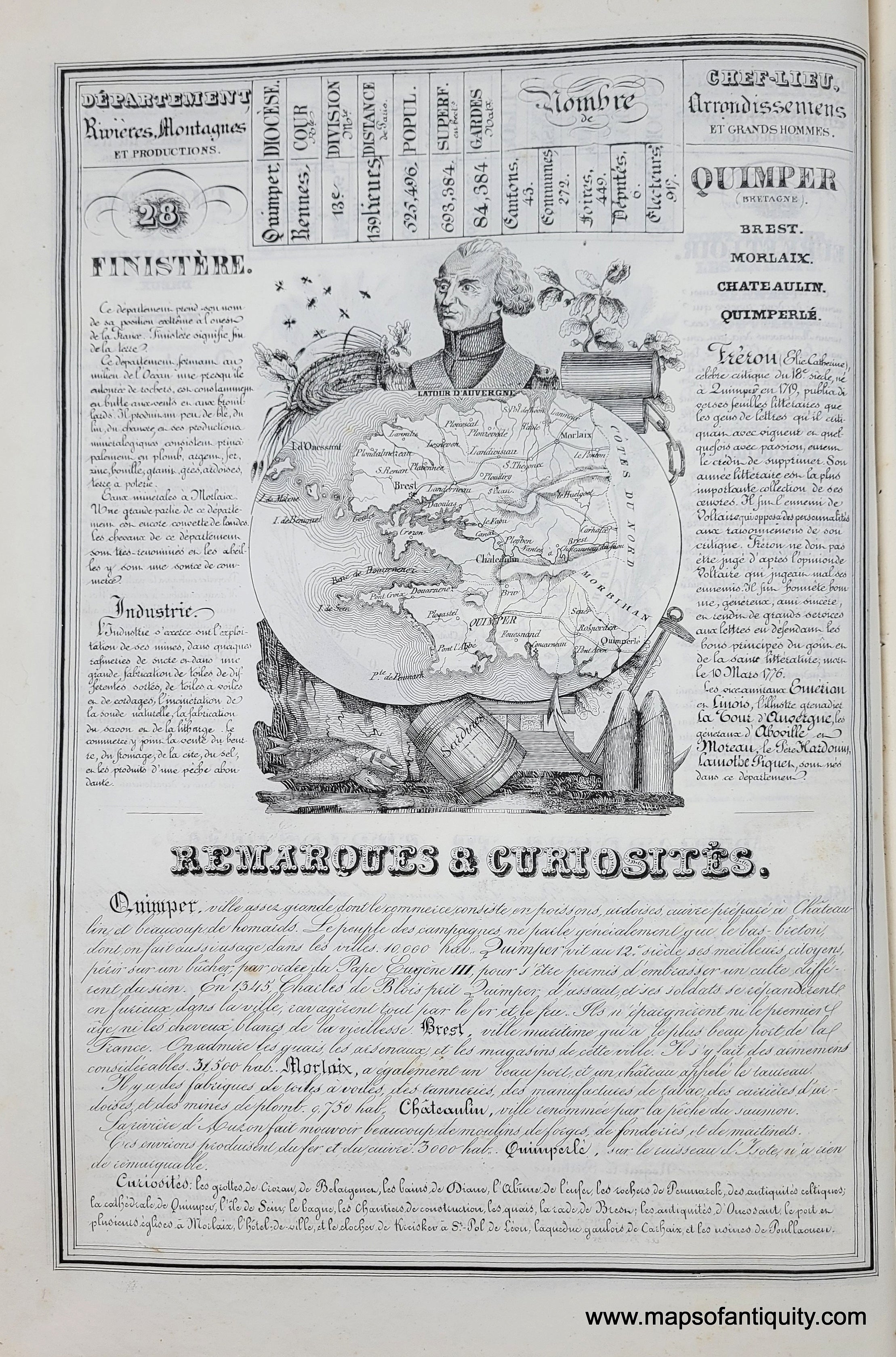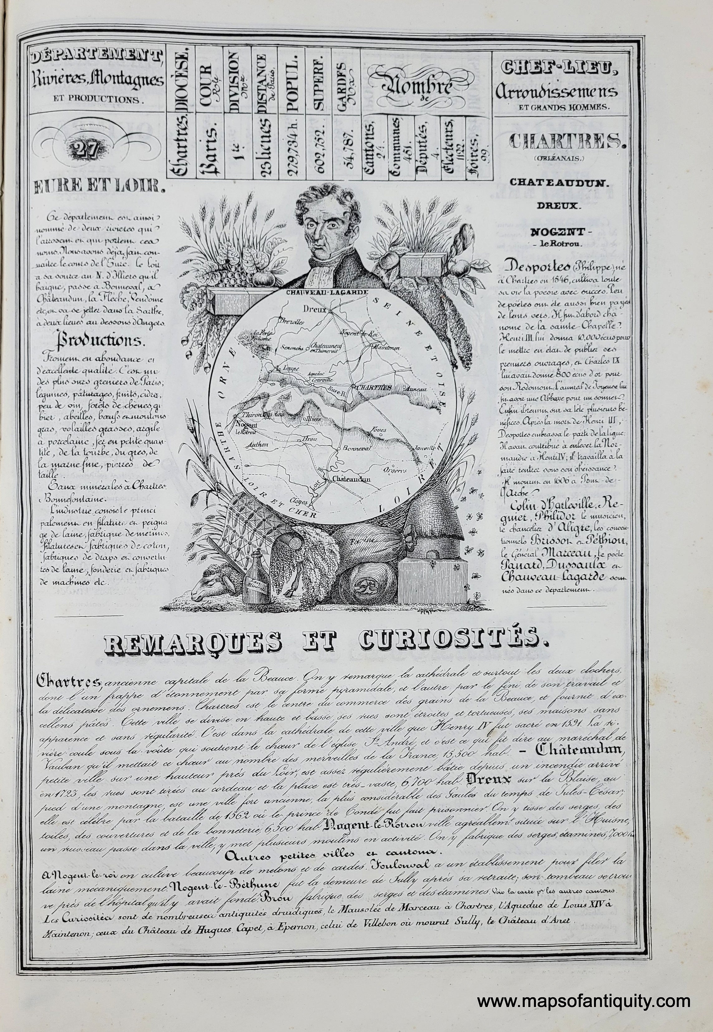 Antique double-sided page with maps of the Departments of Eure-et-Loir and Finistere, France, published in the Nouvelle Geographie Et Statistique De La France, Alger Et La Belgique, Suivie D'Un Traite Sur Le Monde Entier... 1842 (5th edition) by Alexandre Corbin. This charming page features text relating to the statistics of the Department, including rivers, mountains, industries, notable residents, and "remarks & curiosities" as well as a small map of the region surrounded by illustrations of the local products and one notable/historical personage (Chauveau-Lagarde in Eure-et-Loir and Latour d'Auvergne in Finistere). Very good antique condition with some minor stains in the margins. Paper is lightweight and the image/text on verso is slightly visible but this can be reduced by backing with a black backing when framing. Measures approx. 13.5 x 9.5 inches to the neatline.