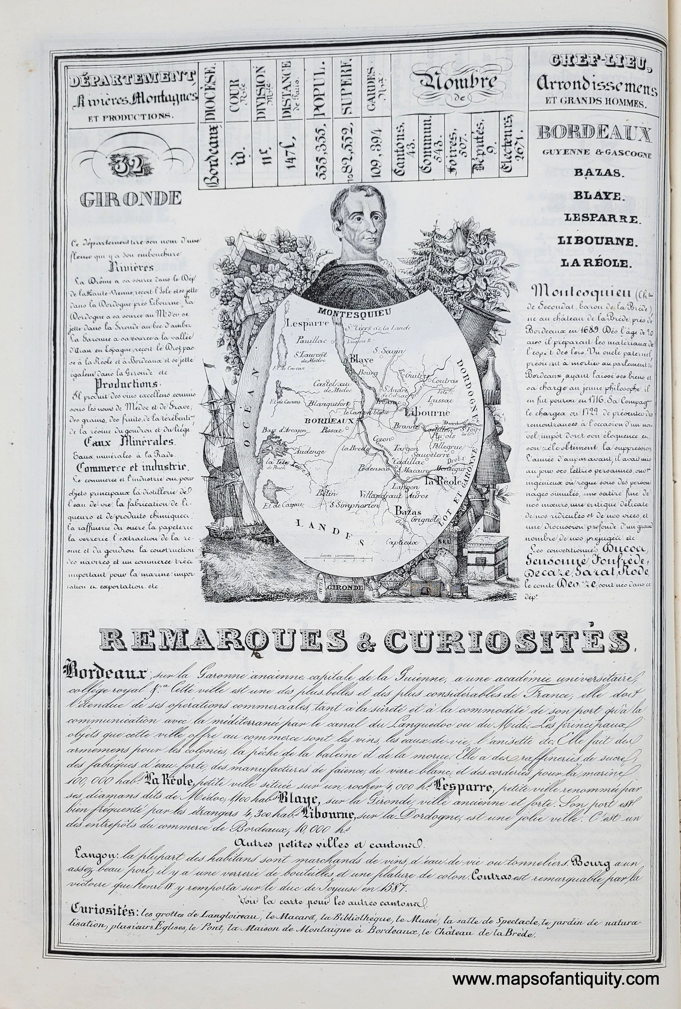 Antique double-sided page with maps of the Departments of Gers and Gironde, France, published in the Nouvelle Geographie Et Statistique De La France, Alger Et La Belgique, Suivie D'Un Traite Sur Le Monde Entier... 1842 (5th edition) by Alexandre Corbin. This charming page features text relating to the statistics of the Department, including rivers, mountains, industries, notable residents, and "remarks & curiosities" as well as a small map of the region surrounded by illustrations of the local products and one notable/historical personage (M.al. Lannes in Gers and Montesquieu in Gironde). Very good antique condition with some minor stains in the margins. Paper is lightweight and the image/text on verso is slightly visible but this can be reduced by backing with a black backing when framing. Measures approx. 13.5 x 9.5 inches to the neatline.