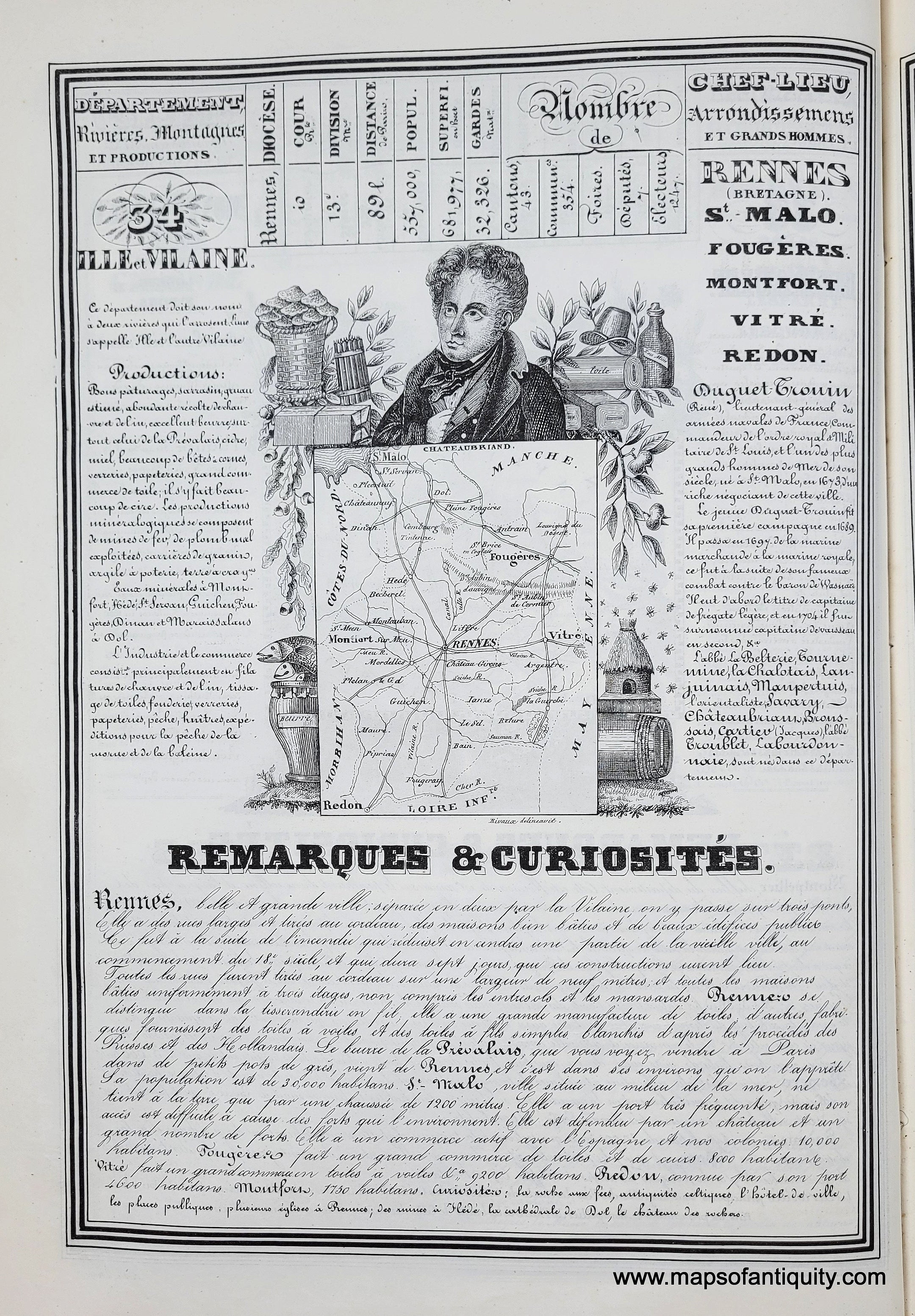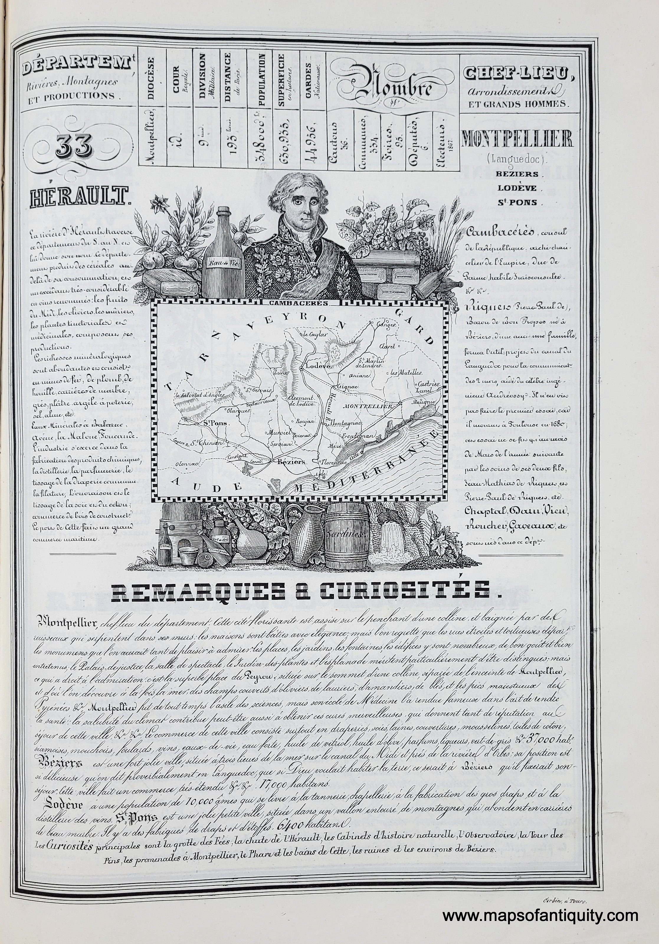 Antique double-sided page with maps of the Departments of Herault and Ille et Vilaine, France, published in the Nouvelle Geographie Et Statistique De La France, Alger Et La Belgique, Suivie D'Un Traite Sur Le Monde Entier... 1842 (5th edition) by Alexandre Corbin. This charming page features text relating to the statistics of the Department, including rivers, mountains, industries, notable residents, and "remarks & curiosities" as well as a small map of the region surrounded by illustrations of the local products and one notable/historical personage (Cambaceres in Herault and Chateaubriand in Ille et Vilaine). Very good antique condition with some minor stains in the margins. Paper is lightweight and the image/text on verso is slightly visible but this can be reduced by backing with a black backing when framing. Measures approx. 13.5 x 9.5 inches to the neatline.