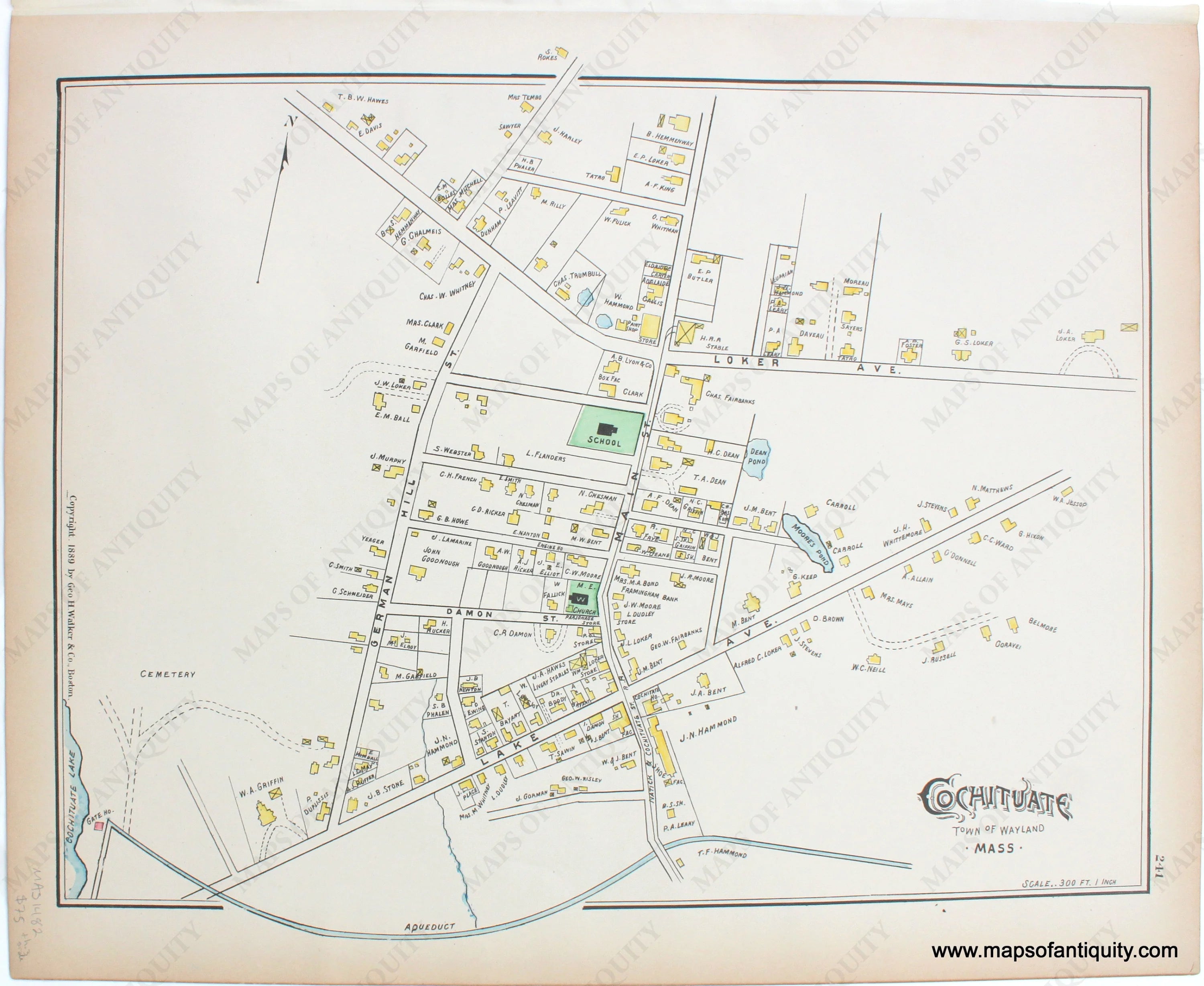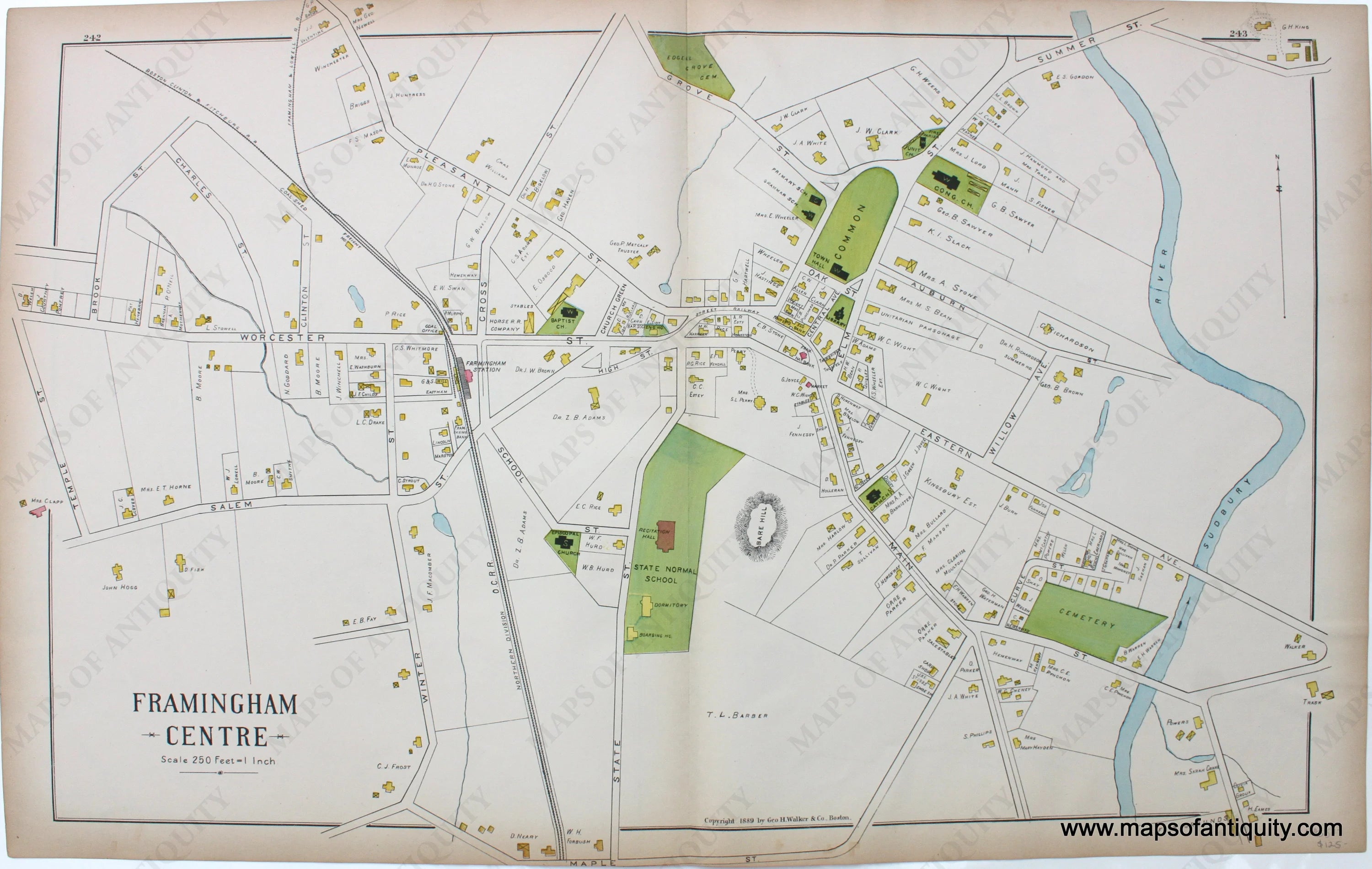 Antique double-sided page of maps from the Atlas of Middlesex County, Massachusetts, 1889, by Walker. Larger centerfold map is Framingham center showing property owners, named streets, churches, State Normal School and other schools, railroad and station, Sudbury River. Verso maps are the towns of Stow, Hudson and Marlborough with property owners (densely populated areas enlarged separately) on one side and Cochituate, part of Wayland, on the other side. Good to very good condition, centerfold map measures approx. 16 x 26 inches, verso maps approx. 12 x 16 inches.