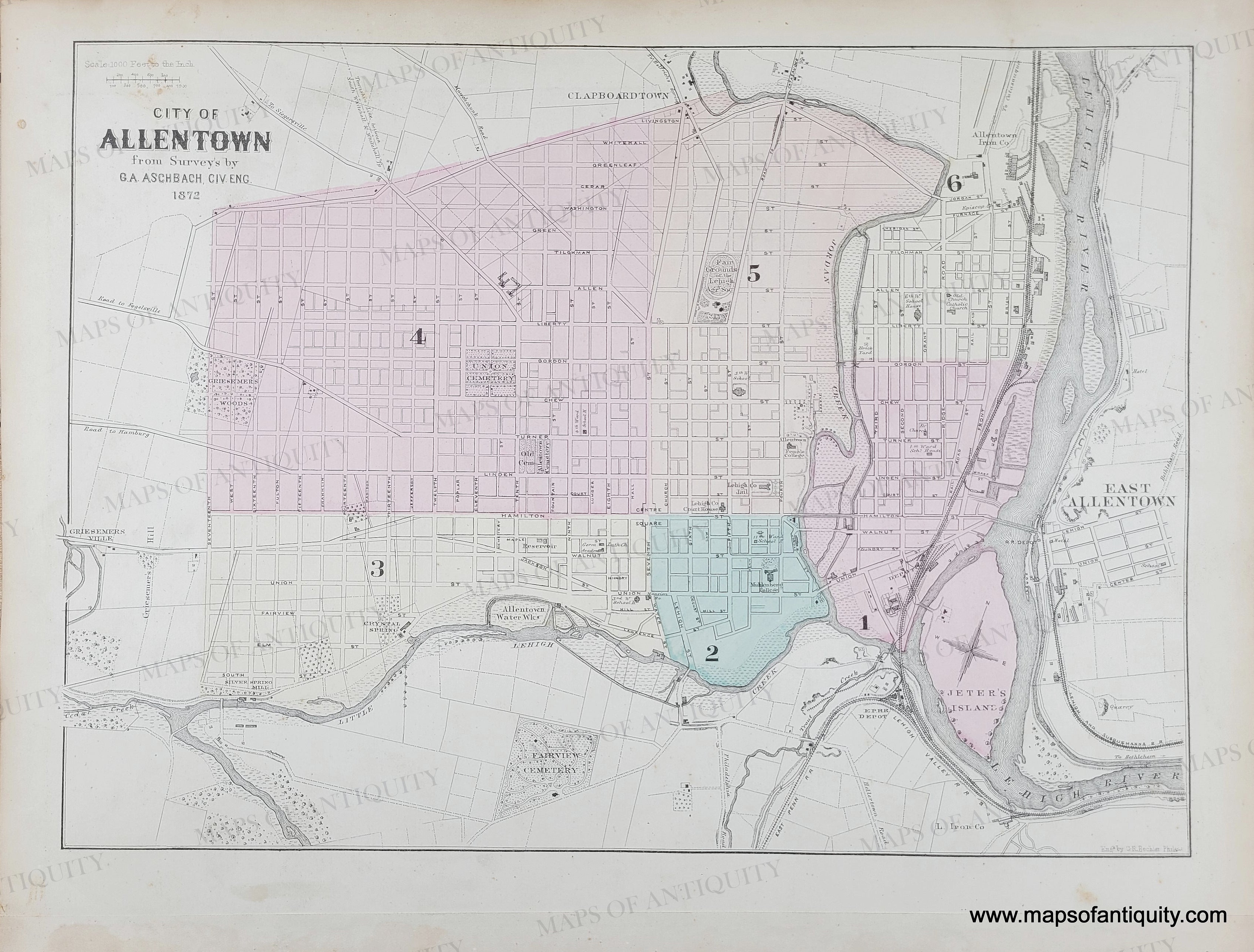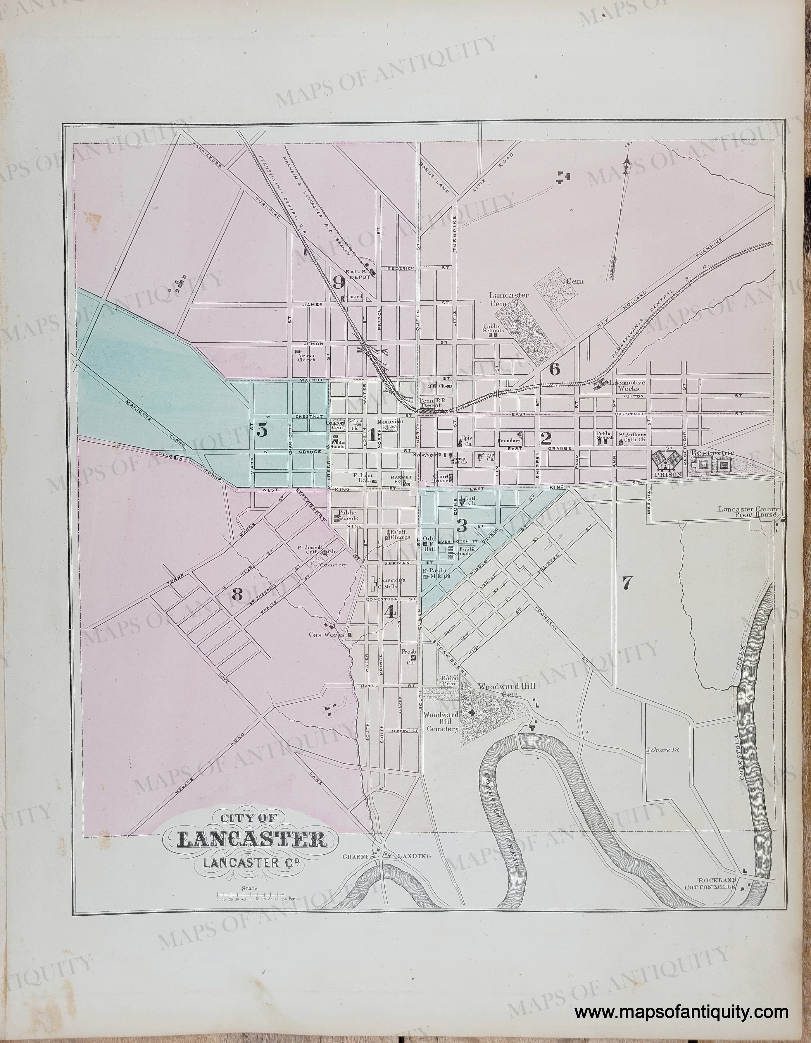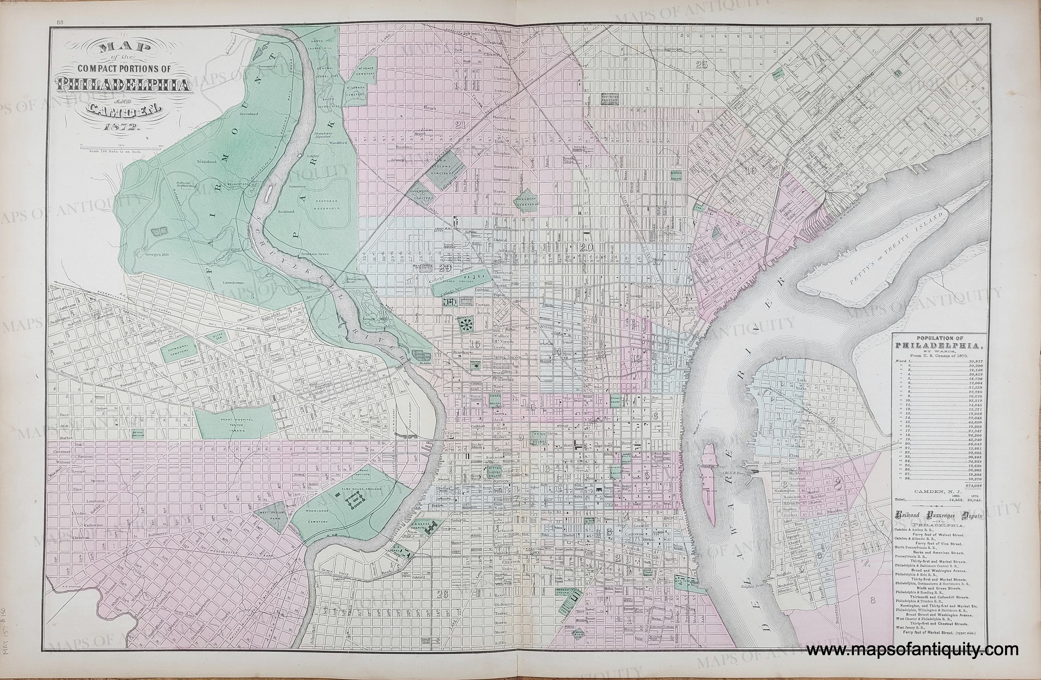 Double-sided page of maps. This antique, hand-colored page of maps was published in the 1872 "New Topographical Atlas of the State of Pennsylvania with Descriptions Historical, Scientific, and Statistical," by Walling and Gray. This map shows street names, important structures, major features, and details railroad stations and parks. Inset chart shows population by ward. This is a double-sided sheet: the centerfold map is Philadelphia and the back sides are City of Lancaster and City of Allentown. This map is in very good antique condition overall, with some minor stains in margin. Philadelphia map measures approximately 17.5 x 26.5 inches. Verso maps are approx. 13 x 12 inches to the neatline.