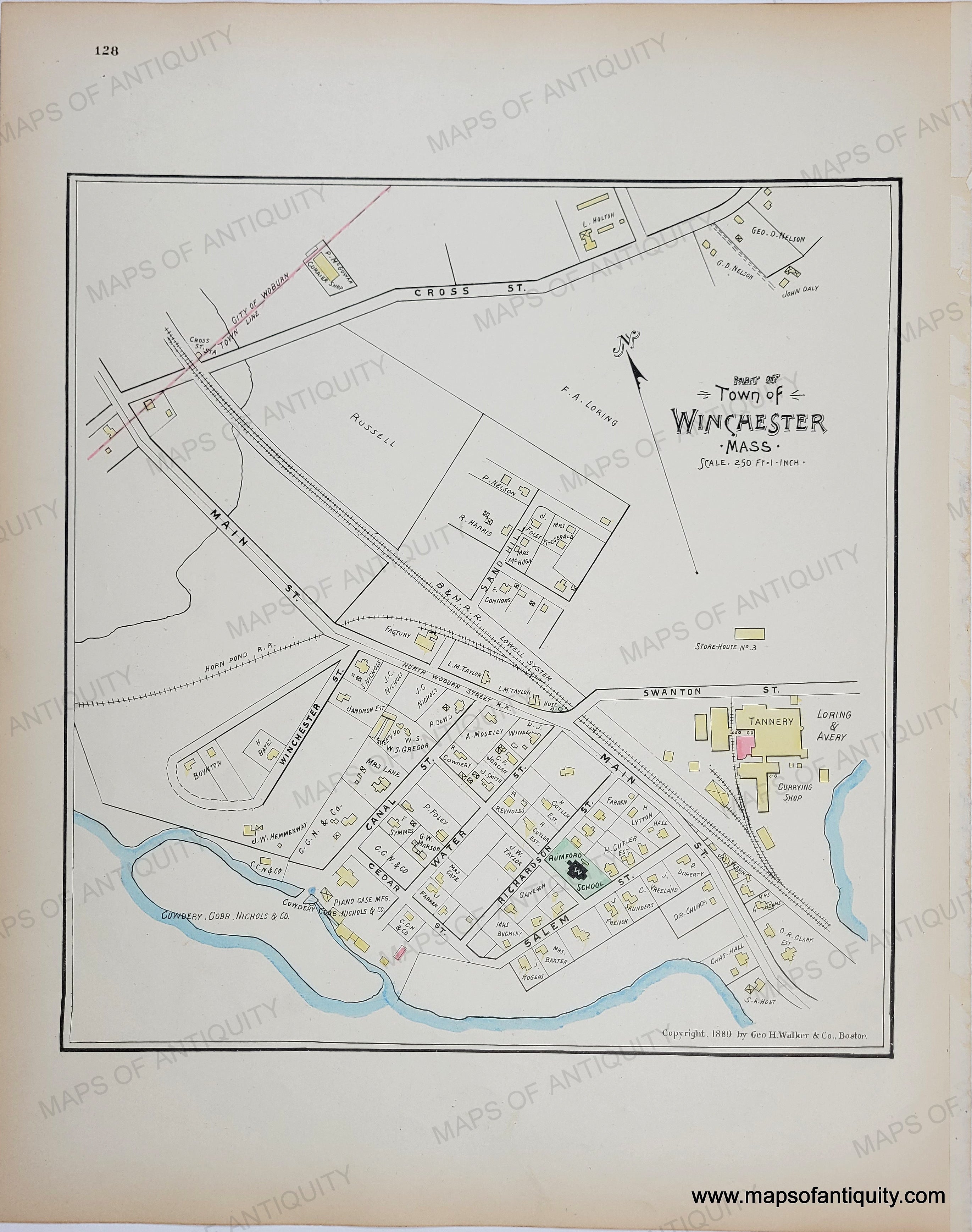 Antique double-sided page from the Atlas of Middlesex County, MA, 1889, by Walker. Larger centerfold map is part of Winchester near Wildwood Cemetery. On the versos are a map of the towns of Winchester, Arlington, Belmont, and Watertown on one side and a map of another part of Winchester on the other side. Very good overall antique condition, centerfold map measures approx. 16 x 26 inches, flatten nicely when framed.