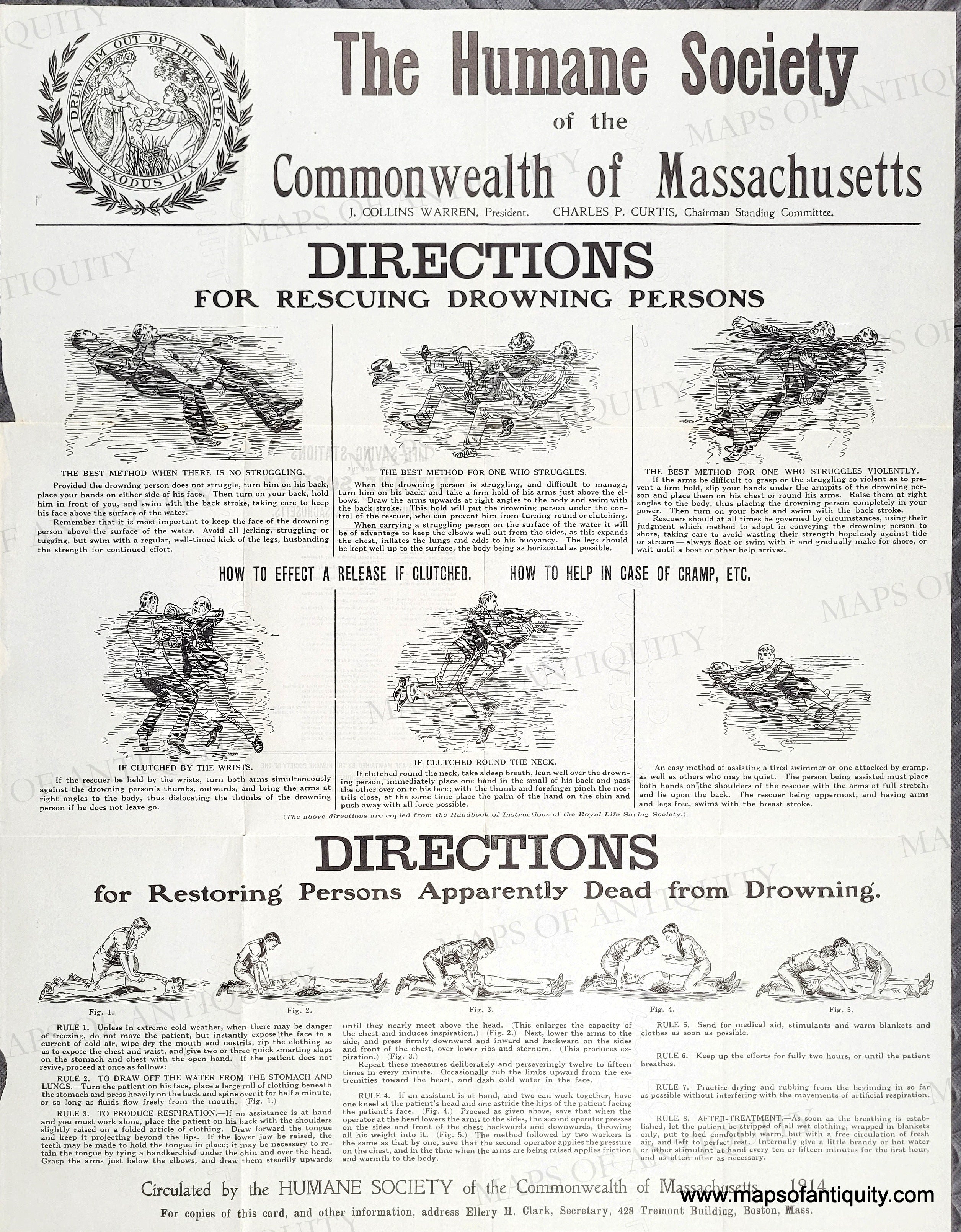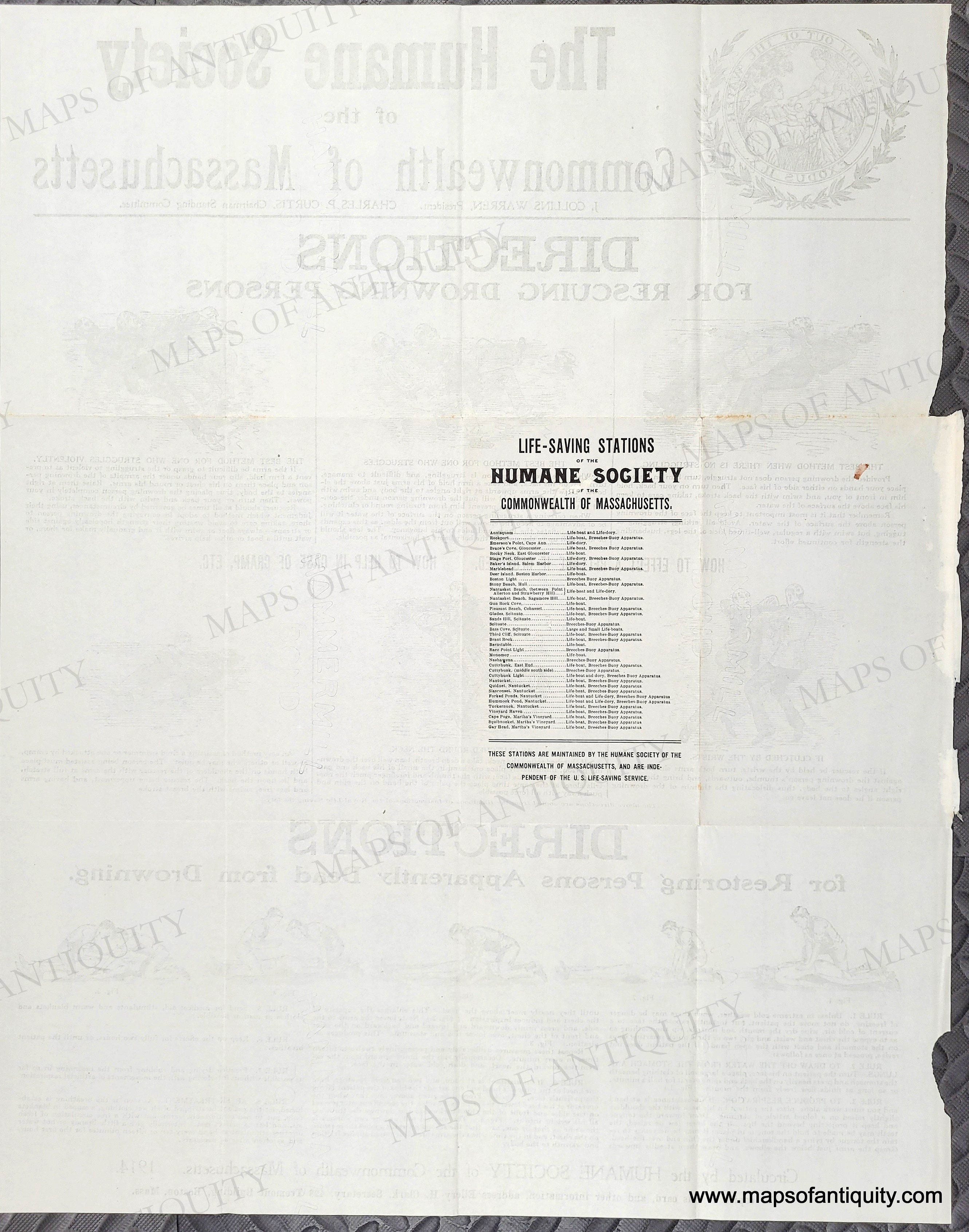 Antique lifesaving broadside from 1914 published by the Humane Society of the Commonwealth of Massachusetts. The Massachusetts Humane Society was founded in 1786 by a group of Boston citizens who desired to reduce needless deaths resulting from shipwrecks and drownings. It was based on a similar organization established in Great Britain in 1774. Its first lifesaving activities consisted of publishing procedures for dealing with victims of shipwreck and other water-related accidents, and the placement of lifesaving equipment, lifeboats, and shelters on the islands and coast of Massachusetts Bay. This impressive and rare broadside illustrates lifesaving procedures to rescue a drowning person or to revive a person "apparently dead from drowning." The figures are dressed in ways that suggest the story of their accident, some as mariners perhaps victims of shipwreck, some in swimming clothes, and some in daily clothing who may have fallen into the water by accident or been passengers on a wrecked ship. The Massachusetts Humane Society was also crucial in the creation of several Boston hospitals and continues to operate, offering awards to rescuers and grants to programs that educate and train people to save lives. This broadside is both visually and intellectually interesting, and an important part of Massachusetts's maritime history. Very good antique condition with folds as issued and some minor wear on the left side. Measures approx. 26 x 20.5 inches to the paper edges.