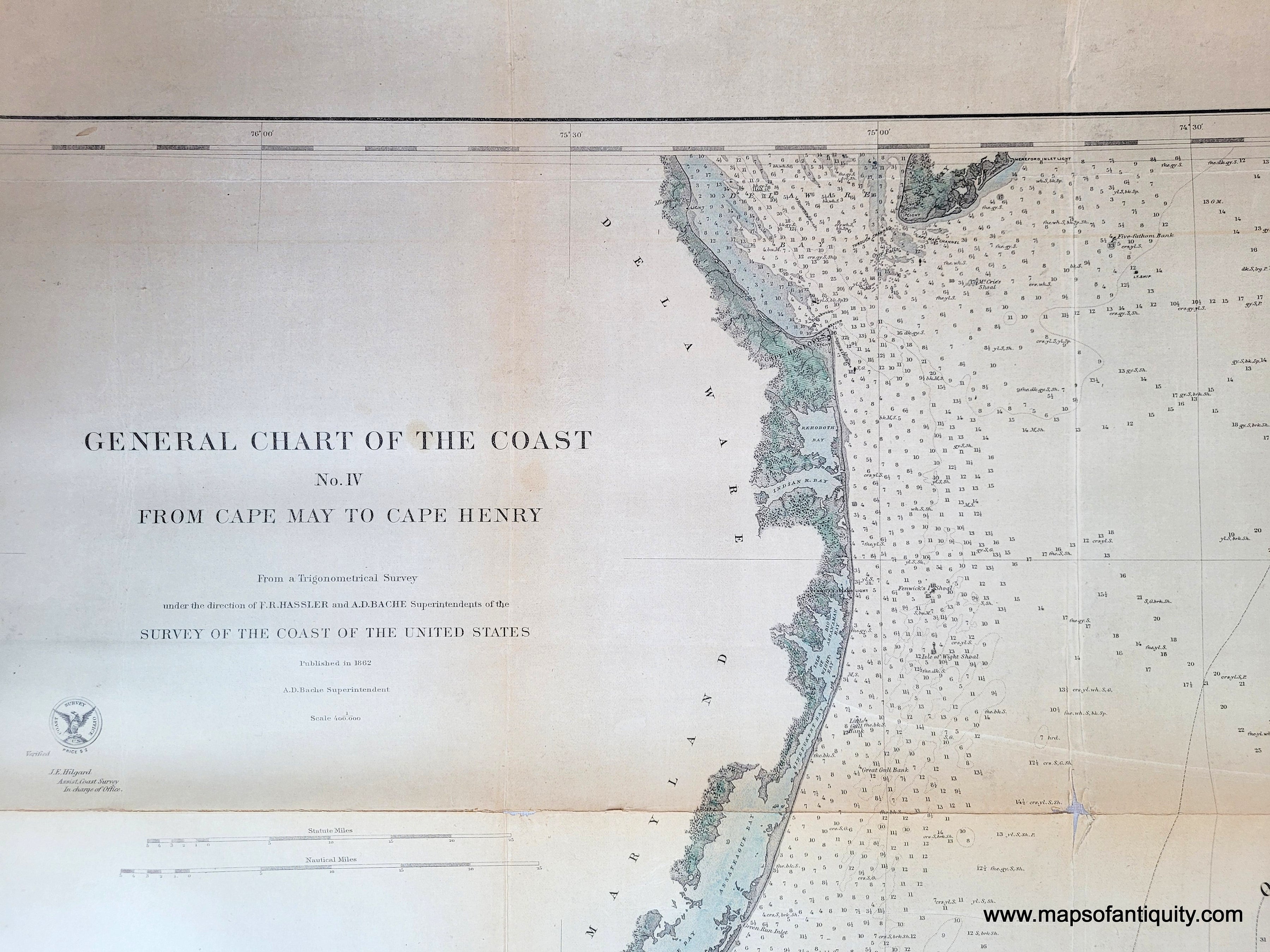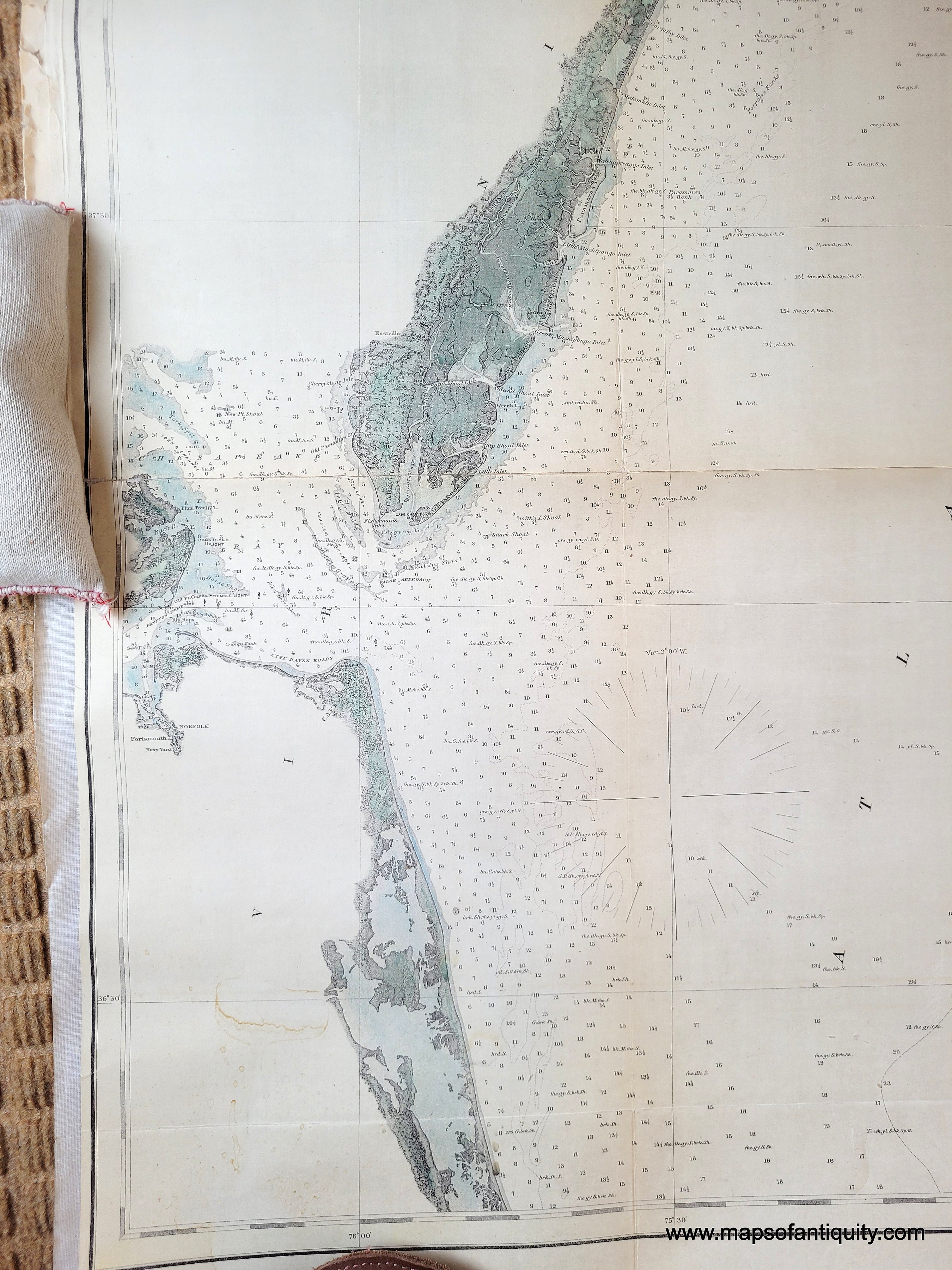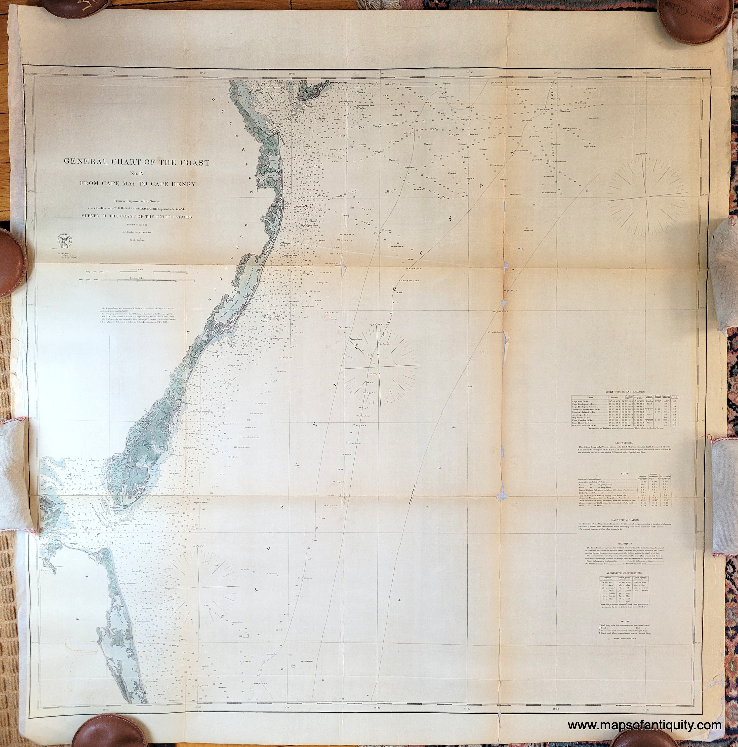 Antique coastal chart of the coasts of Delaware, Maryland, and Virginia, from Cape May to Cape Henry. Includes significant coastal details, bathymetric data, as well as information on tides, light houses, beacons and light vessel. The date near the title indicates the chart was published in 1862, however we know this chart was published later because there is a note in the lower right saying the buoys were corrected up to 1874. Recent hand-coloring. Fair condition, has been patched with canvas backing, overall toning, toning along fold lines, several holes along fold line that have been patched by overall canvas backing. Priced as is, measures approx. 31.5 x 33 inches. Apologies for the poor lighting in the photos. Additional photos can be taken on request.