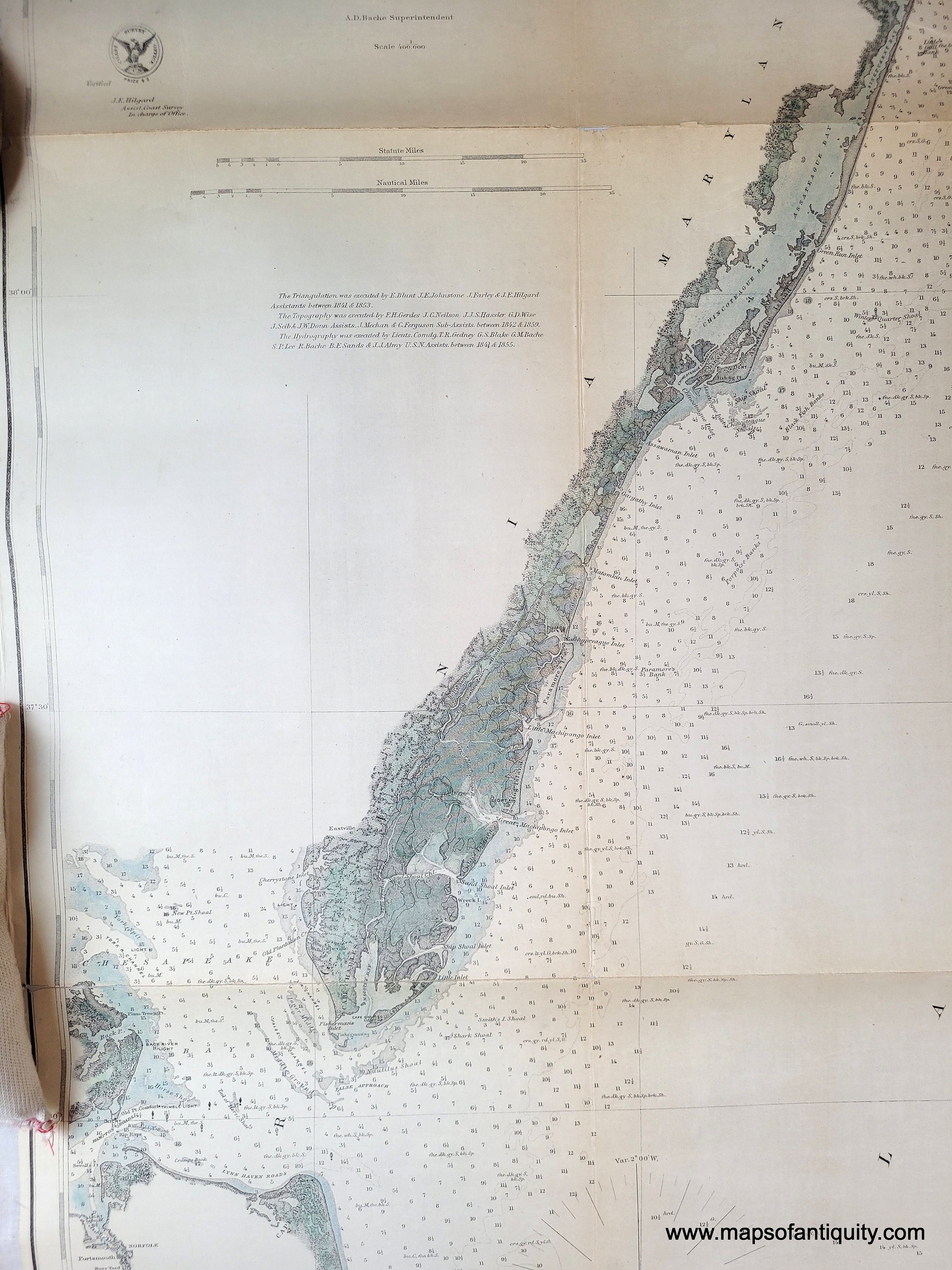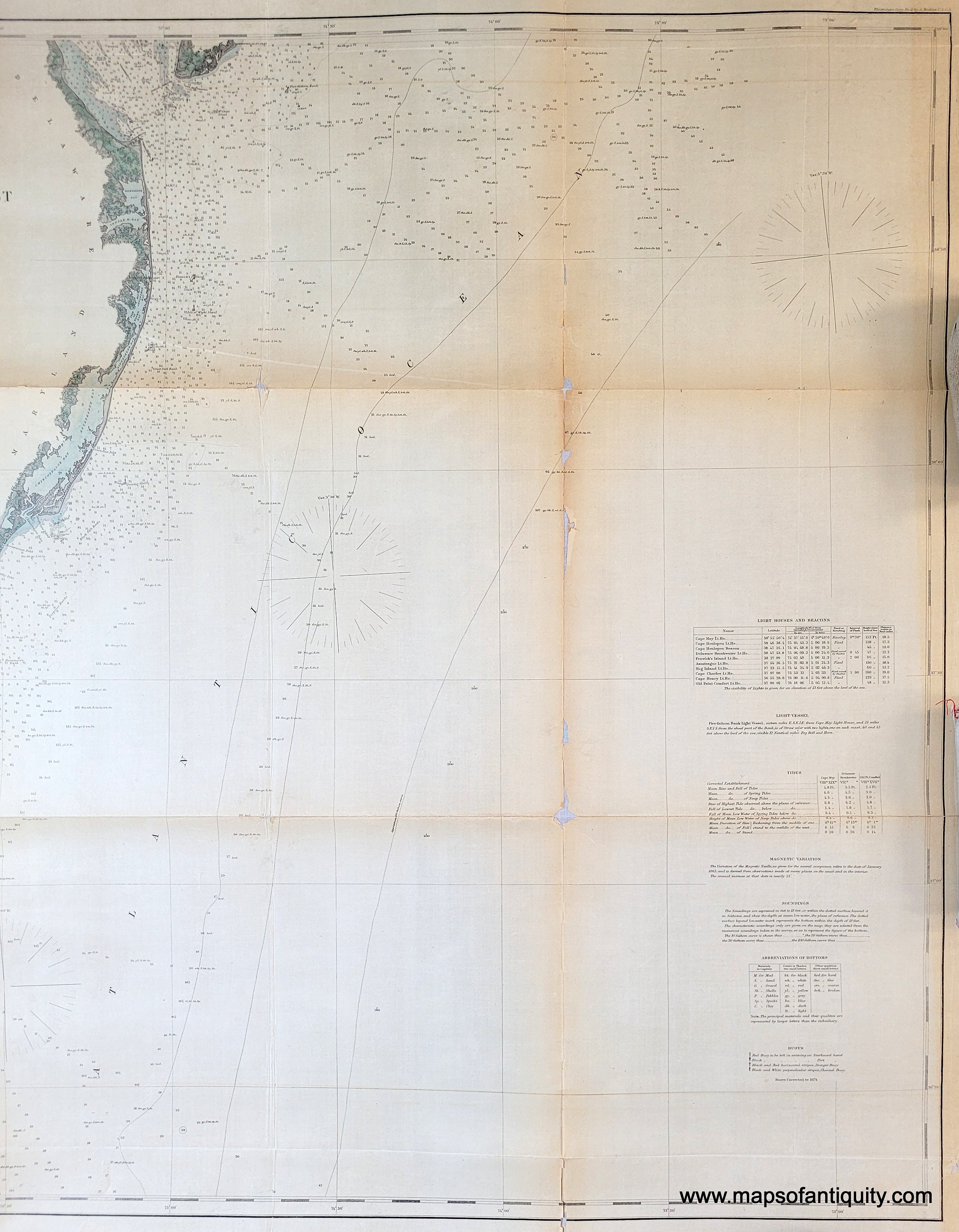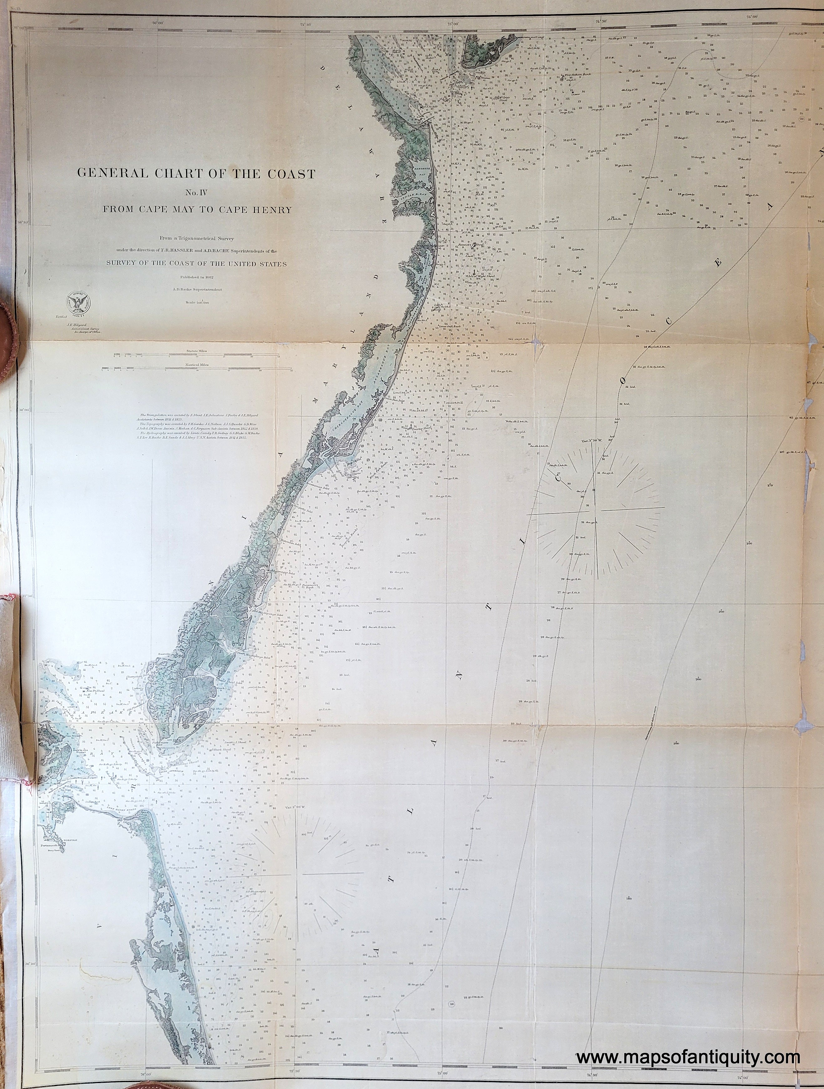 Antique coastal chart of the coasts of Delaware, Maryland, and Virginia, from Cape May to Cape Henry. Includes significant coastal details, bathymetric data, as well as information on tides, light houses, beacons and light vessel. The date near the title indicates the chart was published in 1862, however we know this chart was published later because there is a note in the lower right saying the buoys were corrected up to 1874. Recent hand-coloring. Fair condition, has been patched with canvas backing, overall toning, toning along fold lines, several holes along fold line that have been patched by overall canvas backing. Priced as is, measures approx. 31.5 x 33 inches. Apologies for the poor lighting in the photos. Additional photos can be taken on request.