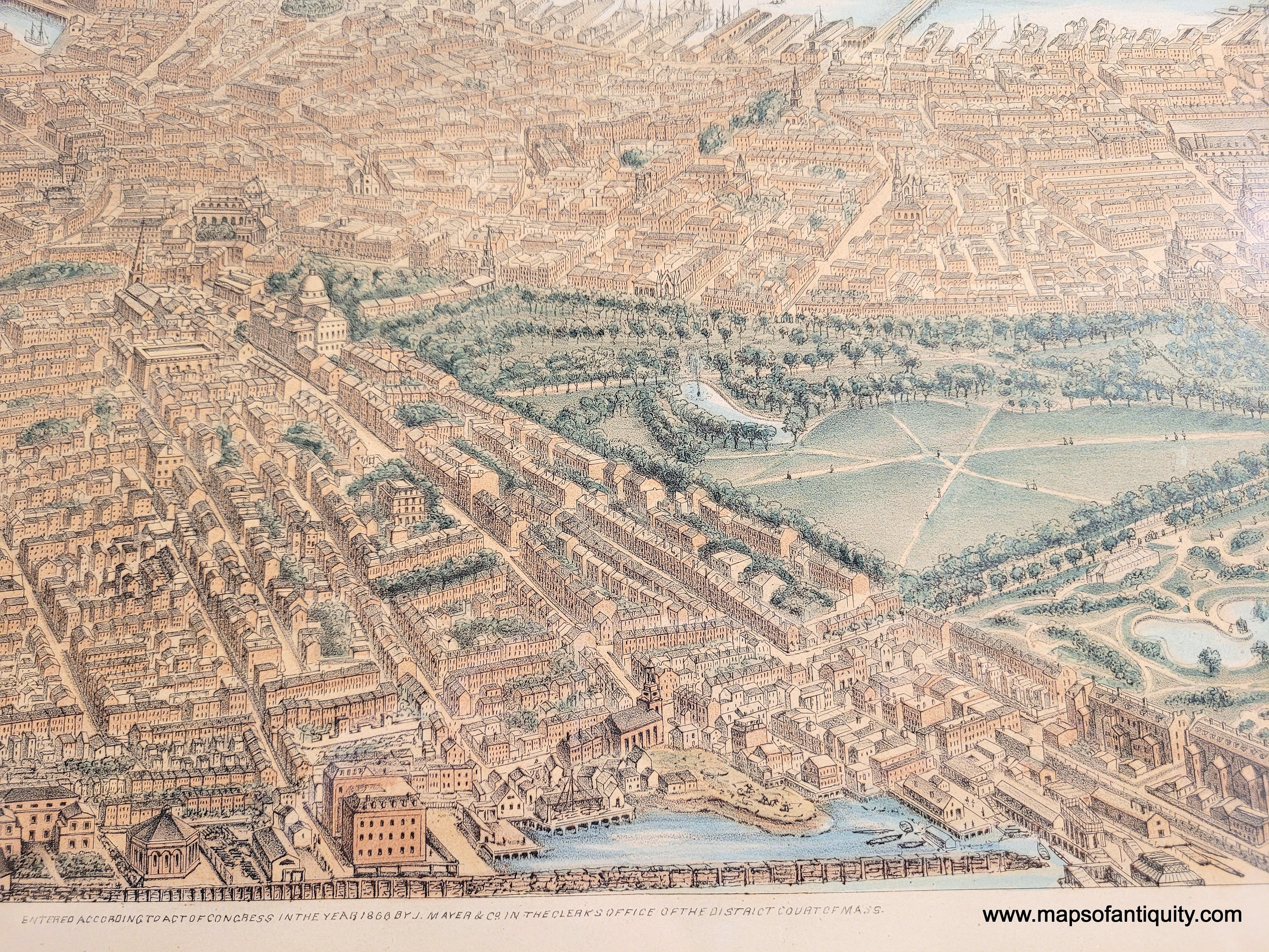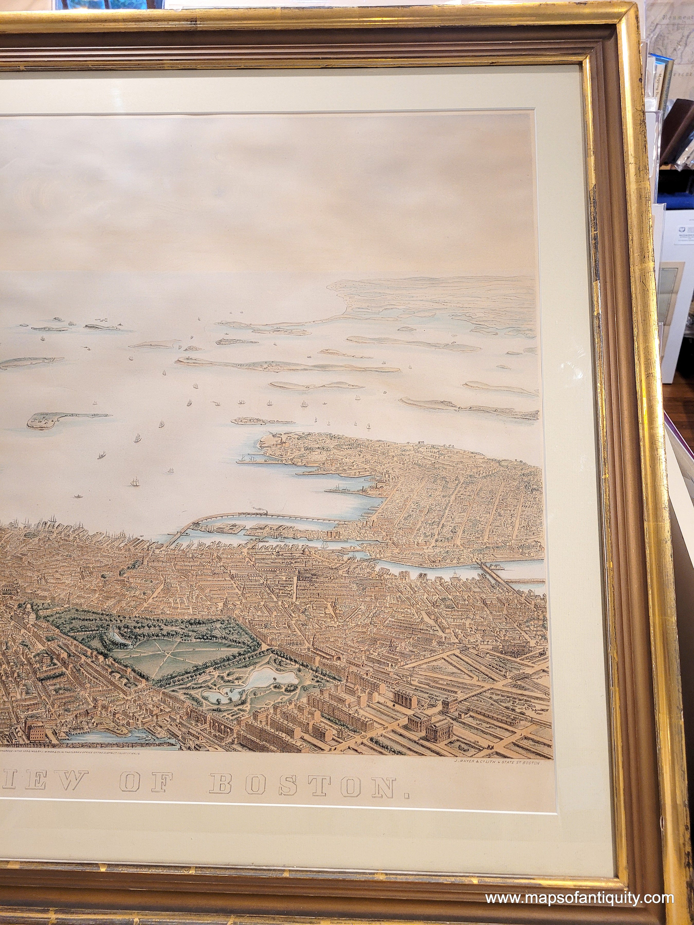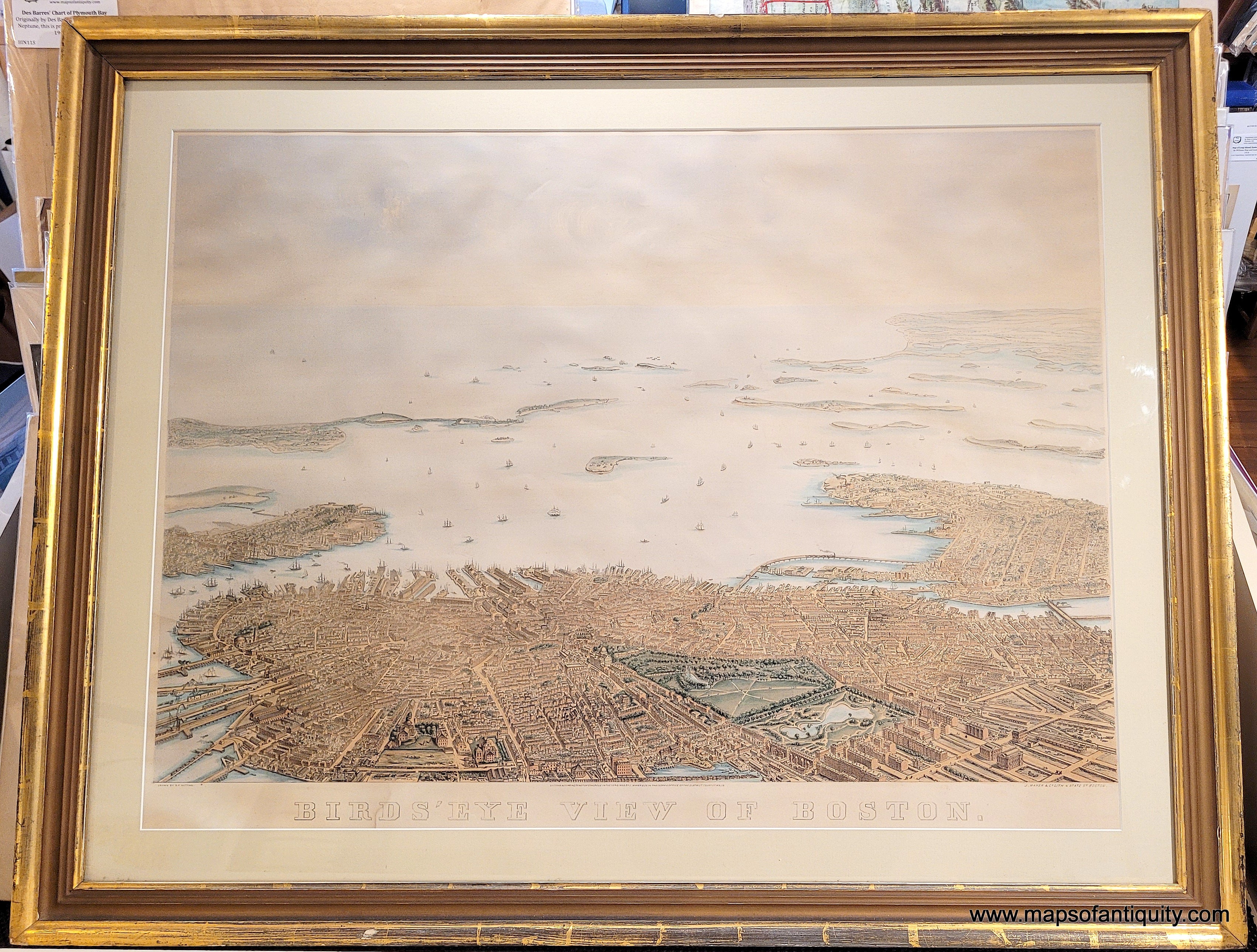 Framed rare map of boston, massachusetts, from a bird's eye view looking east over the city and harbor, framed in gold. beautiful subtle original color in warm brown tan for the buildings, green for the parks, blue in the water. Antique old original map by Nutting, Mayer, Russell 1866. Genuine-Antique-Map-Framed-Birds-Eye-View-of-Boston-1886-Nutting-Mayer-Russell-Maps-Of-Antiquity