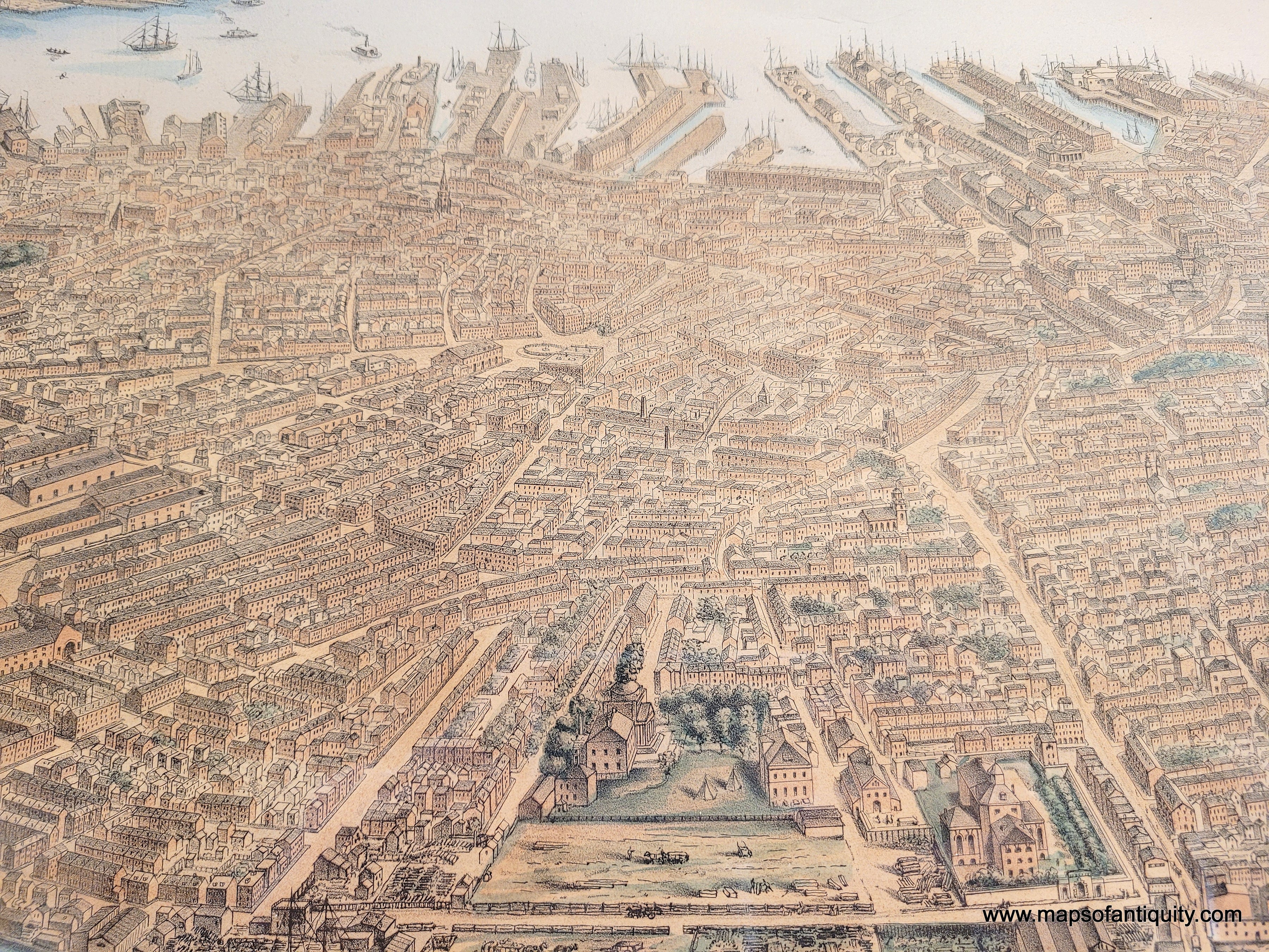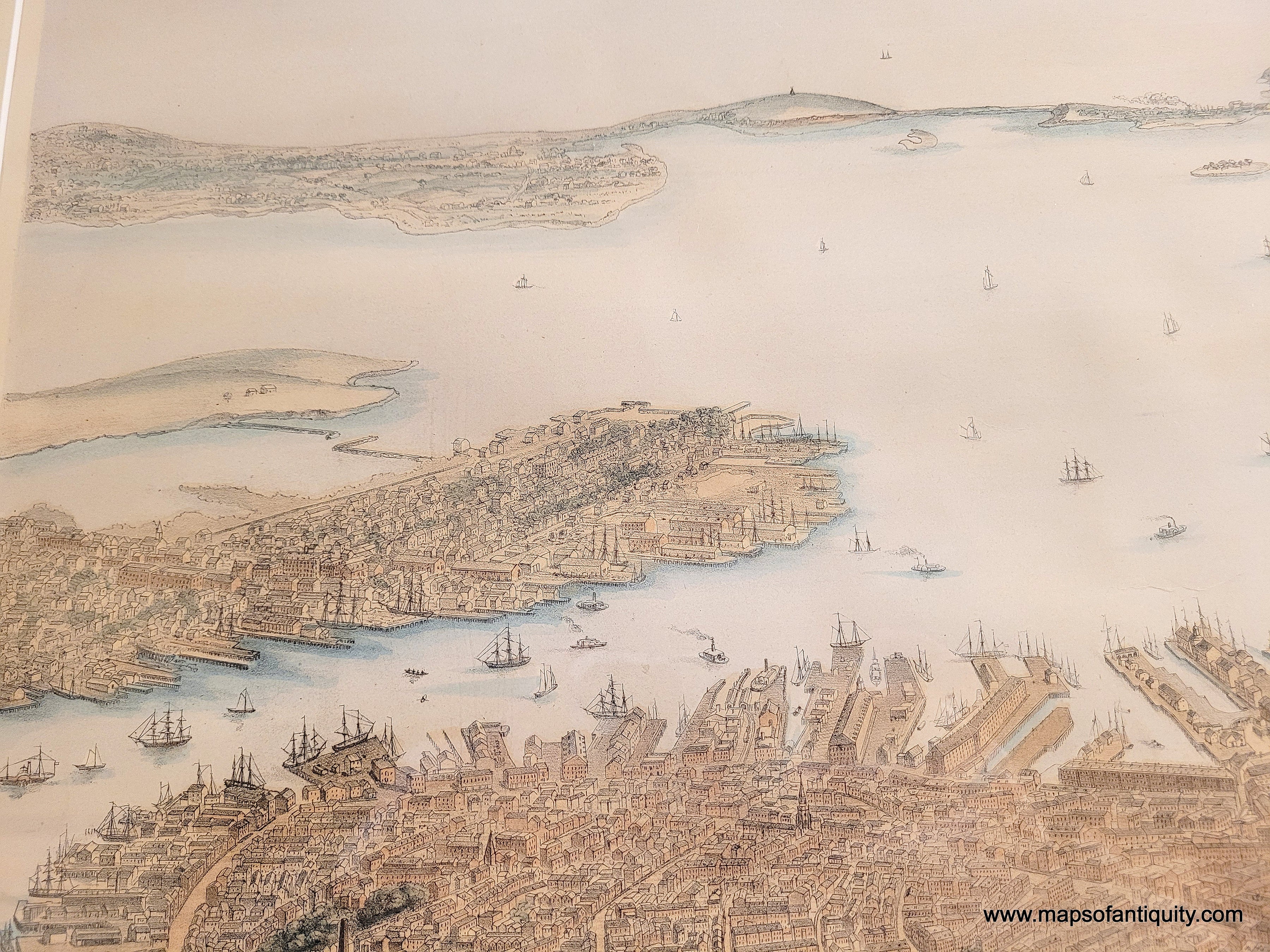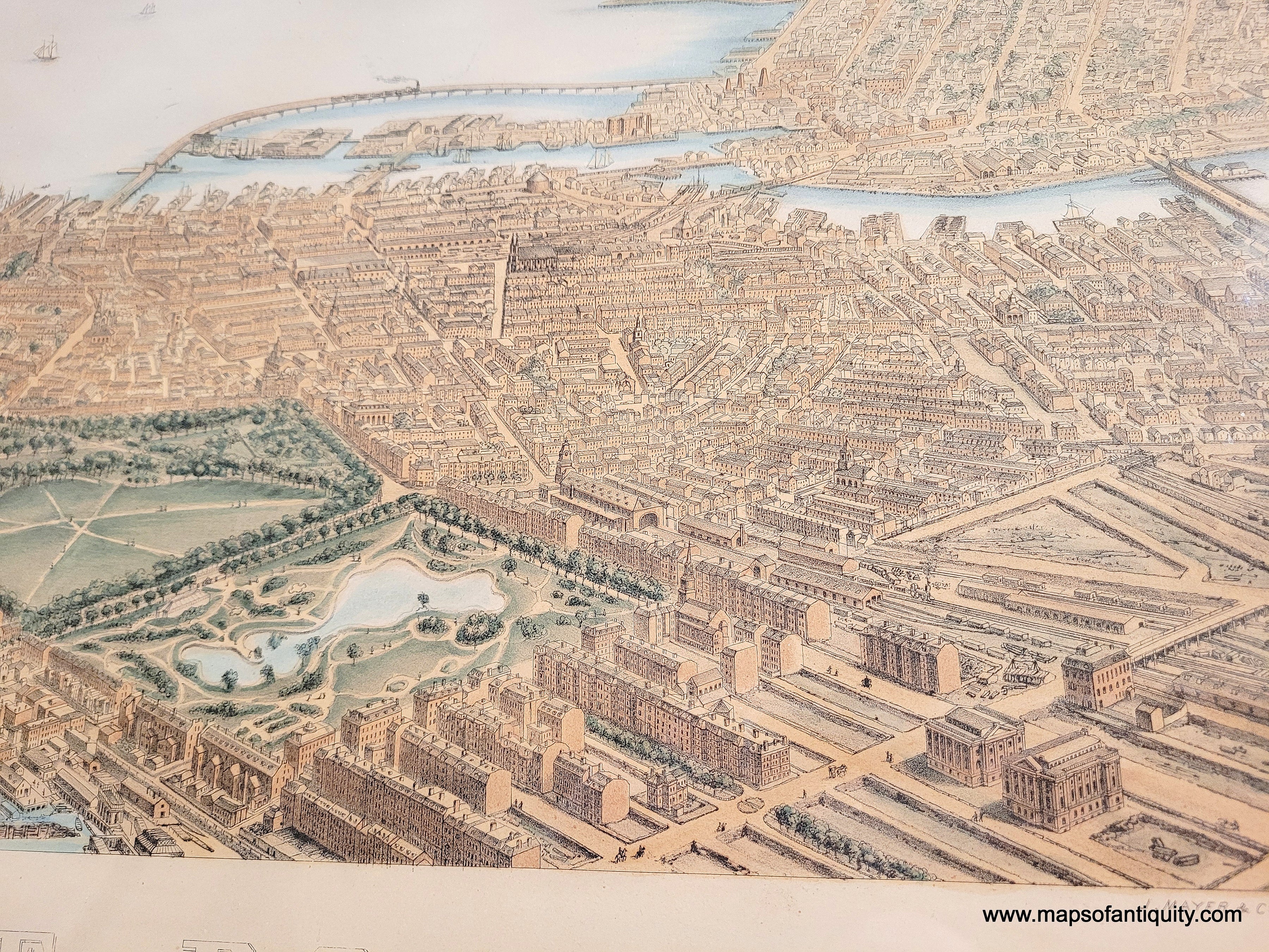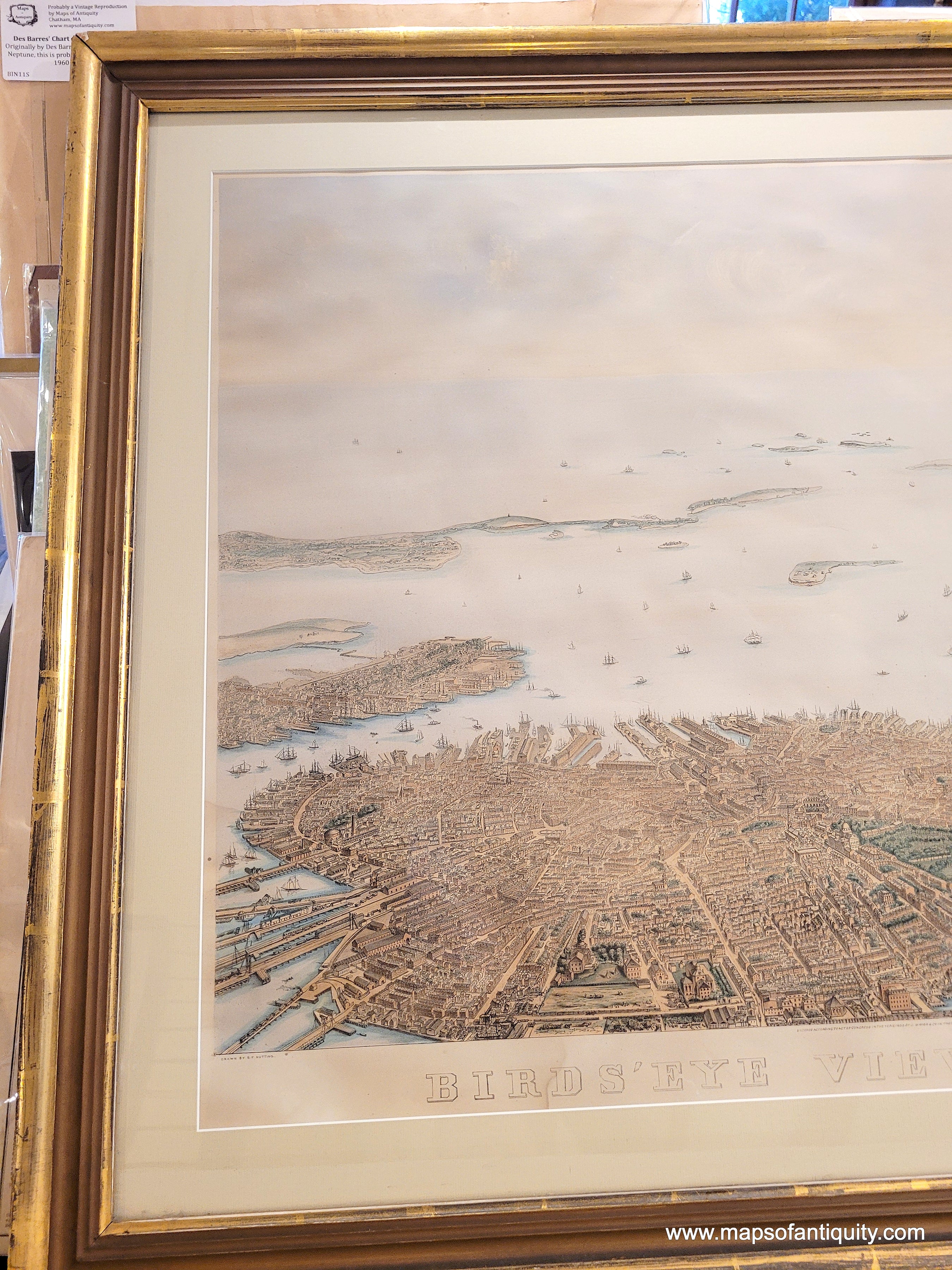 Framed rare map of boston, massachusetts, from a bird's eye view looking east over the city and harbor, framed in gold. beautiful subtle original color in warm brown tan for the buildings, green for the parks, blue in the water. Antique old original map by Nutting, Mayer, Russell 1866. Genuine-Antique-Map-Framed-Birds-Eye-View-of-Boston-1886-Nutting-Mayer-Russell-Maps-Of-Antiquity