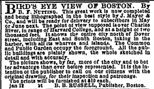 Advertisement for a bird's eye view of Boston by B. F. Nutting, published by B. B. Russell.