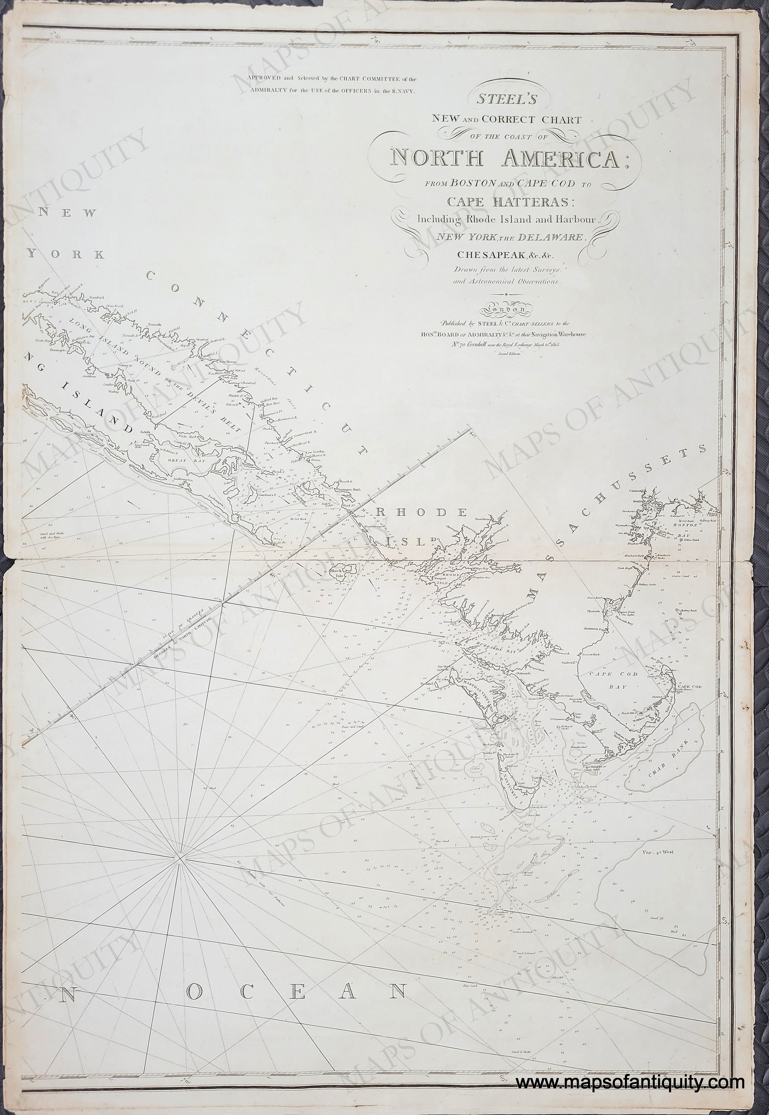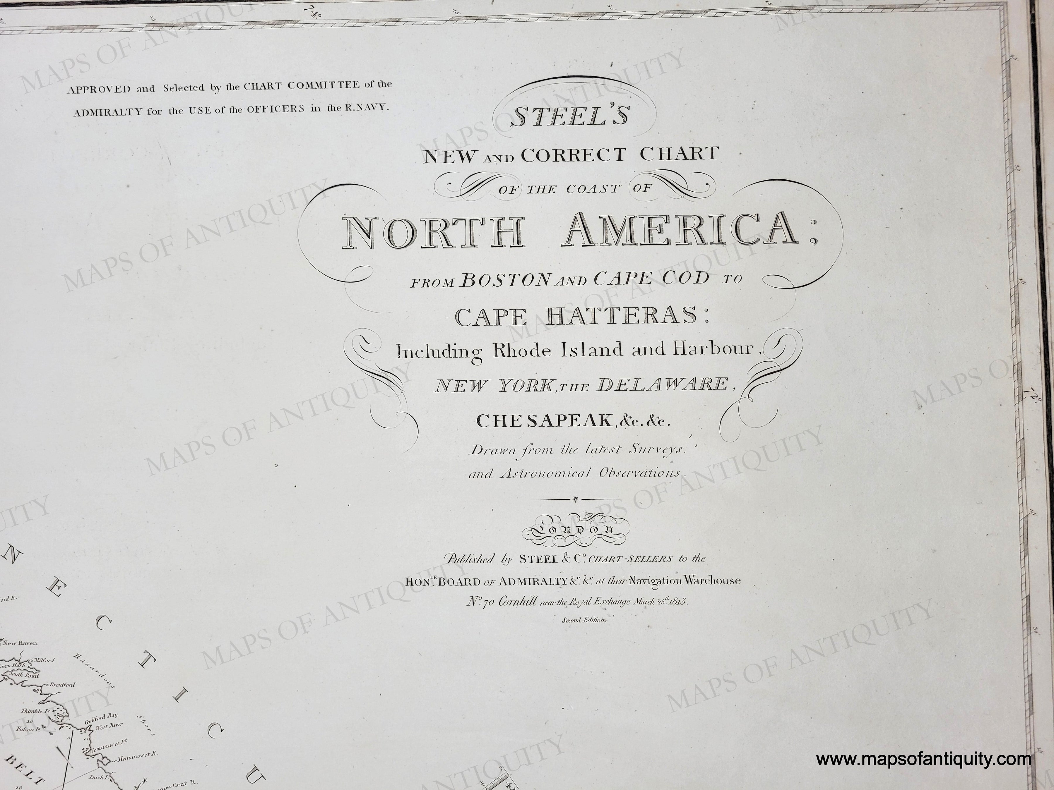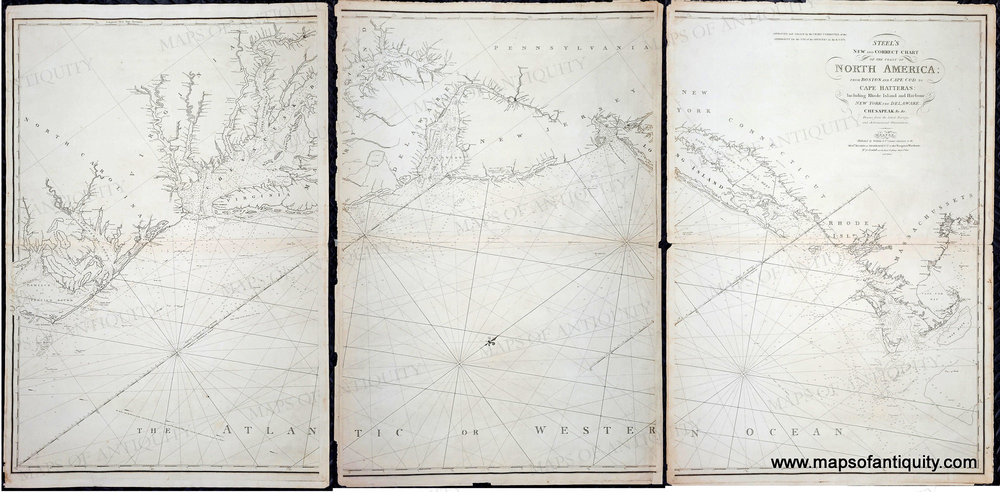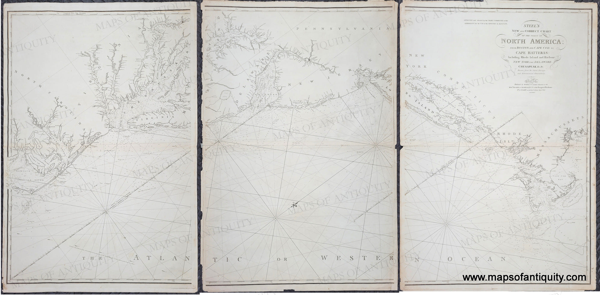 Rare set of three antique nautical charts of the East Coast of the United States from Boston to Cape Hatteras North Carolina, published in 1813 by Steel & Co. (Penelope Steel). Shows soundings, shoals, harbors, rhumb lines, etc. These charts were "Approved and Selected by the Chart Committee of the Admiralty for the use of the Officers in the Royal Navy." Includes Boston Harbor, Cape Cod, Martha's Vineyard, Nantucket in Massachusetts; Narragansett in Rhode Island; Long Island Sound between Connecticut and Long Island, New York City and harbor with Manhattan Island; Barnegat Bay on the New Jersey coast; Delaware Bay and River to Philadelphia; Chesapeake Bay between Virginia and Maryland and the many rivers leading to Baltimore, Washington DC, Fredericksburg, etc.; Albemarle Sound, Pamlico Sound, and part of the Outer Banks of North Carolina. The Steel company was started by David Steel senior. The company was taken on by David Steel junior when his father died in 1799. When David Steel Junior died in 1803 at the age of 39, his wife Penelope continued the business. She remarried in 1806, with her new husband George Mason also becoming her business partner. In 1814 she partnered with Stanley Goddard and by 1819 the company was bankrupt and all of their materials were sold to J.W. Norie & Company. Steel charts are extremely rare, with very few examples appearing on the market. These charts are in very good condition. A previous owner did some light restoration including closing tears and reinforcing the center folds. The charts exhibit some signs of age with minor wear and paper loss at edges in the margins, some mild stains, slight toning along the center fold. These charts could be joined to create one long chart or framed separately. Each chart measures approx. 36.5 x 24.5 inches to the border lines (neatline). The border is not continuous on each chart, rather it is done so that it would be continuous if the charts were joined.
