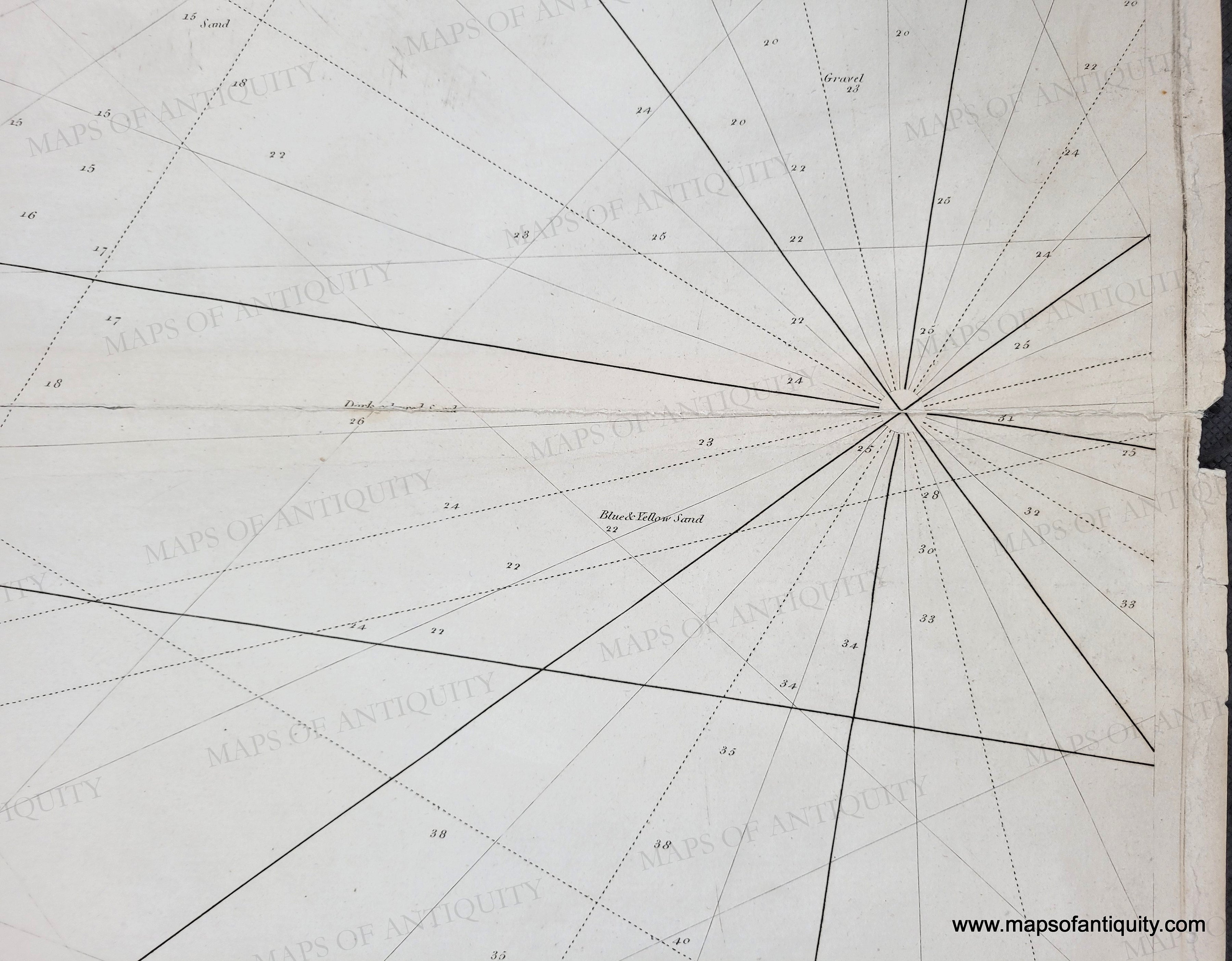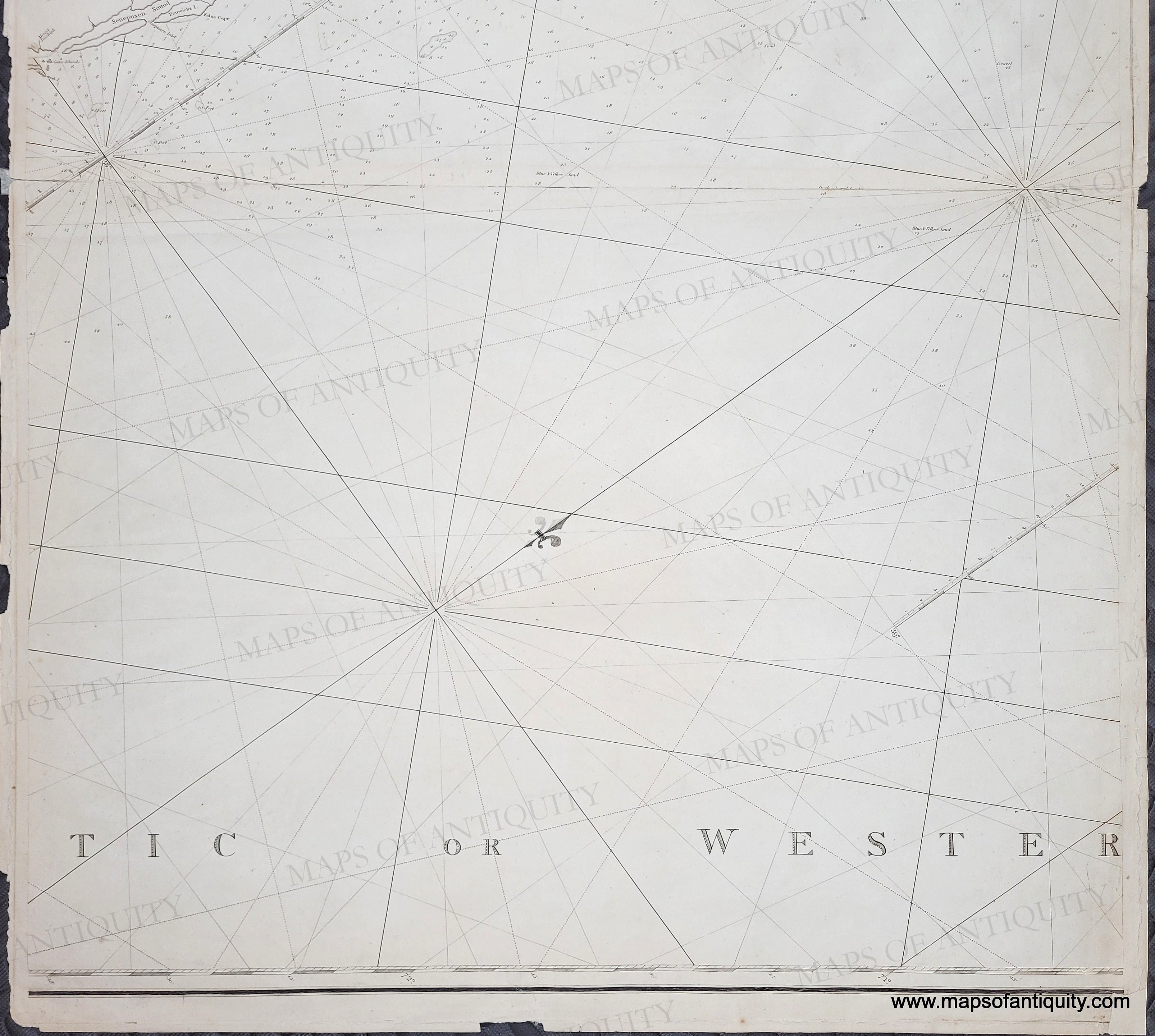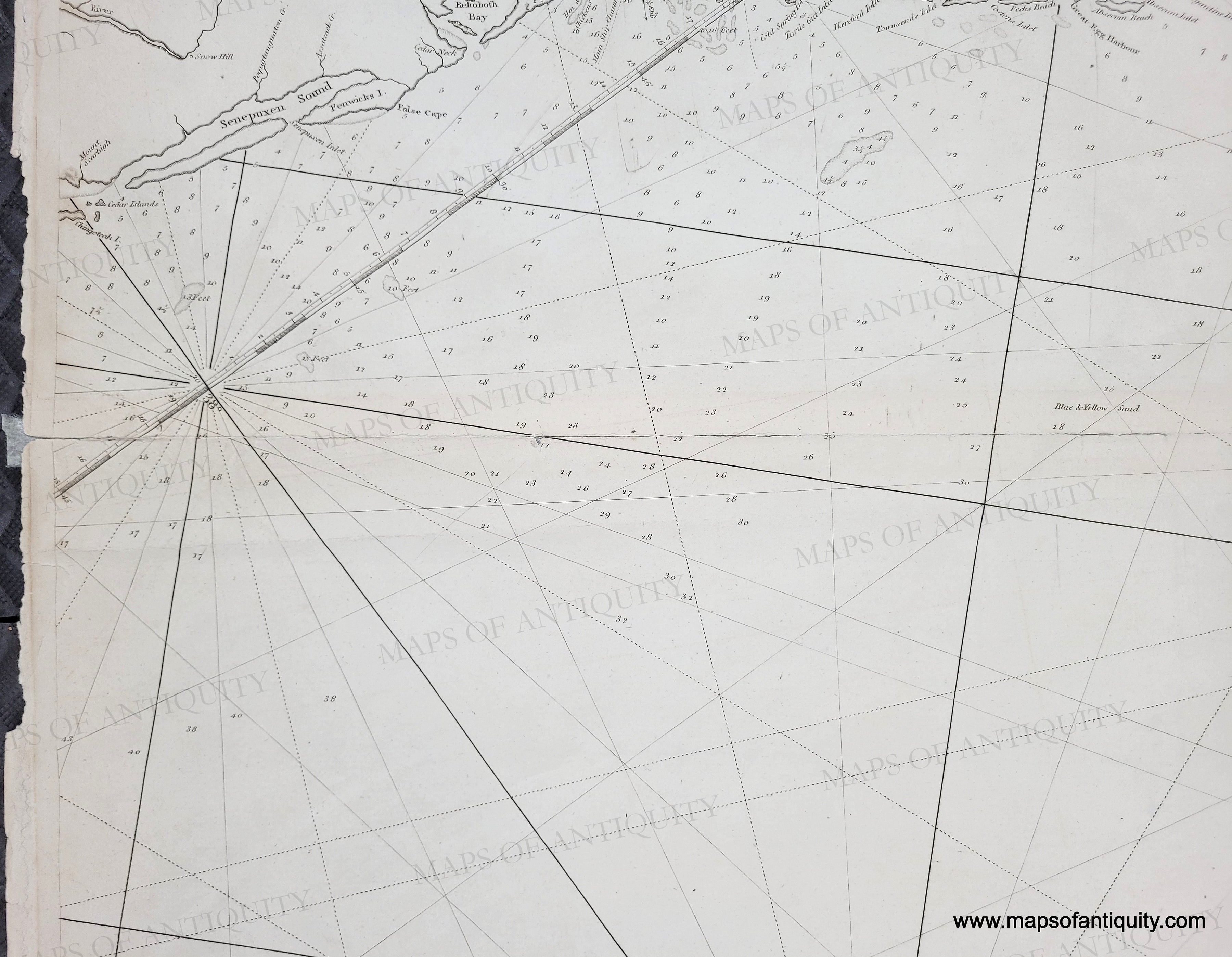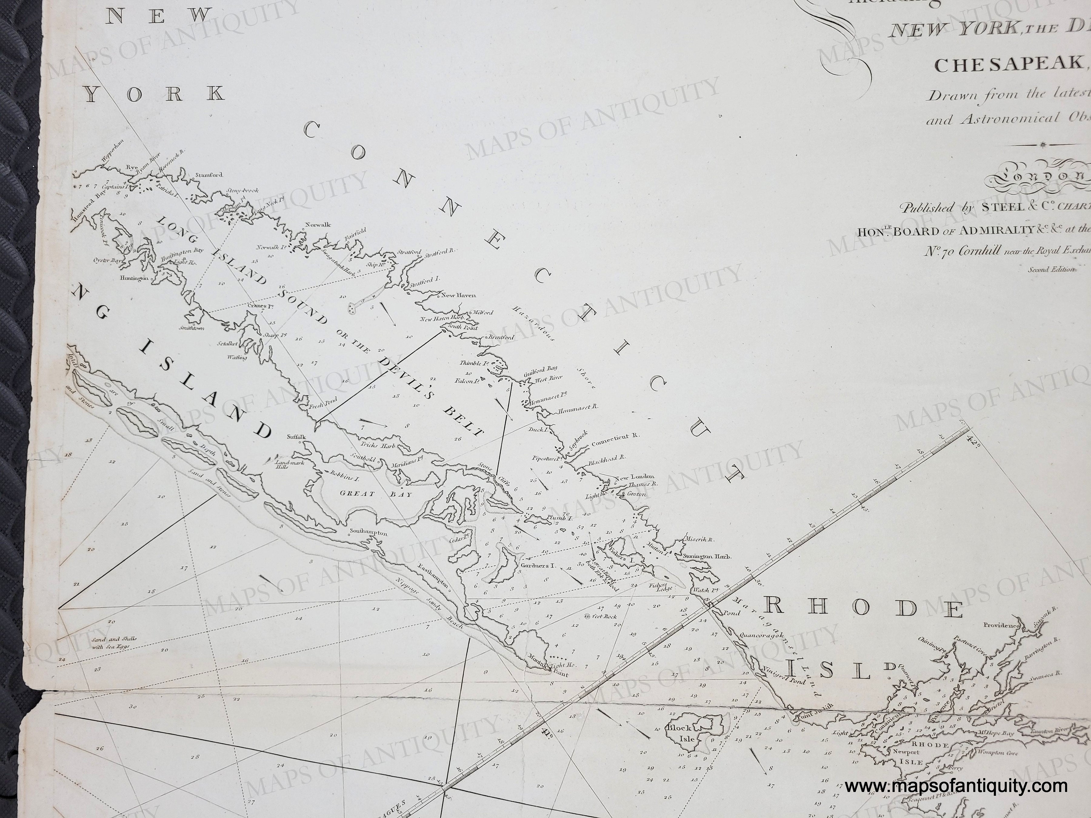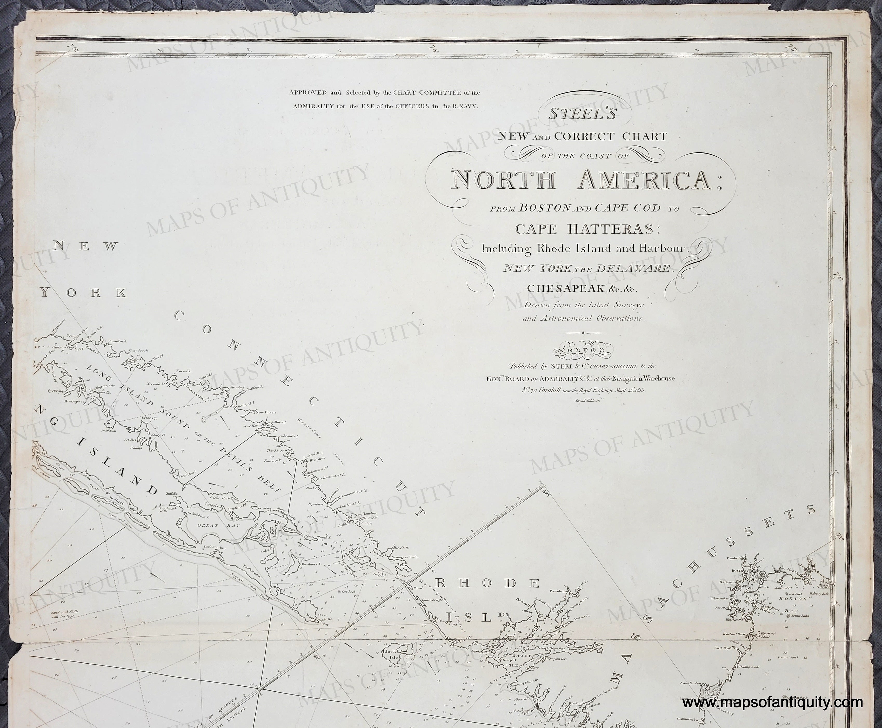 Rare set of three antique nautical charts of the East Coast of the United States from Boston to Cape Hatteras North Carolina, published in 1813 by Steel & Co. (Penelope Steel). Shows soundings, shoals, harbors, rhumb lines, etc. These charts were "Approved and Selected by the Chart Committee of the Admiralty for the use of the Officers in the Royal Navy." Includes Boston Harbor, Cape Cod, Martha's Vineyard, Nantucket in Massachusetts; Narragansett in Rhode Island; Long Island Sound between Connecticut and Long Island, New York City and harbor with Manhattan Island; Barnegat Bay on the New Jersey coast; Delaware Bay and River to Philadelphia; Chesapeake Bay between Virginia and Maryland and the many rivers leading to Baltimore, Washington DC, Fredericksburg, etc.; Albemarle Sound, Pamlico Sound, and part of the Outer Banks of North Carolina. The Steel company was started by David Steel senior. The company was taken on by David Steel junior when his father died in 1799. When David Steel Junior died in 1803 at the age of 39, his wife Penelope continued the business. She remarried in 1806, with her new husband George Mason also becoming her business partner. In 1814 she partnered with Stanley Goddard and by 1819 the company was bankrupt and all of their materials were sold to J.W. Norie & Company. Steel charts are extremely rare, with very few examples appearing on the market. These charts are in very good condition. A previous owner did some light restoration including closing tears and reinforcing the center folds. The charts exhibit some signs of age with minor wear and paper loss at edges in the margins, some mild stains, slight toning along the center fold. These charts could be joined to create one long chart or framed separately. Each chart measures approx. 36.5 x 24.5 inches to the border lines (neatline). The border is not continuous on each chart, rather it is done so that it would be continuous if the charts were joined.