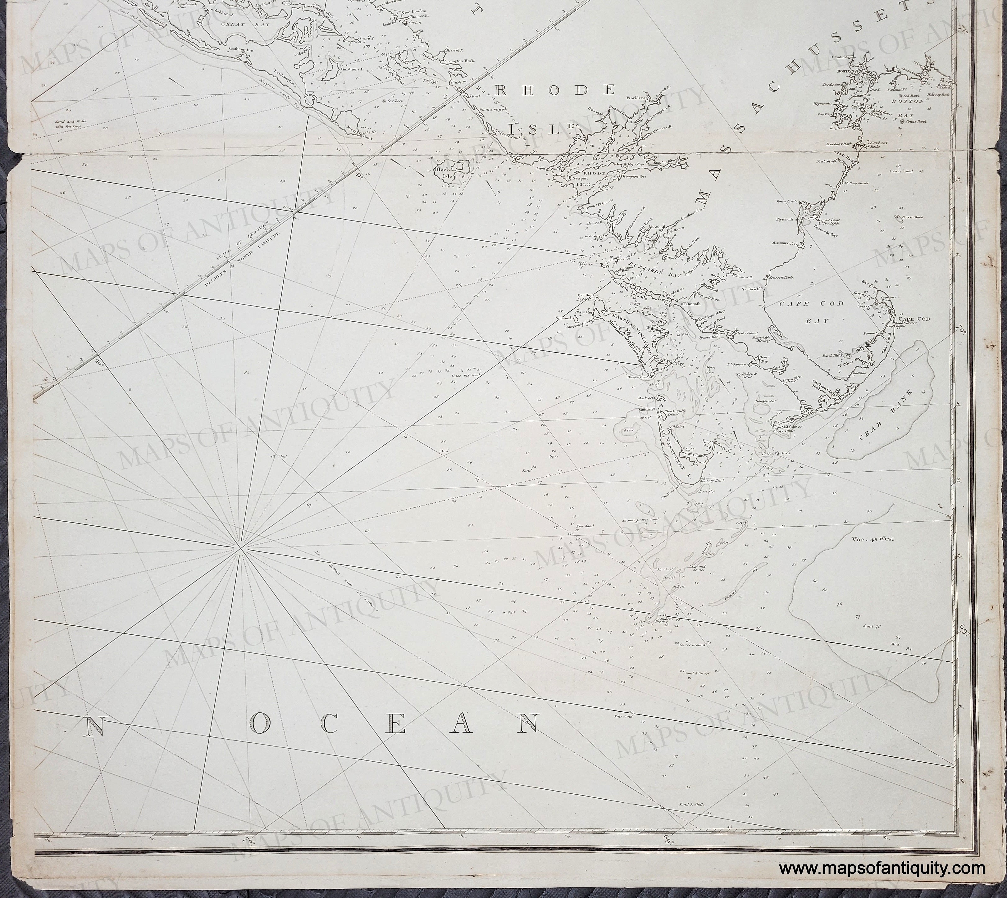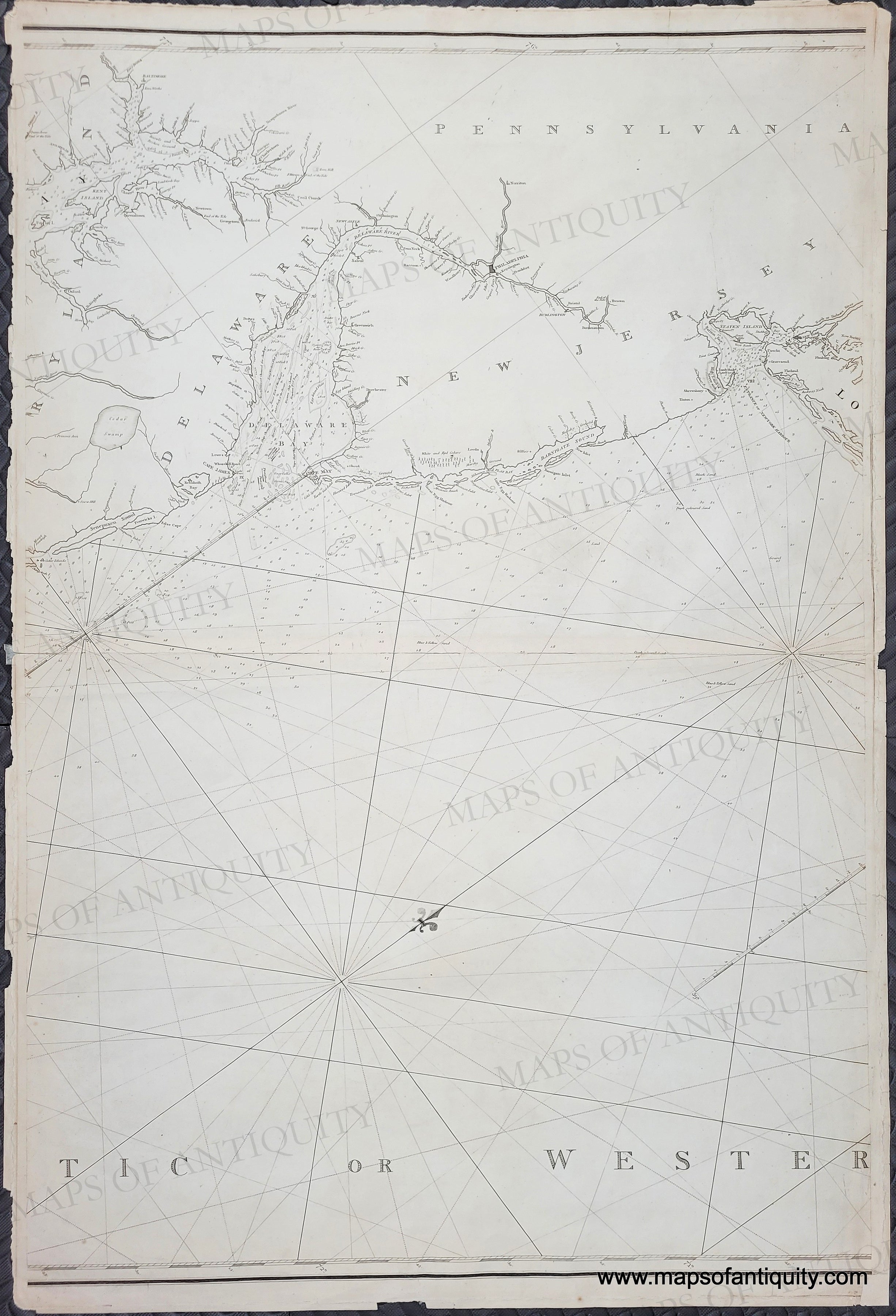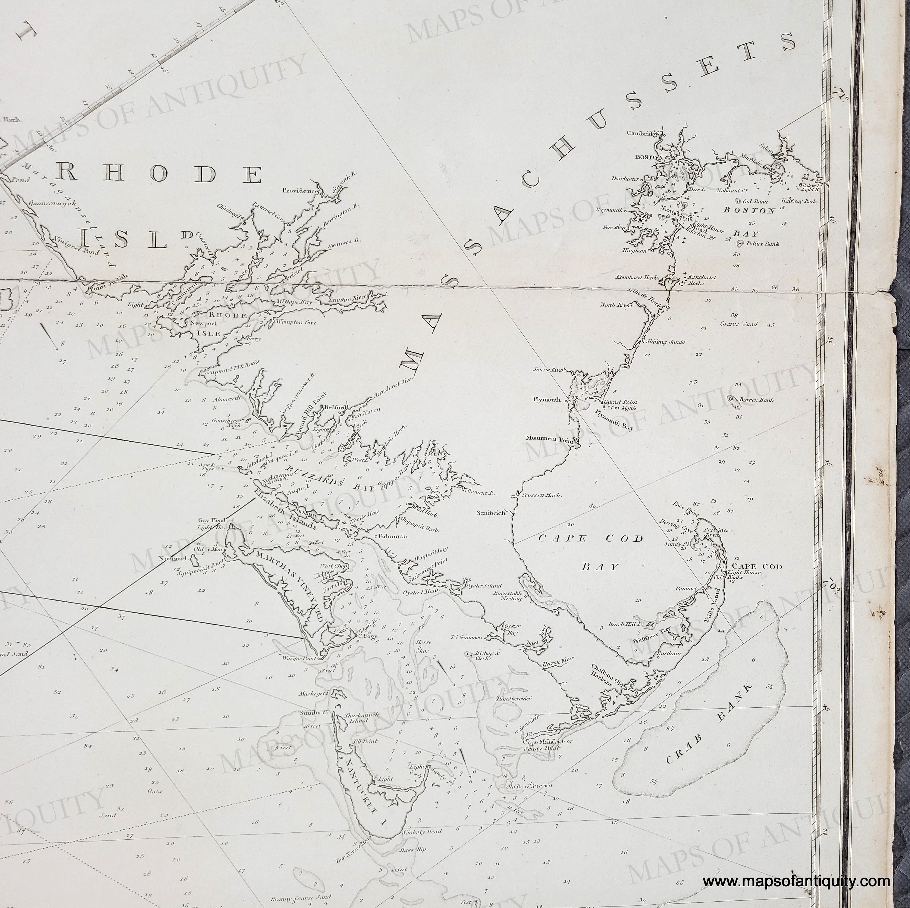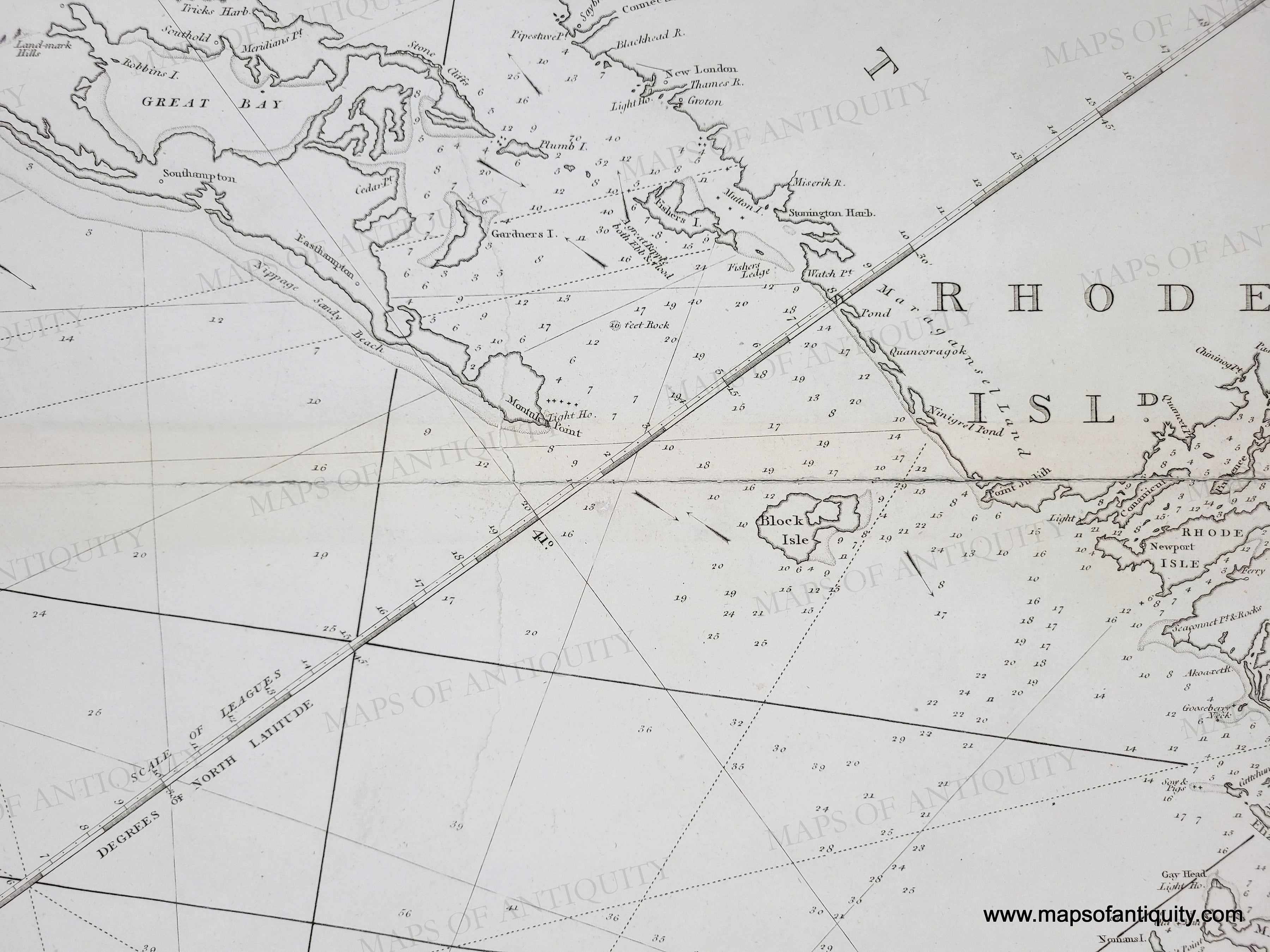 Rare set of three antique nautical charts of the East Coast of the United States from Boston to Cape Hatteras North Carolina, published in 1813 by Steel & Co. (Penelope Steel). Shows soundings, shoals, harbors, rhumb lines, etc. These charts were "Approved and Selected by the Chart Committee of the Admiralty for the use of the Officers in the Royal Navy." Includes Boston Harbor, Cape Cod, Martha's Vineyard, Nantucket in Massachusetts; Narragansett in Rhode Island; Long Island Sound between Connecticut and Long Island, New York City and harbor with Manhattan Island; Barnegat Bay on the New Jersey coast; Delaware Bay and River to Philadelphia; Chesapeake Bay between Virginia and Maryland and the many rivers leading to Baltimore, Washington DC, Fredericksburg, etc.; Albemarle Sound, Pamlico Sound, and part of the Outer Banks of North Carolina. The Steel company was started by David Steel senior. The company was taken on by David Steel junior when his father died in 1799. When David Steel Junior died in 1803 at the age of 39, his wife Penelope continued the business. She remarried in 1806, with her new husband George Mason also becoming her business partner. In 1814 she partnered with Stanley Goddard and by 1819 the company was bankrupt and all of their materials were sold to J.W. Norie & Company. Steel charts are extremely rare, with very few examples appearing on the market. These charts are in very good condition. A previous owner did some light restoration including closing tears and reinforcing the center folds. The charts exhibit some signs of age with minor wear and paper loss at edges in the margins, some mild stains, slight toning along the center fold. These charts could be joined to create one long chart or framed separately. Each chart measures approx. 36.5 x 24.5 inches to the border lines (neatline). The border is not continuous on each chart, rather it is done so that it would be continuous if the charts were joined.