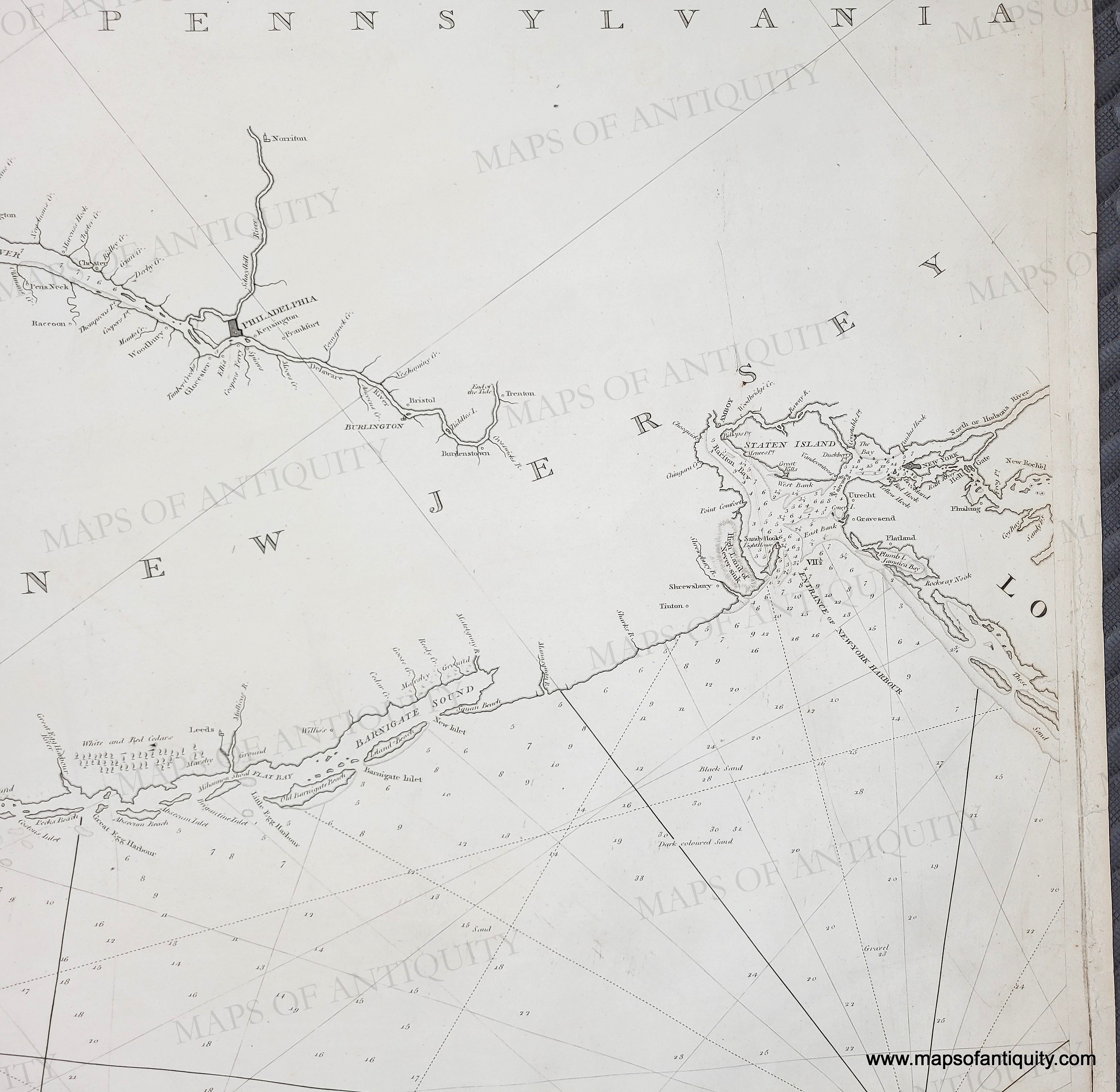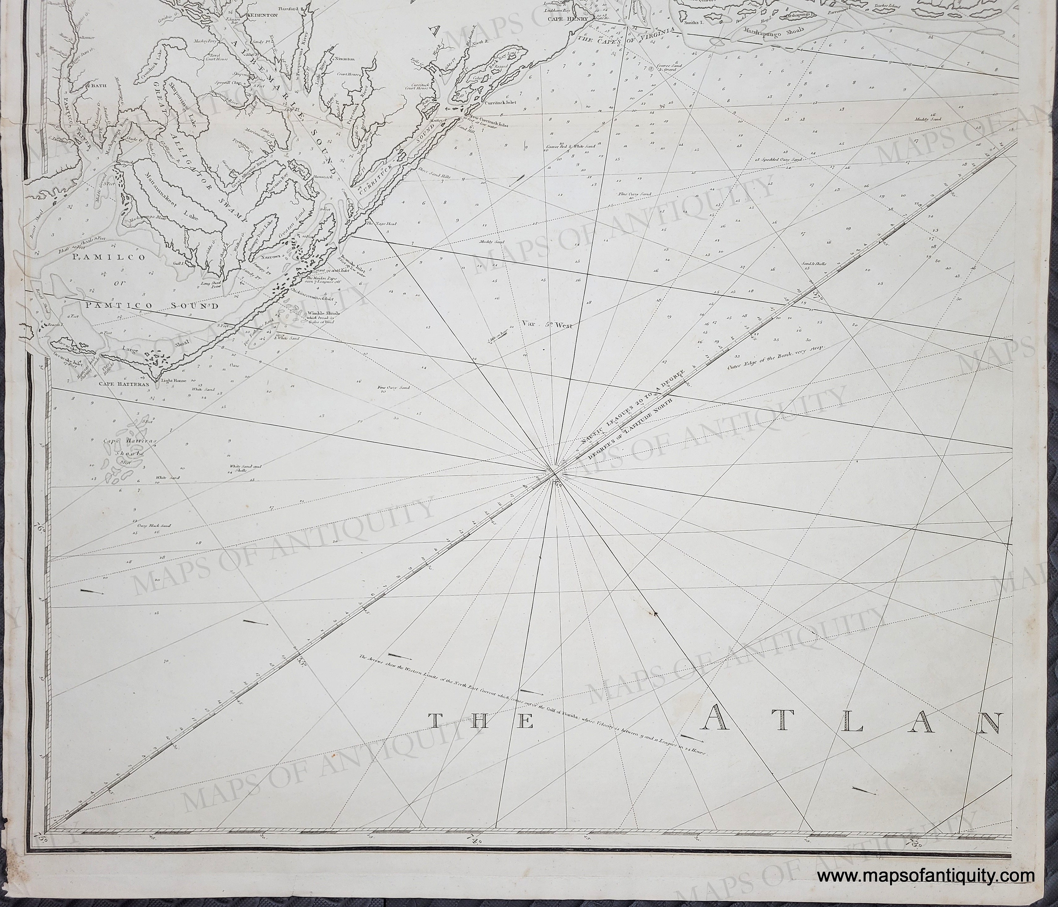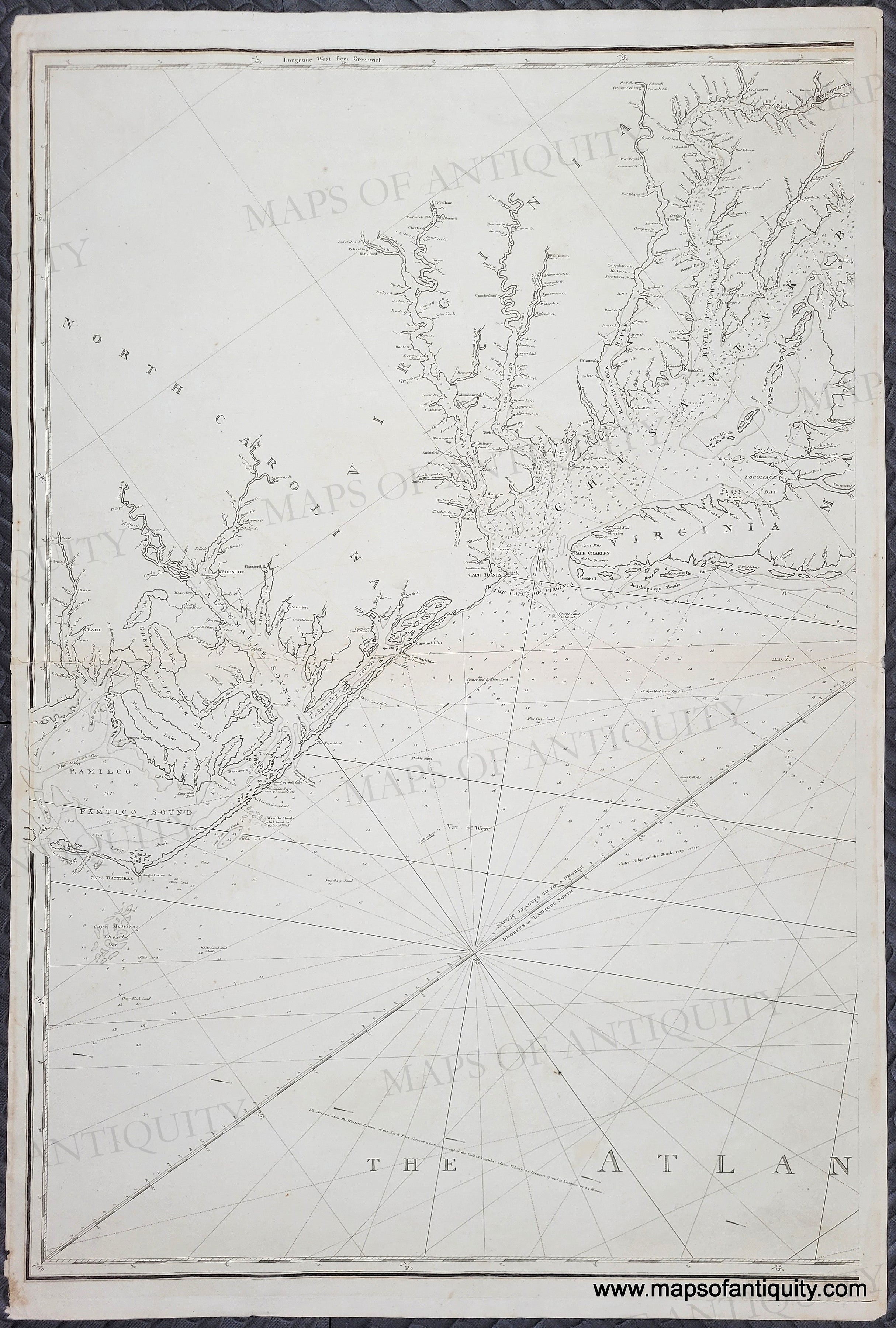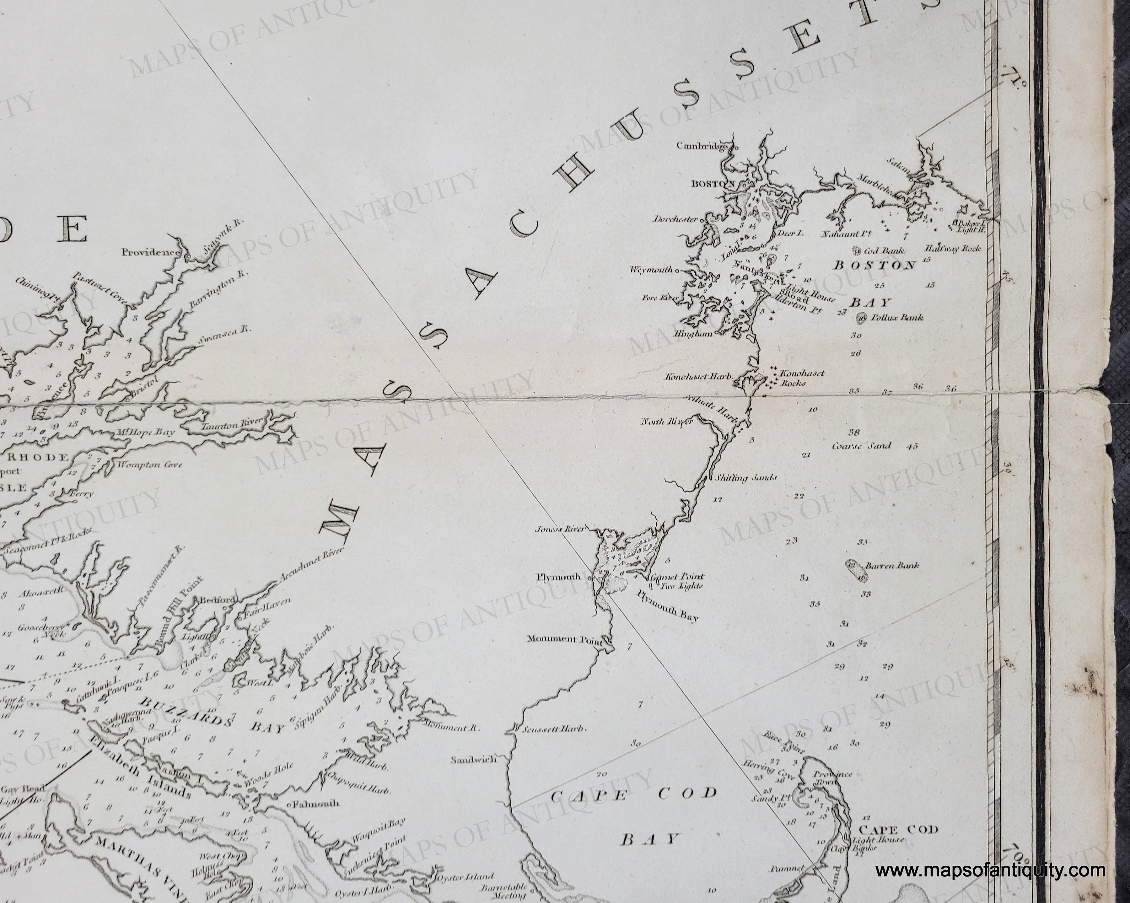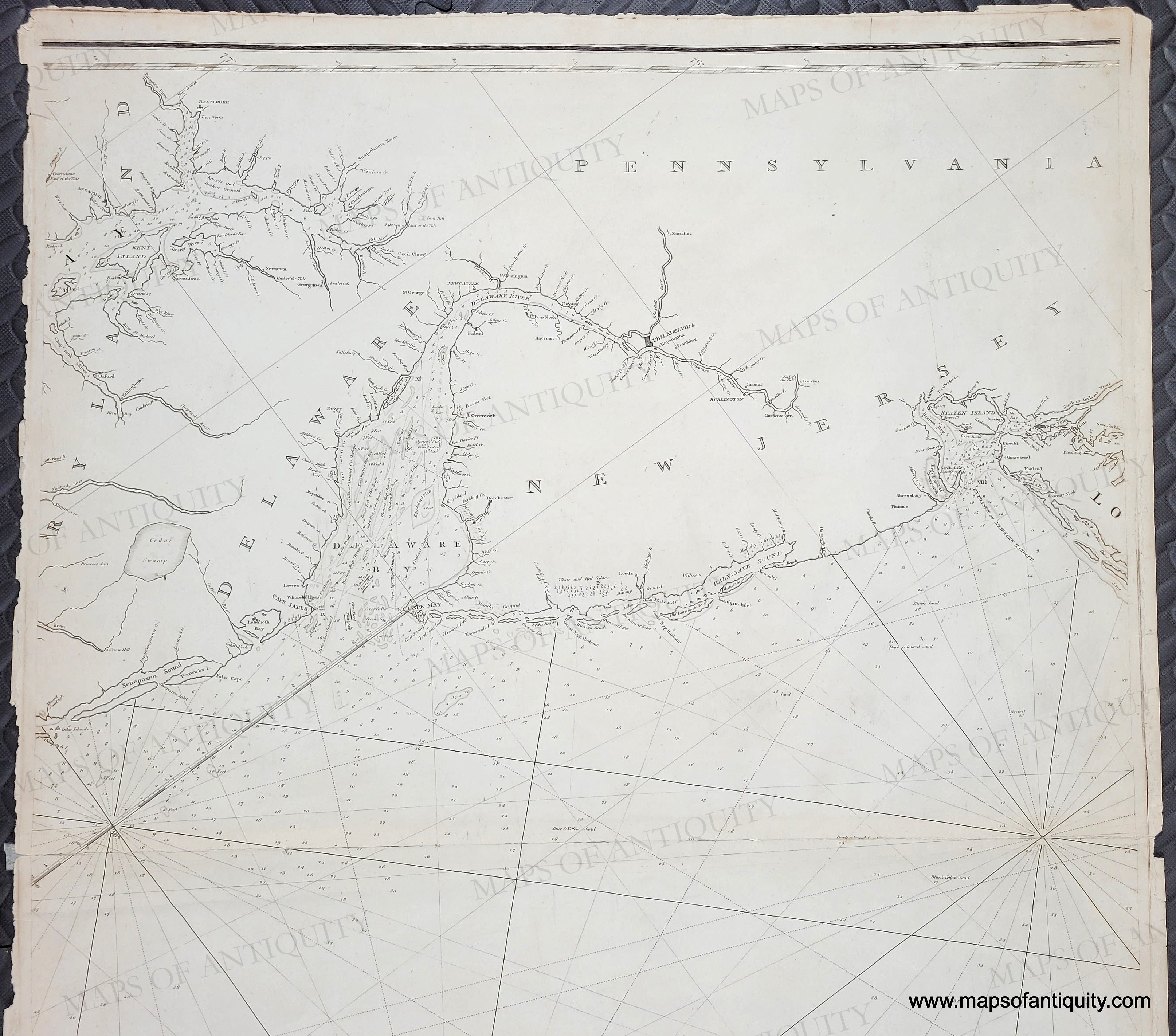 Rare set of three antique nautical charts of the East Coast of the United States from Boston to Cape Hatteras North Carolina, published in 1813 by Steel & Co. (Penelope Steel). Shows soundings, shoals, harbors, rhumb lines, etc. These charts were "Approved and Selected by the Chart Committee of the Admiralty for the use of the Officers in the Royal Navy." Includes Boston Harbor, Cape Cod, Martha's Vineyard, Nantucket in Massachusetts; Narragansett in Rhode Island; Long Island Sound between Connecticut and Long Island, New York City and harbor with Manhattan Island; Barnegat Bay on the New Jersey coast; Delaware Bay and River to Philadelphia; Chesapeake Bay between Virginia and Maryland and the many rivers leading to Baltimore, Washington DC, Fredericksburg, etc.; Albemarle Sound, Pamlico Sound, and part of the Outer Banks of North Carolina. The Steel company was started by David Steel senior. The company was taken on by David Steel junior when his father died in 1799. When David Steel Junior died in 1803 at the age of 39, his wife Penelope continued the business. She remarried in 1806, with her new husband George Mason also becoming her business partner. In 1814 she partnered with Stanley Goddard and by 1819 the company was bankrupt and all of their materials were sold to J.W. Norie & Company. Steel charts are extremely rare, with very few examples appearing on the market. These charts are in very good condition. A previous owner did some light restoration including closing tears and reinforcing the center folds. The charts exhibit some signs of age with minor wear and paper loss at edges in the margins, some mild stains, slight toning along the center fold. These charts could be joined to create one long chart or framed separately. Each chart measures approx. 36.5 x 24.5 inches to the border lines (neatline). The border is not continuous on each chart, rather it is done so that it would be continuous if the charts were joined.