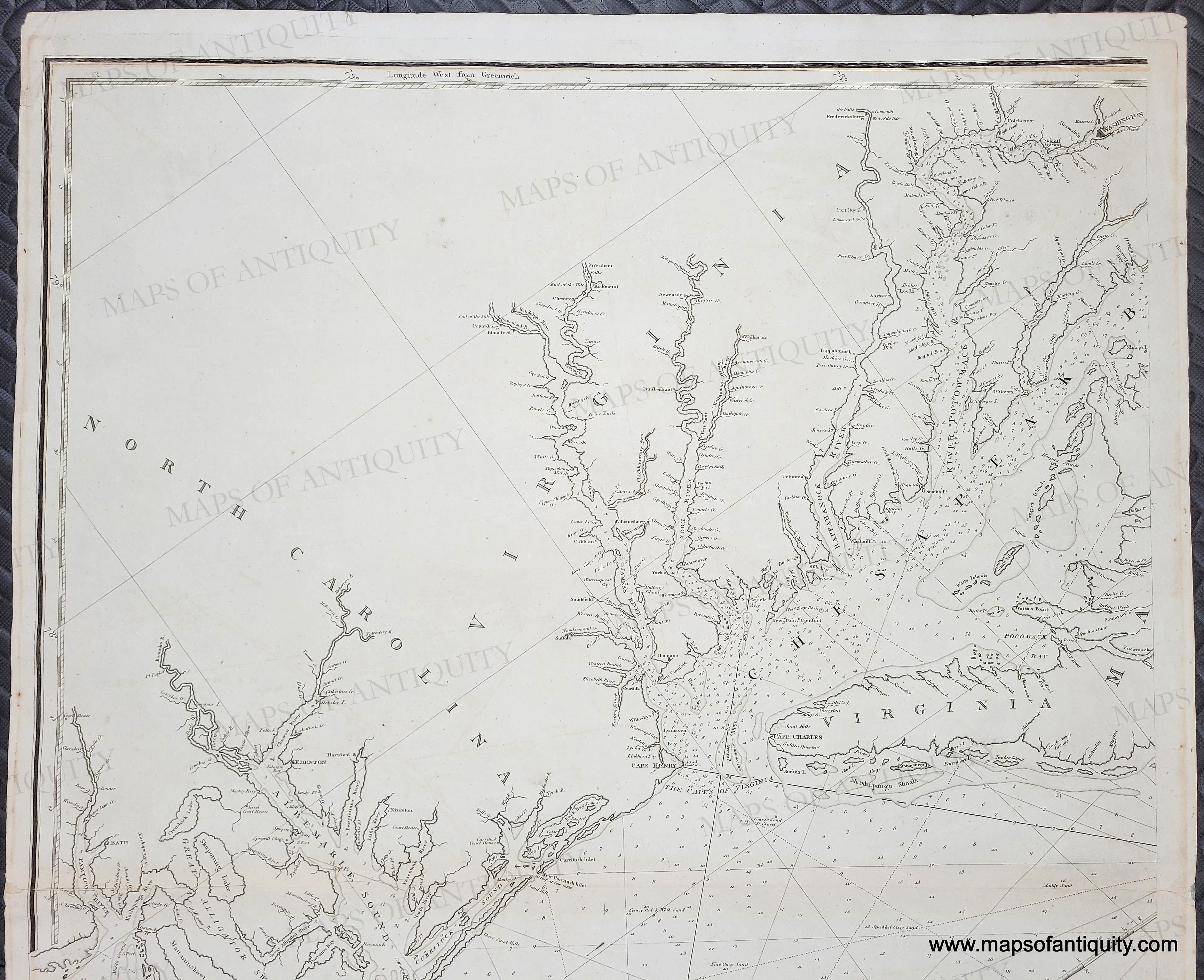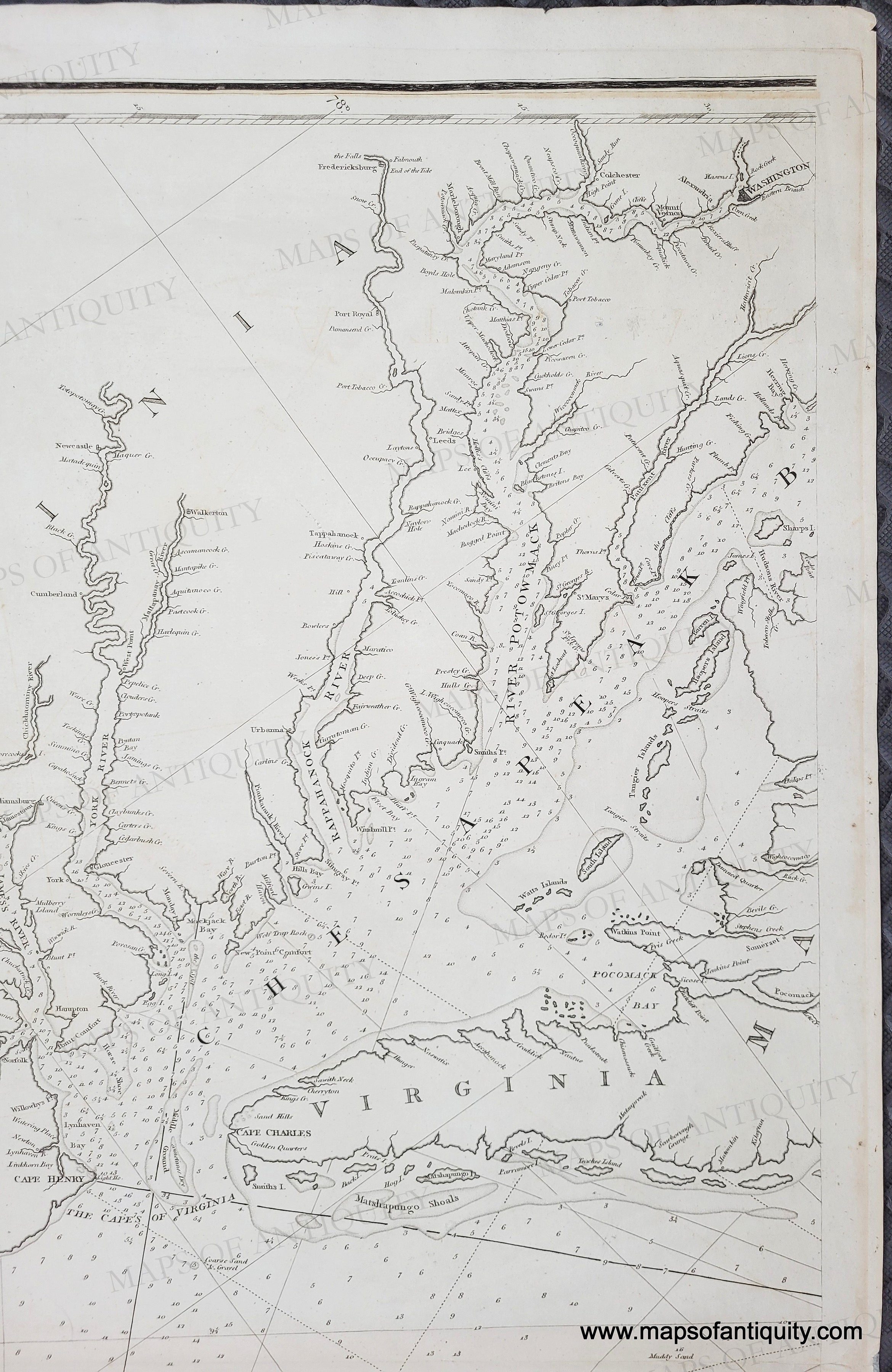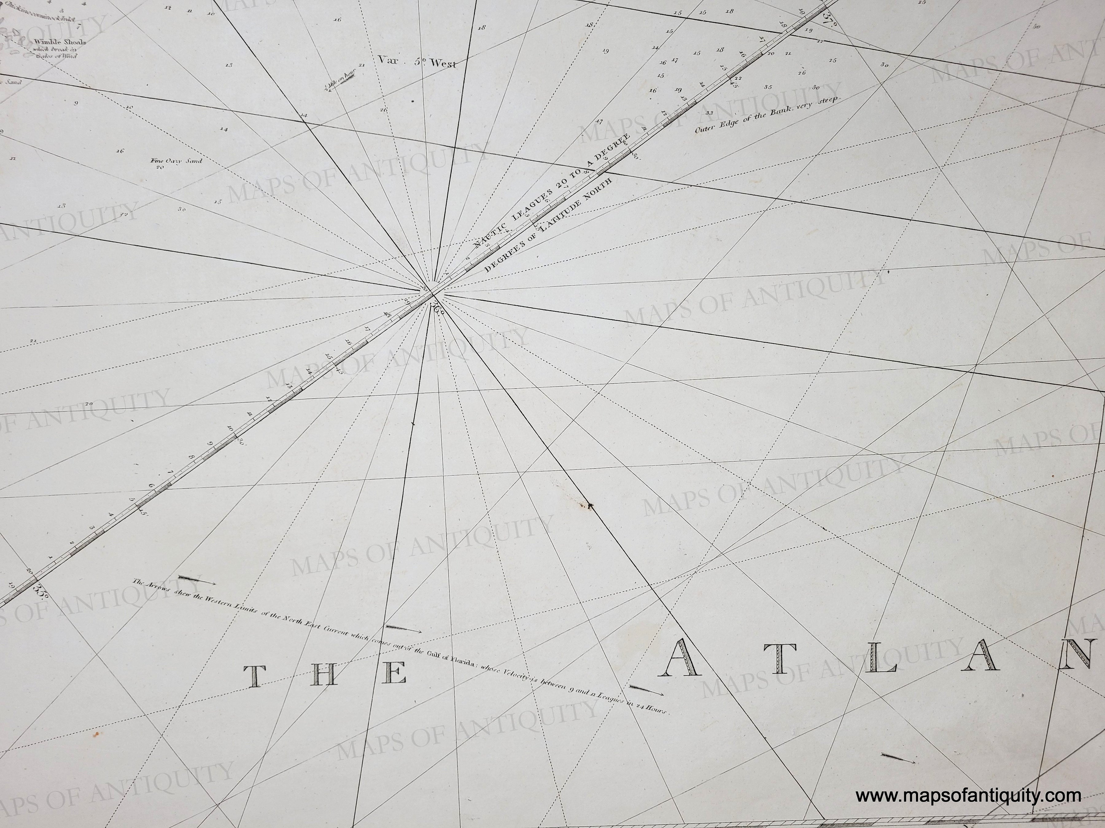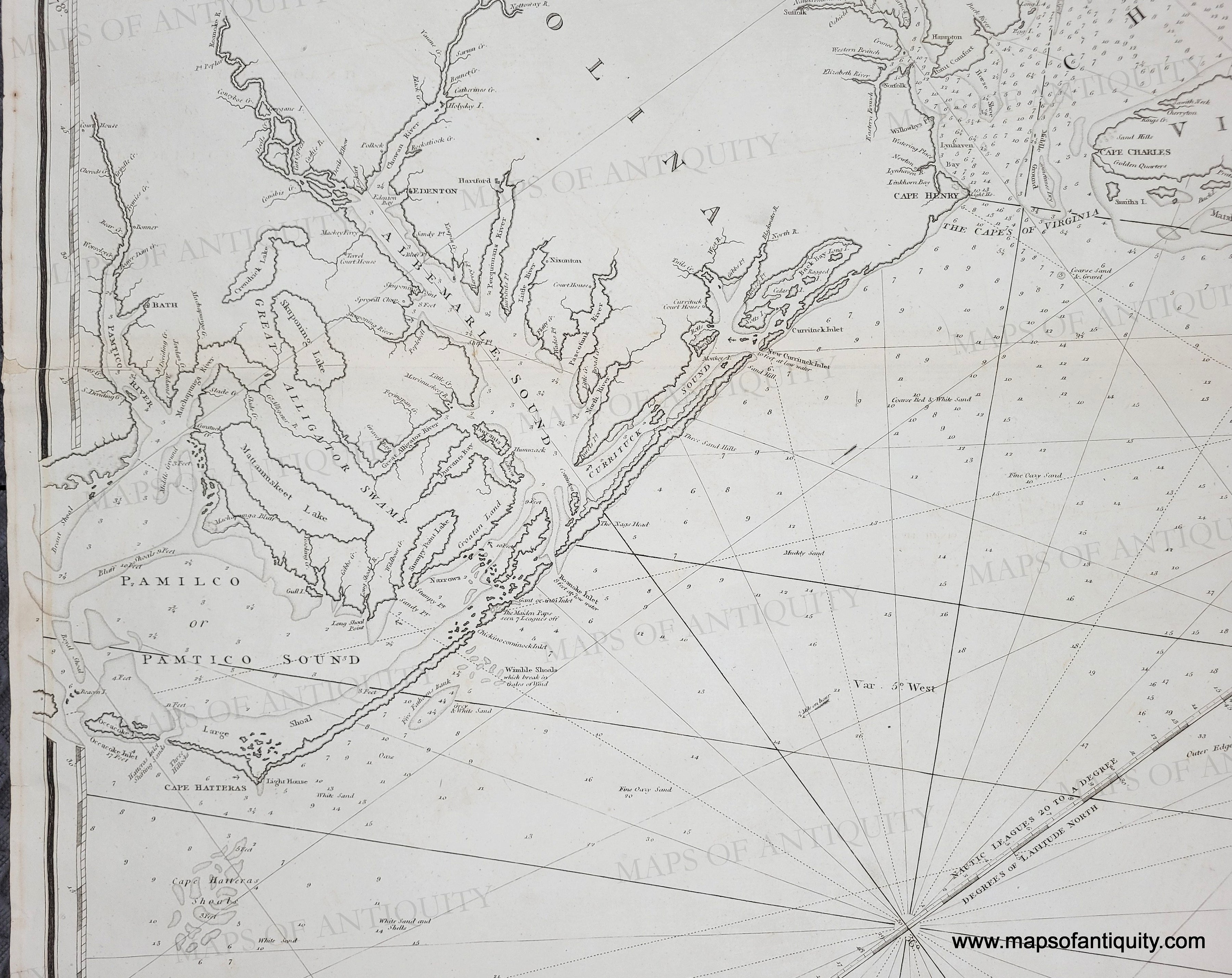 Rare set of three antique nautical charts of the East Coast of the United States from Boston to Cape Hatteras North Carolina, published in 1813 by Steel & Co. (Penelope Steel). Shows soundings, shoals, harbors, rhumb lines, etc. These charts were "Approved and Selected by the Chart Committee of the Admiralty for the use of the Officers in the Royal Navy." Includes Boston Harbor, Cape Cod, Martha's Vineyard, Nantucket in Massachusetts; Narragansett in Rhode Island; Long Island Sound between Connecticut and Long Island, New York City and harbor with Manhattan Island; Barnegat Bay on the New Jersey coast; Delaware Bay and River to Philadelphia; Chesapeake Bay between Virginia and Maryland and the many rivers leading to Baltimore, Washington DC, Fredericksburg, etc.; Albemarle Sound, Pamlico Sound, and part of the Outer Banks of North Carolina. The Steel company was started by David Steel senior. The company was taken on by David Steel junior when his father died in 1799. When David Steel Junior died in 1803 at the age of 39, his wife Penelope continued the business. She remarried in 1806, with her new husband George Mason also becoming her business partner. In 1814 she partnered with Stanley Goddard and by 1819 the company was bankrupt and all of their materials were sold to J.W. Norie & Company. Steel charts are extremely rare, with very few examples appearing on the market. These charts are in very good condition. A previous owner did some light restoration including closing tears and reinforcing the center folds. The charts exhibit some signs of age with minor wear and paper loss at edges in the margins, some mild stains, slight toning along the center fold. These charts could be joined to create one long chart or framed separately. Each chart measures approx. 36.5 x 24.5 inches to the border lines (neatline). The border is not continuous on each chart, rather it is done so that it would be continuous if the charts were joined.