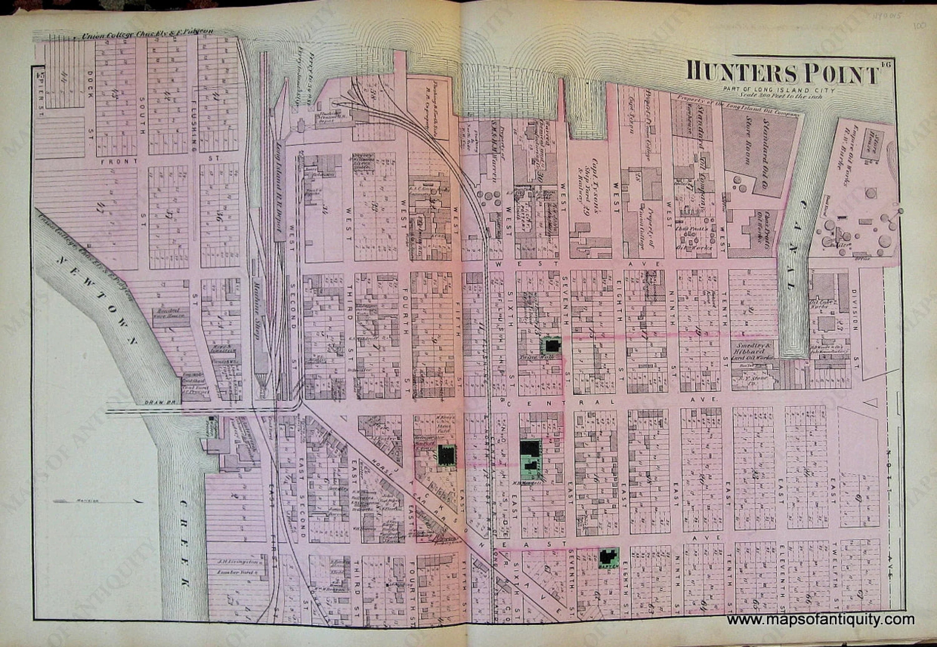 Antique page of maps from the Atlas of Long Island, New York, by Beers, Comstock & Cline, 1873. Centerfold map is Hunters Point. Back sides are Middle Village and part of Astoria on one side and Winfield between Woodside Ave and Calamus Ave on the other side. These are all parts of modern Queens. These maps show businesses, churches, roads, railroads, parks, property owners. Original hand-coloring. Good to very good antique condition, some toning. Measures approx. 14 x 22 inches (centerfold, to the neatline) and 10.75 x 14 inches on verso maps.