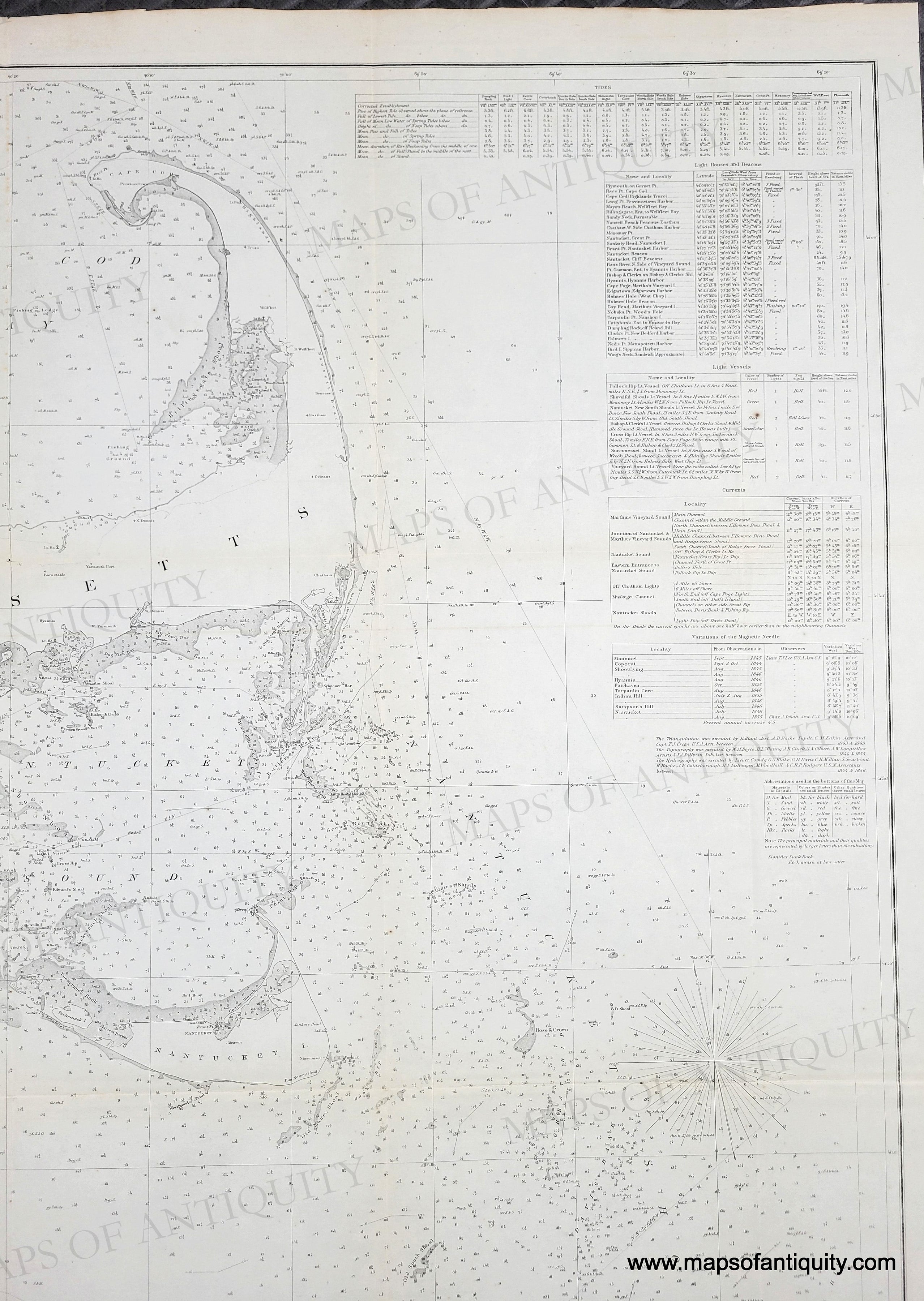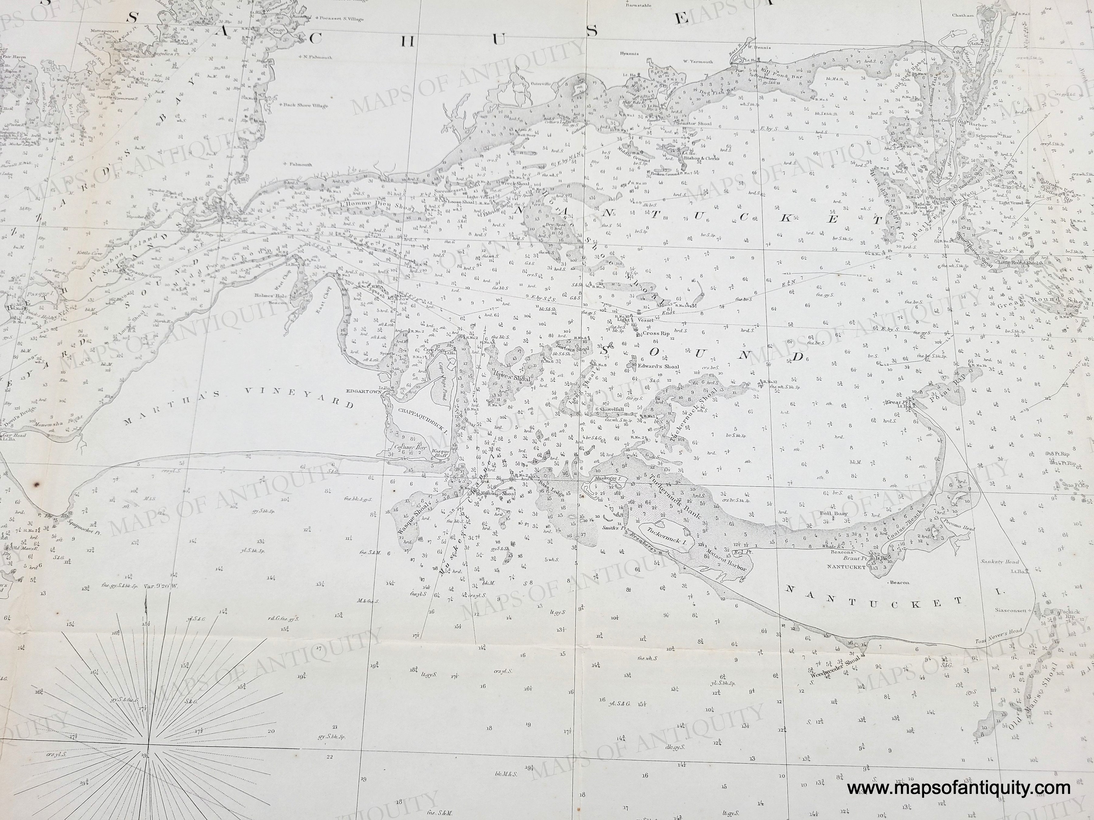 Antique nautical chart, showing Cape Cod, Martha's Vineyard and Nantucket, by the US Coast Survey, 1857. With soundings, and information on tides, lighthouses, currents, etc. Antique charts that include the entirety of Cape Cod with Nantucket and Martha's Vineyard are relatively rare- most only show either Cape Cod Bay or Nantucket Sound. The U.S. Coast Survey was tasked with surveying the coasts of the United States and creating survey report charts which would be used to create accurate nautical charts and to update charts as needed. Very good overall antique condition, with folds as issued and some mild toning along some of the folds and a few small spots. Measures approx. 29 x 31.5 inches to the neatline.