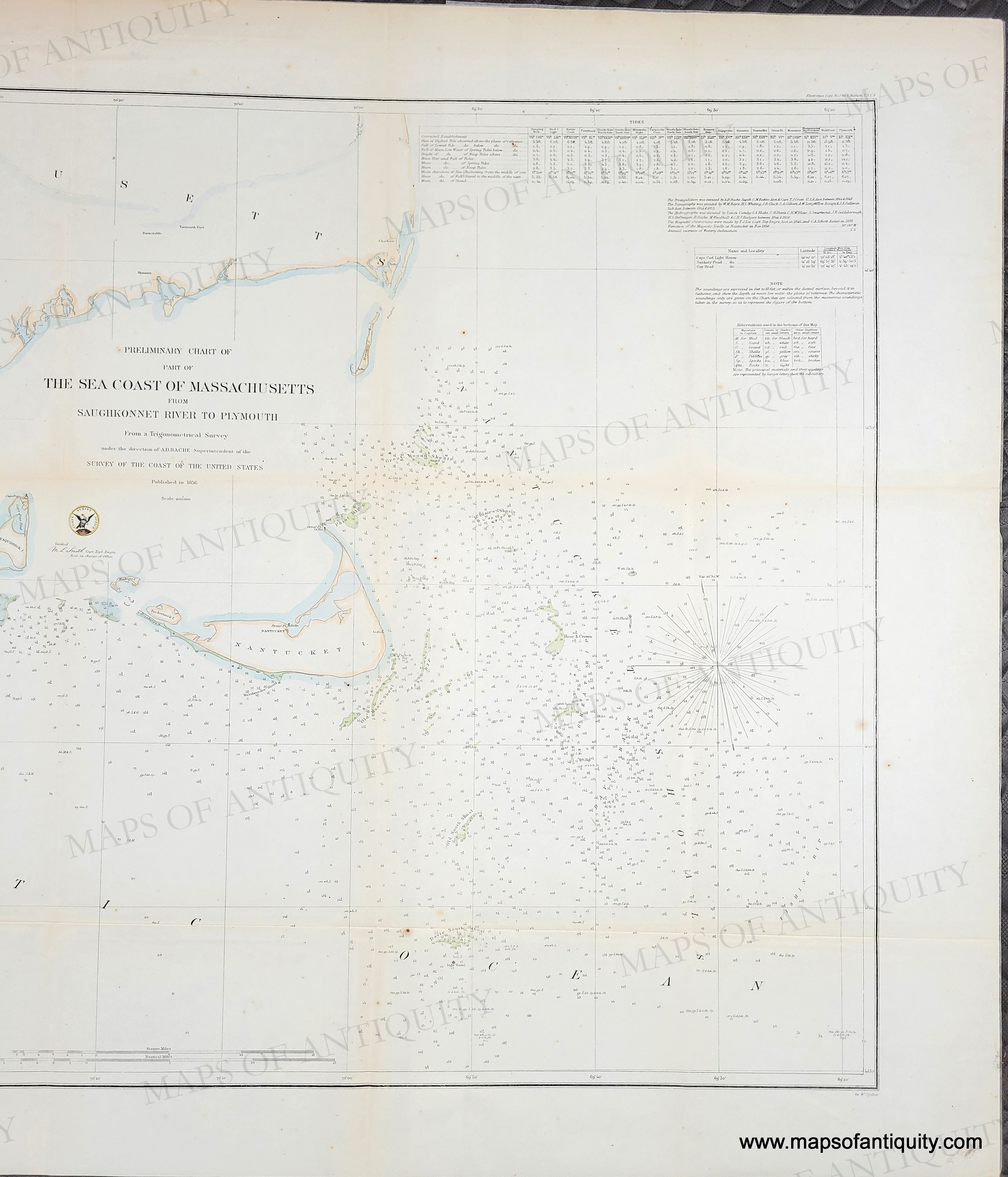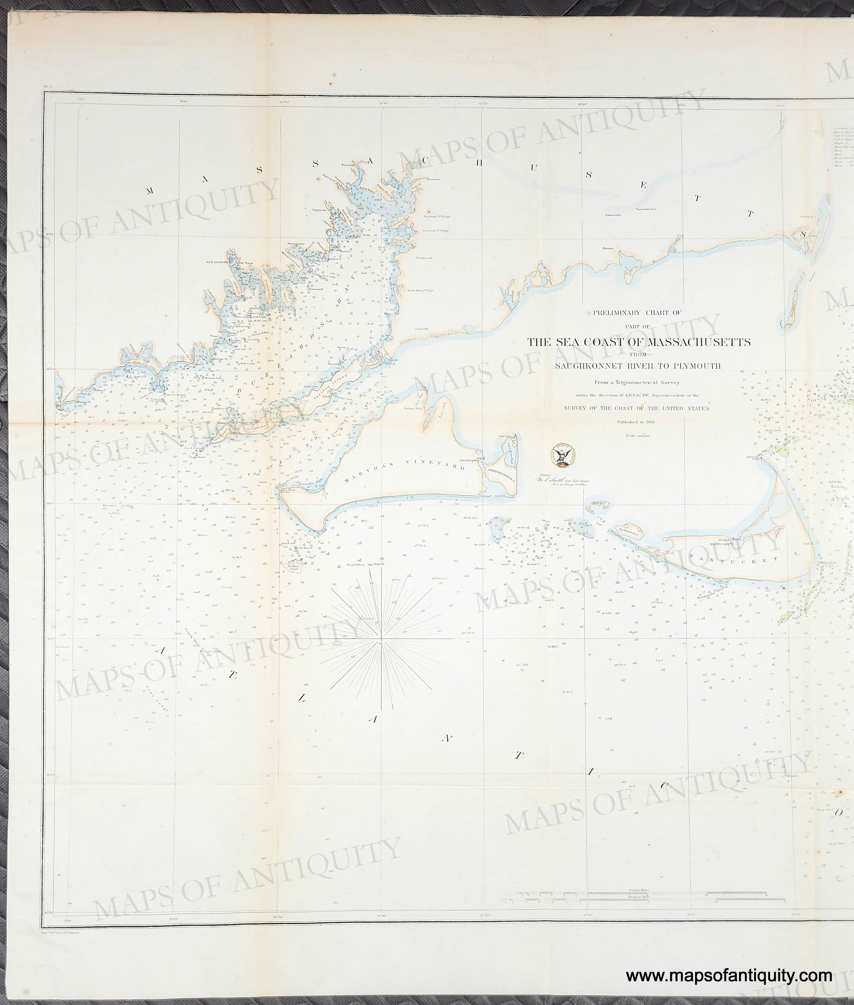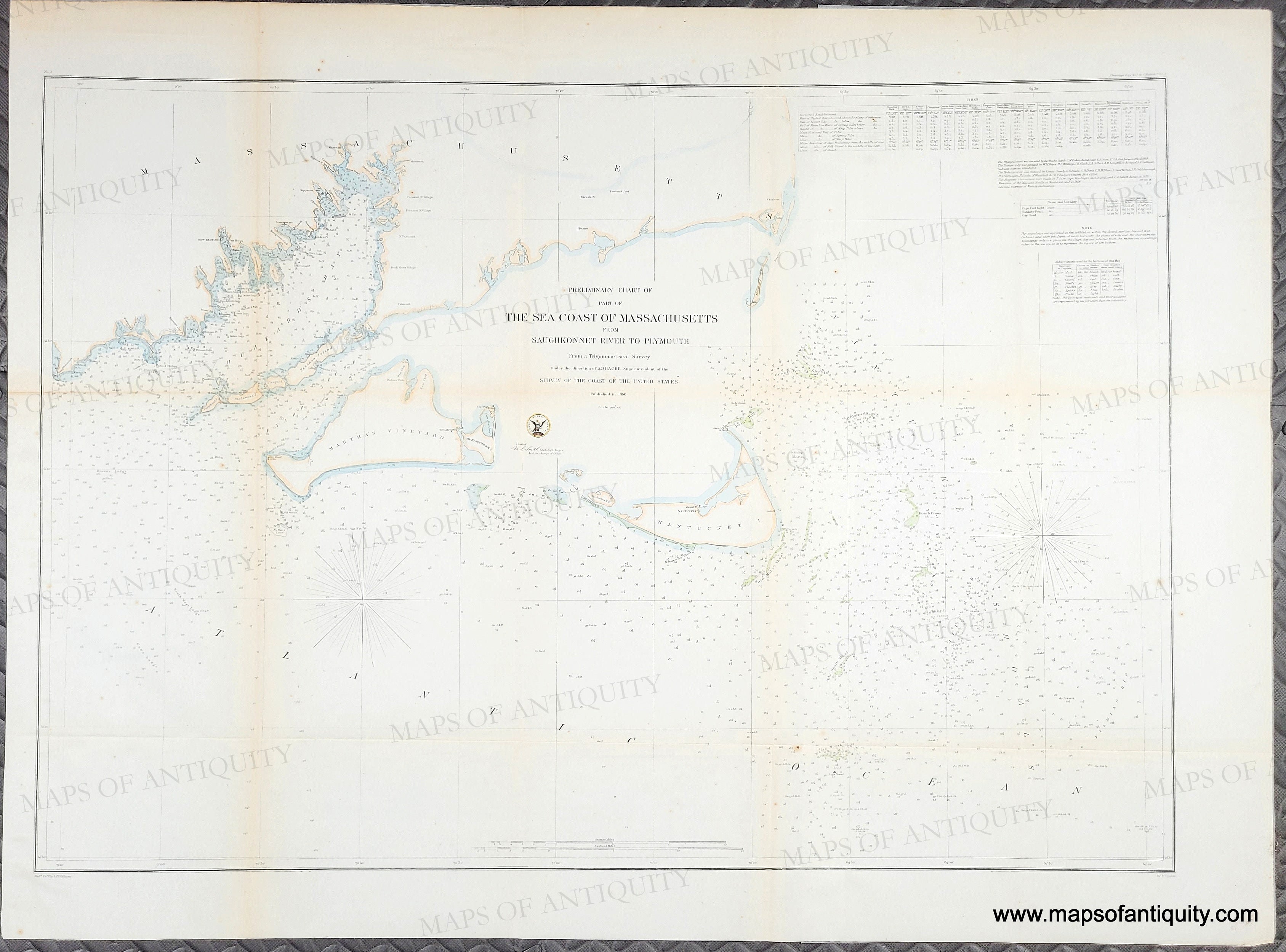 Hand-colored antique nautical chart, showing the southern portion of Cape Cod as well as Martha's Vineyard and Nantucket, by the US Coast Survey, 1856. With soundings, bathymetric data, shoals, and information on tides, lighthouses, currents, etc. for Buzzards Bay and Vineyard Sound but apparently they had not surveyed Nantucket Sound at this time. The U.S. Coast Survey was tasked with surveying the coasts of the United States and creating survey report charts which would be used to create accurate nautical charts and to update charts as needed. This chart appears to be the first iteration of Chart No. 4 of the Sea Coast which shows all of Cape Cod and the Islands. Later color. Very good overall restored condition, this chart has been backed with light-weight paper. With folds as issued (flattened), some mild spots throughout and some slight toning along some of the folds. Measures approx. 22.25 x 31.75 inches to the neatline.