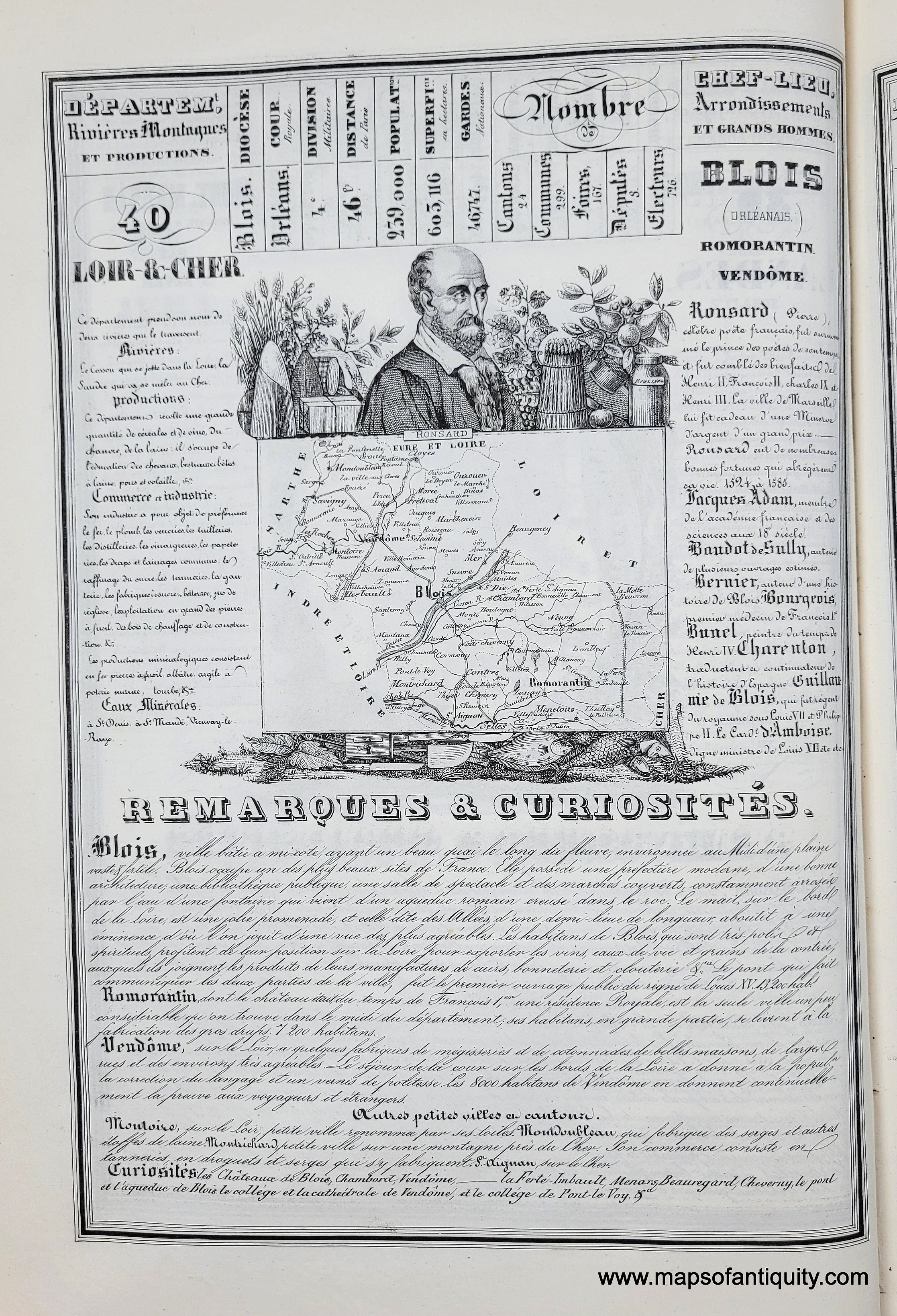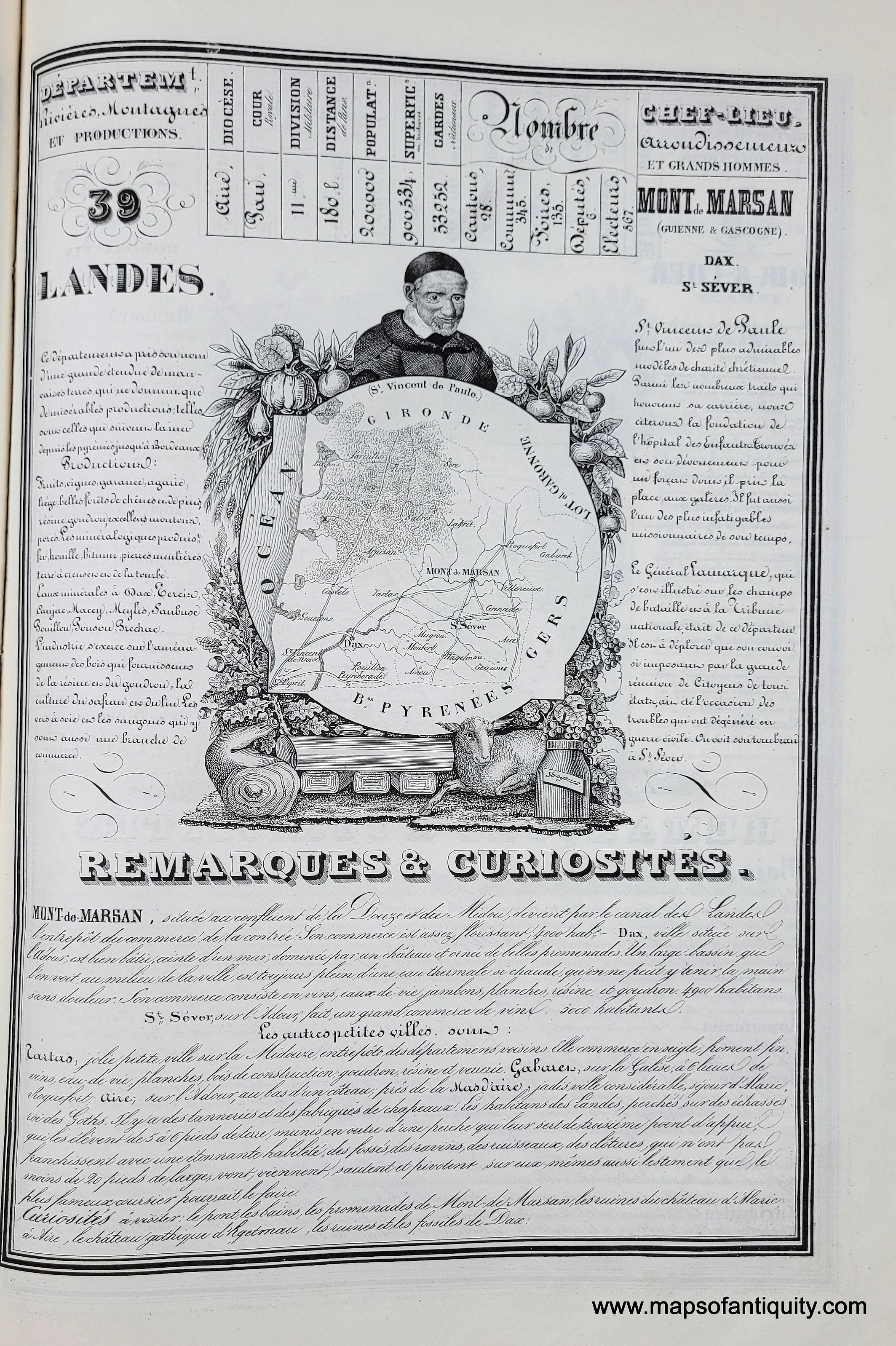Antique double-sided page with maps of the Departments of Landes and Loir-et-Cher, France, published in the Nouvelle Geographie Et Statistique De La France, Alger Et La Belgique, Suivie D'Un Traite Sur Le Monde Entier... 1842 (5th edition) by Alexandre Corbin. This charming page features text relating to the statistics of the Department, including rivers, mountains, industries, notable residents, and "remarks & curiosities" as well as a small map of the region surrounded by illustrations of the local products and one notable/historical personage (St. VIncent de Paule in Landes and Ronsard in Loir-&-Cher). Very good antique condition with some minor stains in the margins. Paper is lightweight and the image/text on verso is slightly visible but this can be reduced by backing with a black backing when framing. Measures approx. 13.5 x 9.5 inches to the neatline.