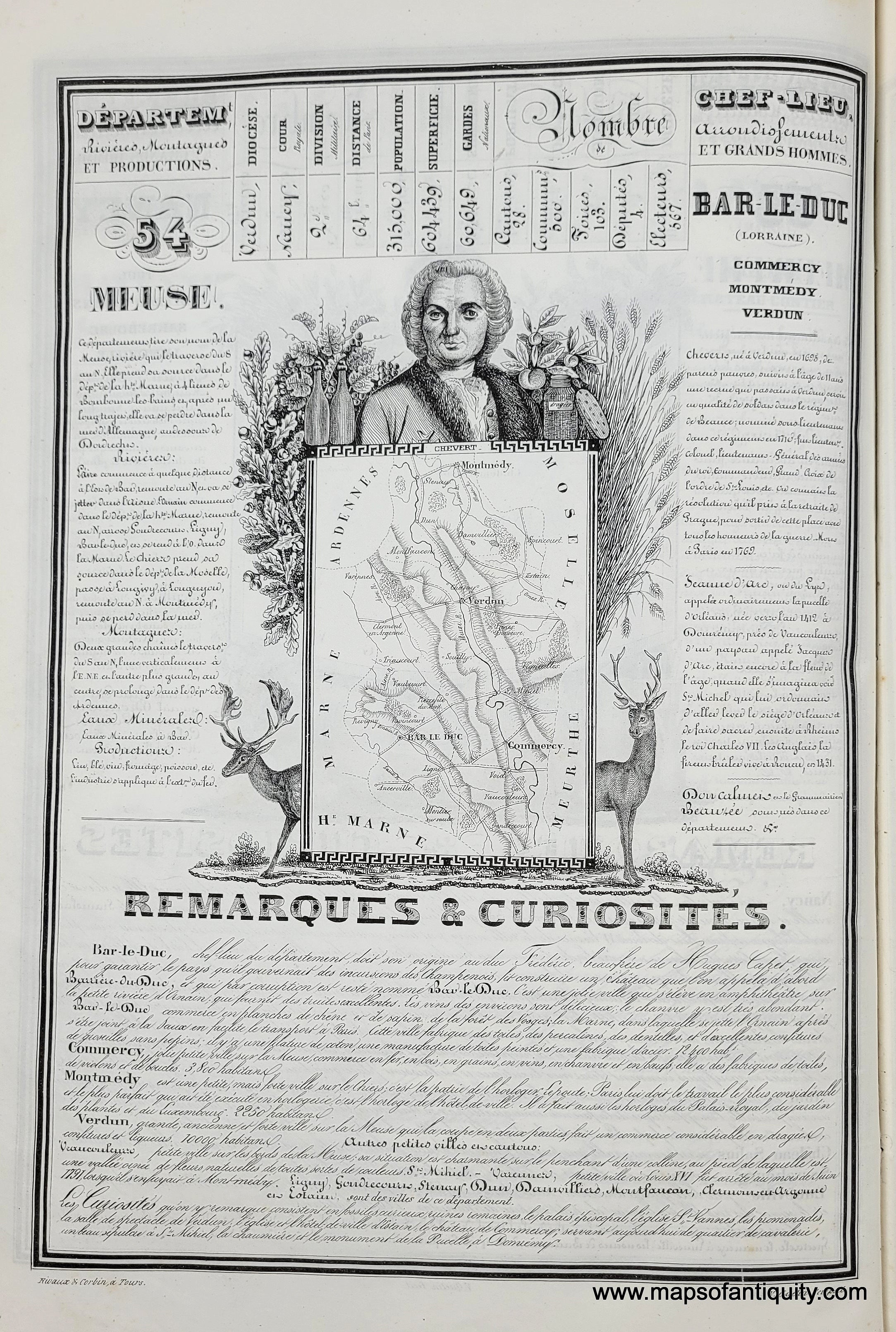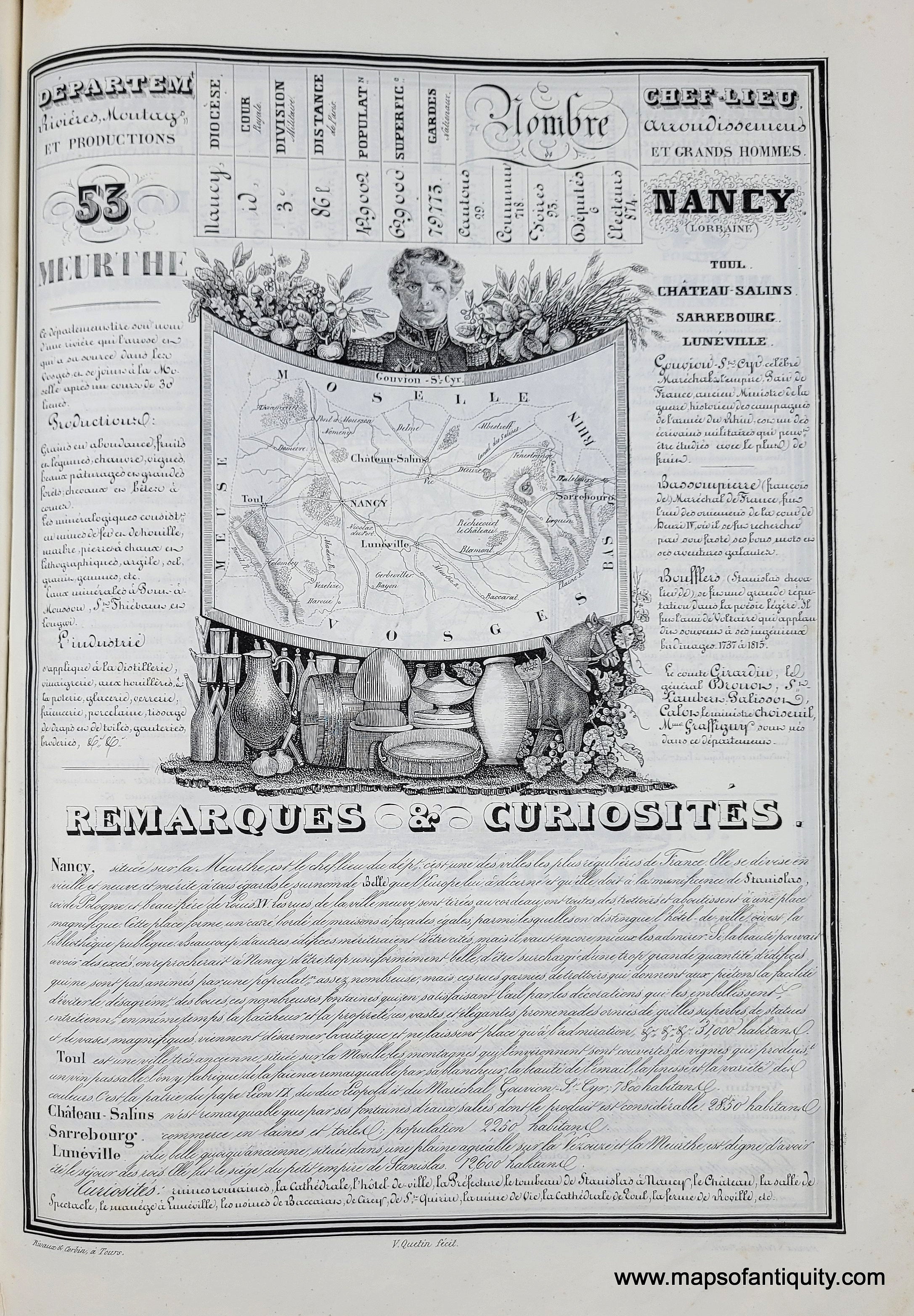 Antique double-sided page with maps of the Departments of Meurthe-et-Moselle and Meuse, France, published in the Nouvelle Geographie Et Statistique De La France, Alger Et La Belgique, Suivie D'Un Traite Sur Le Monde Entier... 1842 (5th edition) by Alexandre Corbin. This charming page features text relating to the statistics of the Department, including rivers, mountains, industries, notable residents, and "remarks & curiosities" as well as a small map of the region surrounded by illustrations of the local products and one notable/historical personage (Gouvion St Cyr in Meurthe and Chevert in Meuse). Very good antique condition with some minor stains in the margins. Paper is lightweight and the image/text on verso is slightly visible but this can be reduced by backing with a black backing when framing. Measures approx. 13.5 x 9.5 inches to the neatline.