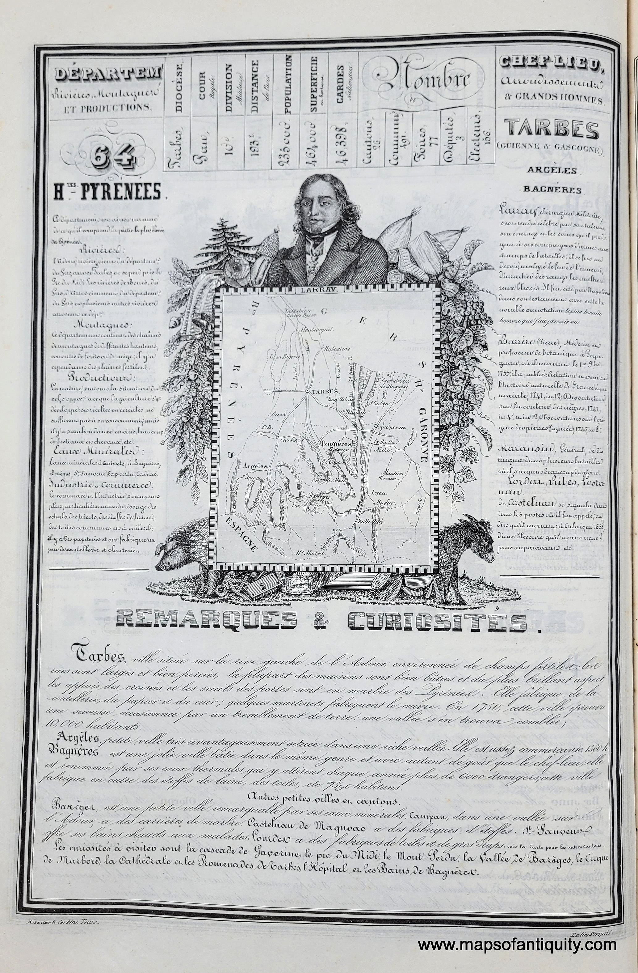 Antique double-sided page with maps of the Departments of Pyrénées-Atlantiques and Hautes-Pyrénées, France, published in the Nouvelle Geographie Et Statistique De La France, Alger Et La Belgique, Suivie D'Un Traite Sur Le Monde Entier... 1842 (5th edition) by Alexandre Corbin. This charming page features text relating to the statistics of the Department, including rivers, mountains, industries, notable residents, and "remarks & curiosities" as well as a small map of the region surrounded by illustrations of the local products and one notable/historical personage (Henry IV in Pyrénées-Atlantiques and Dominique-Jean Larrey in Hautes-Pyrénées). Very good antique condition with some minor stains in the margins. Paper is lightweight and the image/text on verso is slightly visible but this can be reduced by backing with a black backing when framing. Measures approx. 13.5 x 9.5 inches to the neatline.