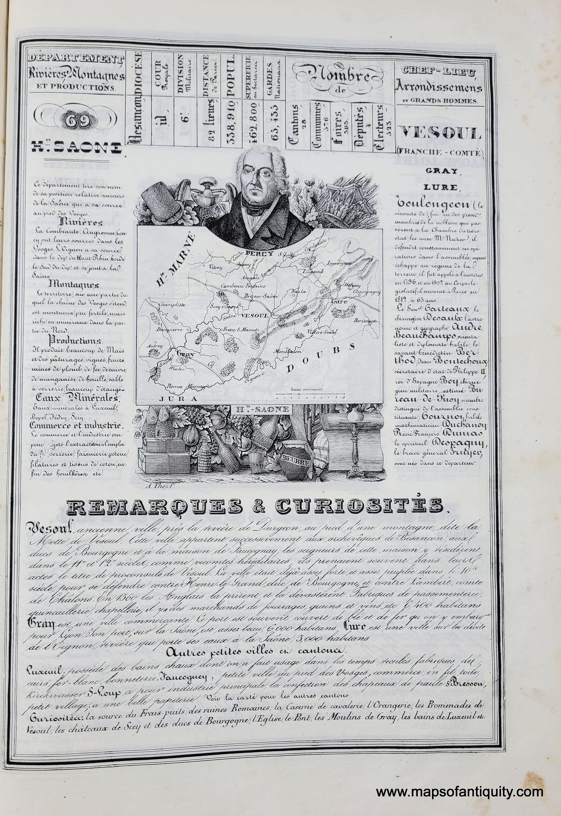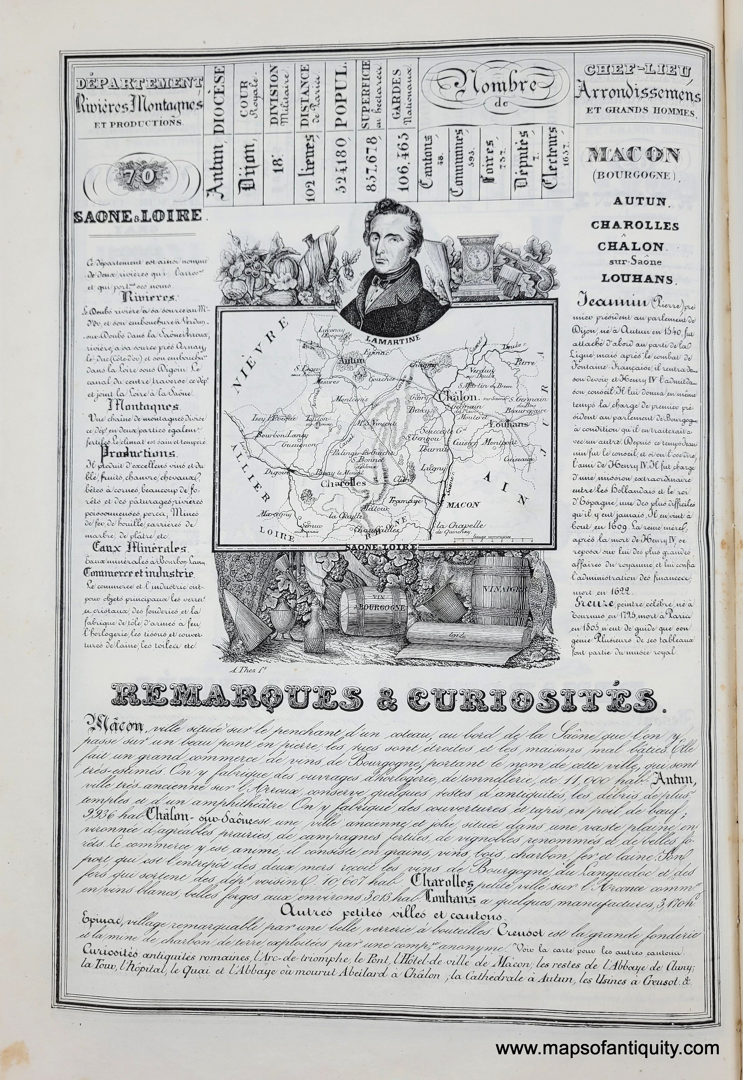 Antique double-sided page with maps of the Departments of Haute-Saone and Saone-et-Loire, France, published in the Nouvelle Geographie Et Statistique De La France, Alger Et La Belgique, Suivie D'Un Traite Sur Le Monde Entier... 1842 (5th edition) by Alexandre Corbin. This charming page features text relating to the statistics of the Department, including rivers, mountains, industries, notable residents, and "remarks & curiosities" as well as a small map of the region surrounded by illustrations of the local products and one notable/historical personage (Percy in Haute-Saone and Lamartine in Saone-et-Loire). Very good antique condition with some minor stains in the margins. Paper is lightweight and the image/text on verso is slightly visible but this can be reduced by backing with a black backing when framing. Measures approx. 13.5 x 9.5 inches to the neatline.