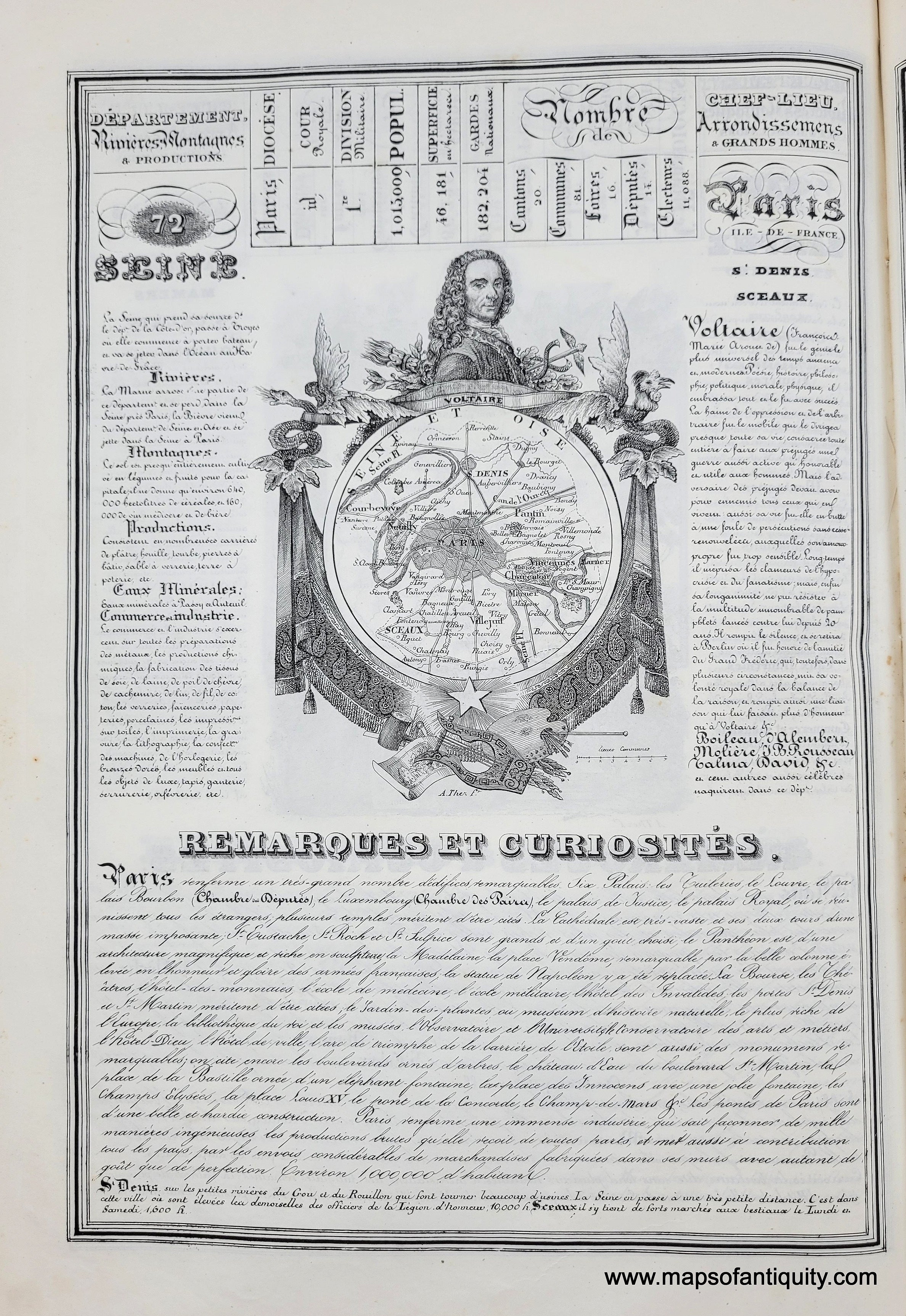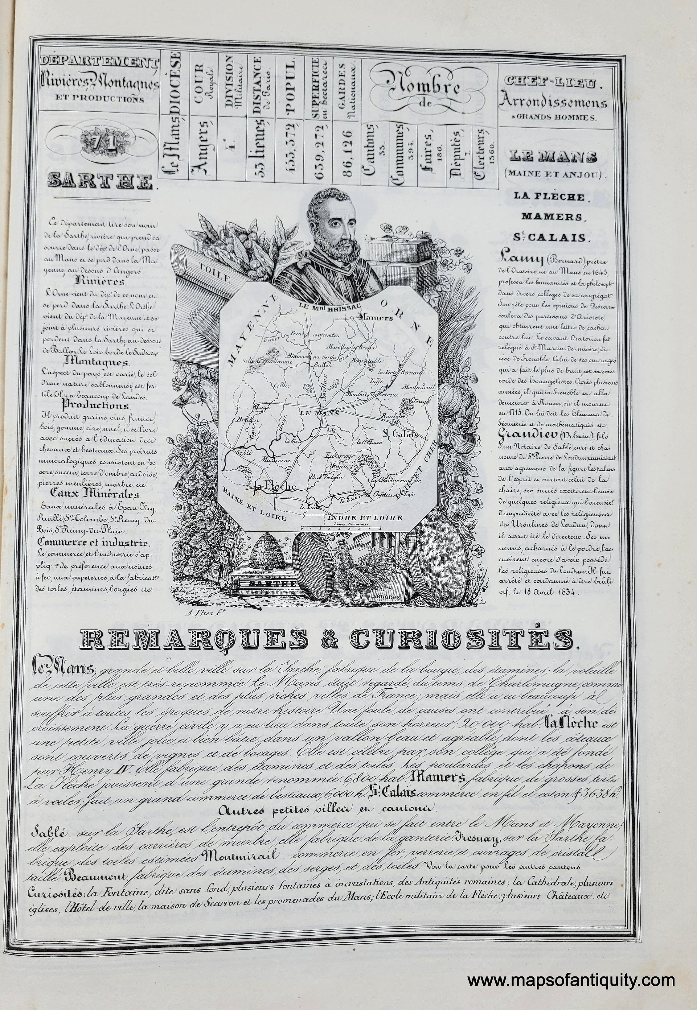 Antique double-sided page with maps of the Departments of Sarthe and Seine (Paris & vicinity), France, published in the Nouvelle Geographie Et Statistique De La France, Alger Et La Belgique, Suivie D'Un Traite Sur Le Monde Entier... 1842 (5th edition) by Alexandre Corbin. This charming page features text relating to the statistics of the Department, including rivers, mountains, industries, notable residents, and "remarks & curiosities" as well as a small map of the region surrounded by illustrations of the local products and one notable/historical personage (Le Marshal Brissac in Sarthe and Voltaire in Seine). Very good antique condition with some minor stains in the margins. Paper is lightweight and the image/text on verso is slightly visible but this can be reduced by backing with a black backing when framing. Measures approx. 13.5 x 9.5 inches to the neatline.