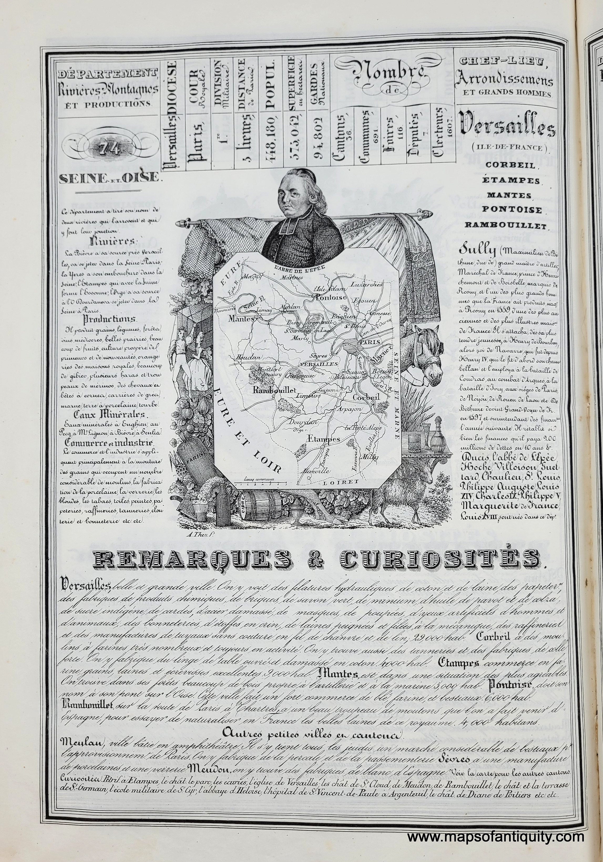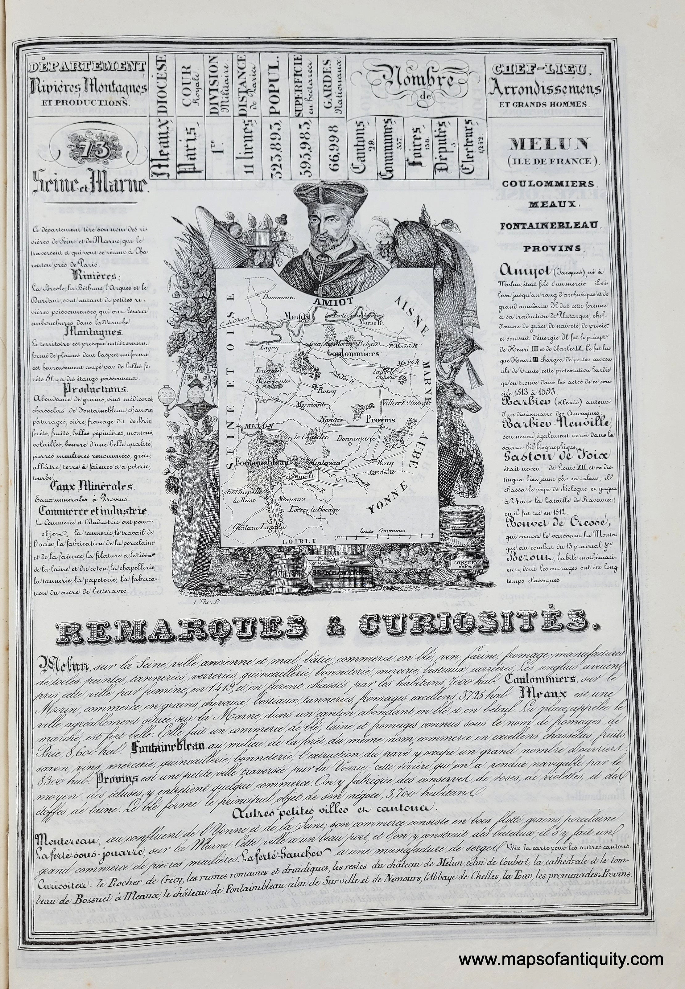 Antique double-sided page with maps of the Departments of Seine-et-Marne and Seine-et-Oise [the area around Paris], France, published in the Nouvelle Geographie Et Statistique De La France, Alger Et La Belgique, Suivie D'Un Traite Sur Le Monde Entier... 1842 (5th edition) by Alexandre Corbin. This charming page features text relating to the statistics of the Department, including rivers, mountains, industries, notable residents, and "remarks & curiosities" as well as a small map of the region surrounded by illustrations of the local products and one notable/historical personage (Amiot in Seine-et-Marne and LAbbe de L'Epee in Seine-et-Oise). Very good antique condition with some minor stains in the margins. Paper is lightweight and the image/text on verso is slightly visible but this can be reduced by backing with a black backing when framing. Measures approx. 13.5 x 9.5 inches to the neatline.