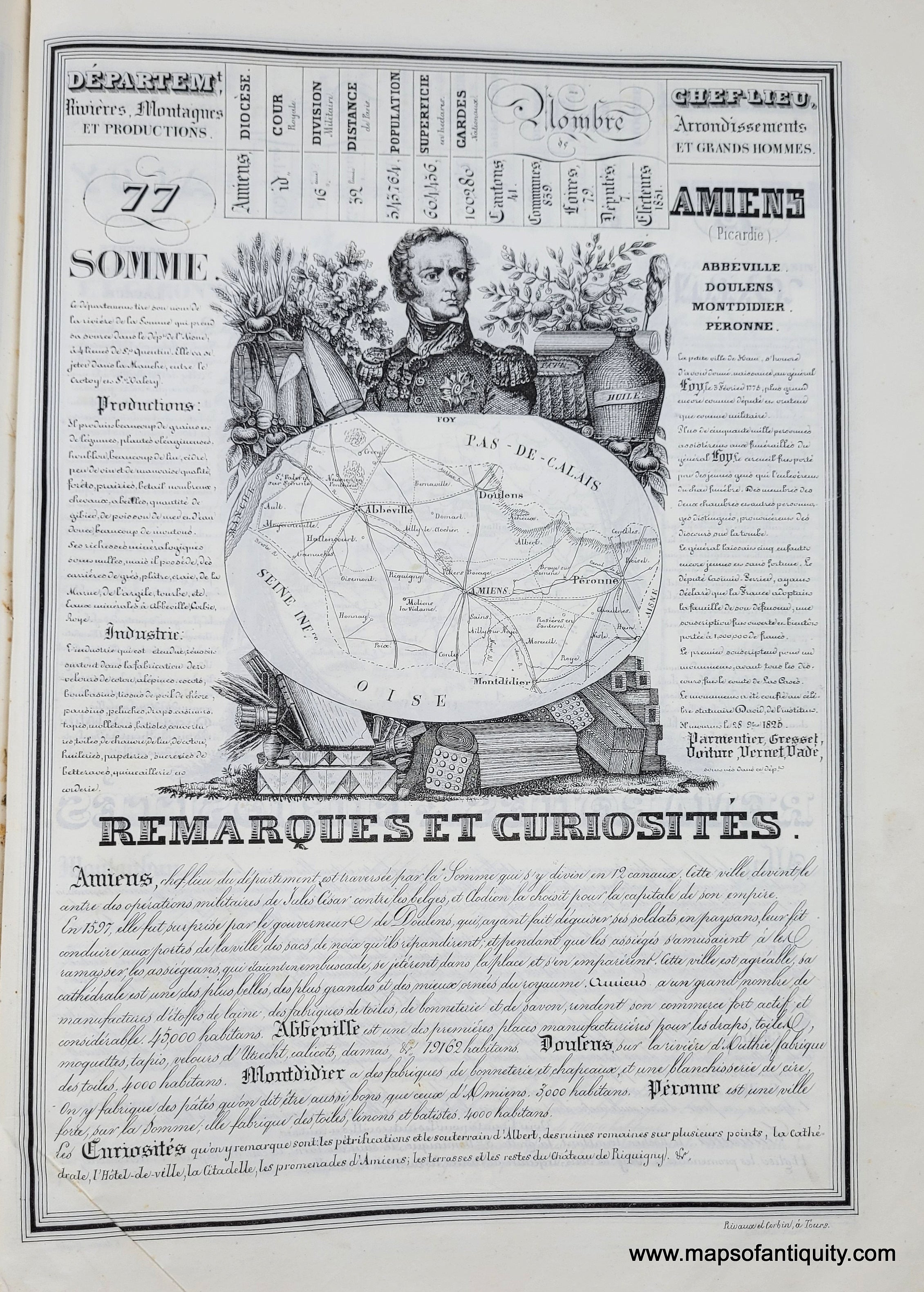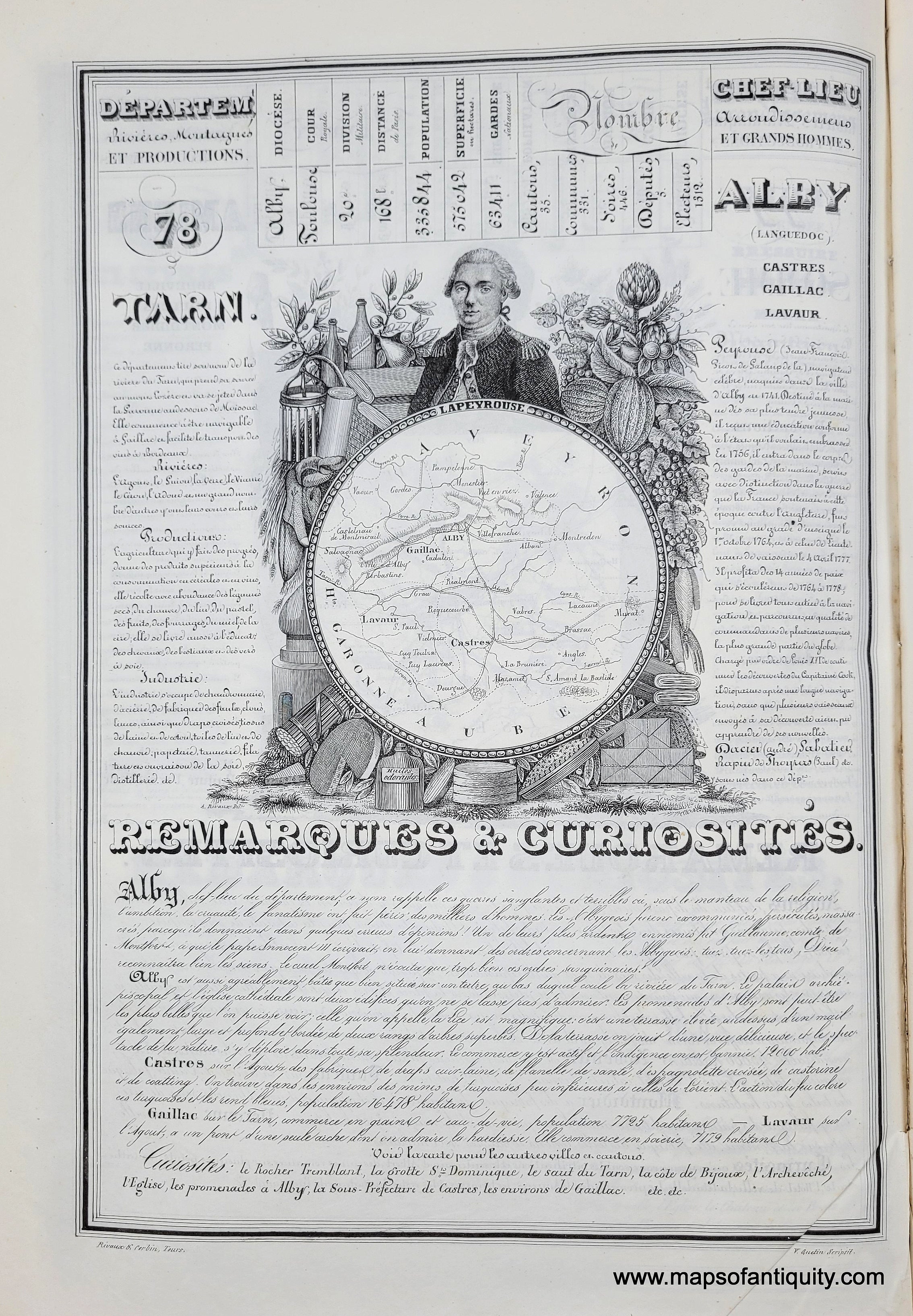 Antique double-sided page with maps of the Departments of Somme and Tarn, France, published in the Nouvelle Geographie Et Statistique De La France, Alger Et La Belgique, Suivie D'Un Traite Sur Le Monde Entier... 1842 (5th edition) by Alexandre Corbin. This charming page features text relating to the statistics of the Department, including rivers, mountains, industries, notable residents, and "remarks & curiosities" as well as a small map of the region surrounded by illustrations of the local products and one notable/historical personage (Foy in Somme and Lapeyrouse in Tarn). Very good antique condition with some minor stains in the margins. Paper is lightweight and the image/text on verso is slightly visible but this can be reduced by backing with a black backing when framing. Measures approx. 13.5 x 9.5 inches to the neatline.